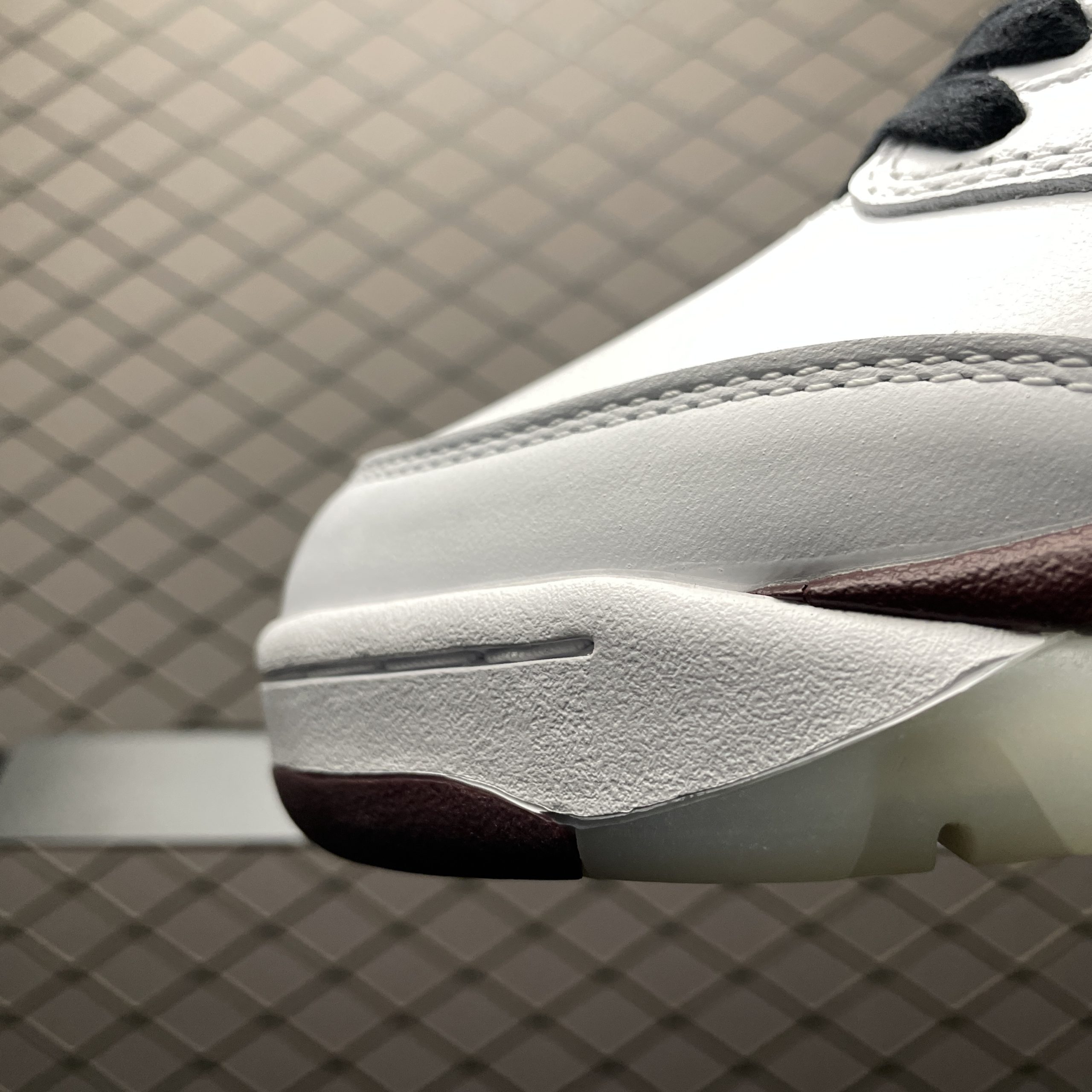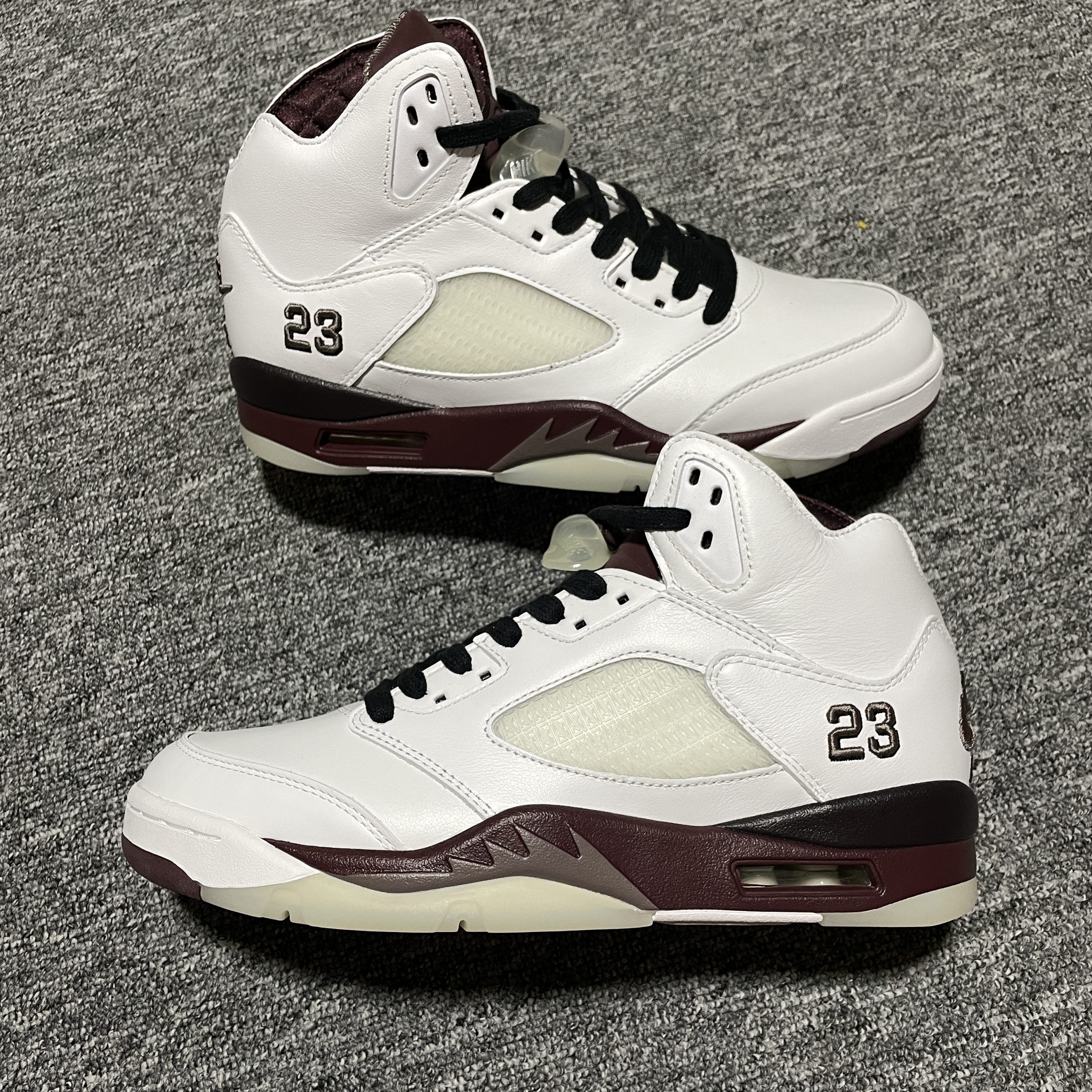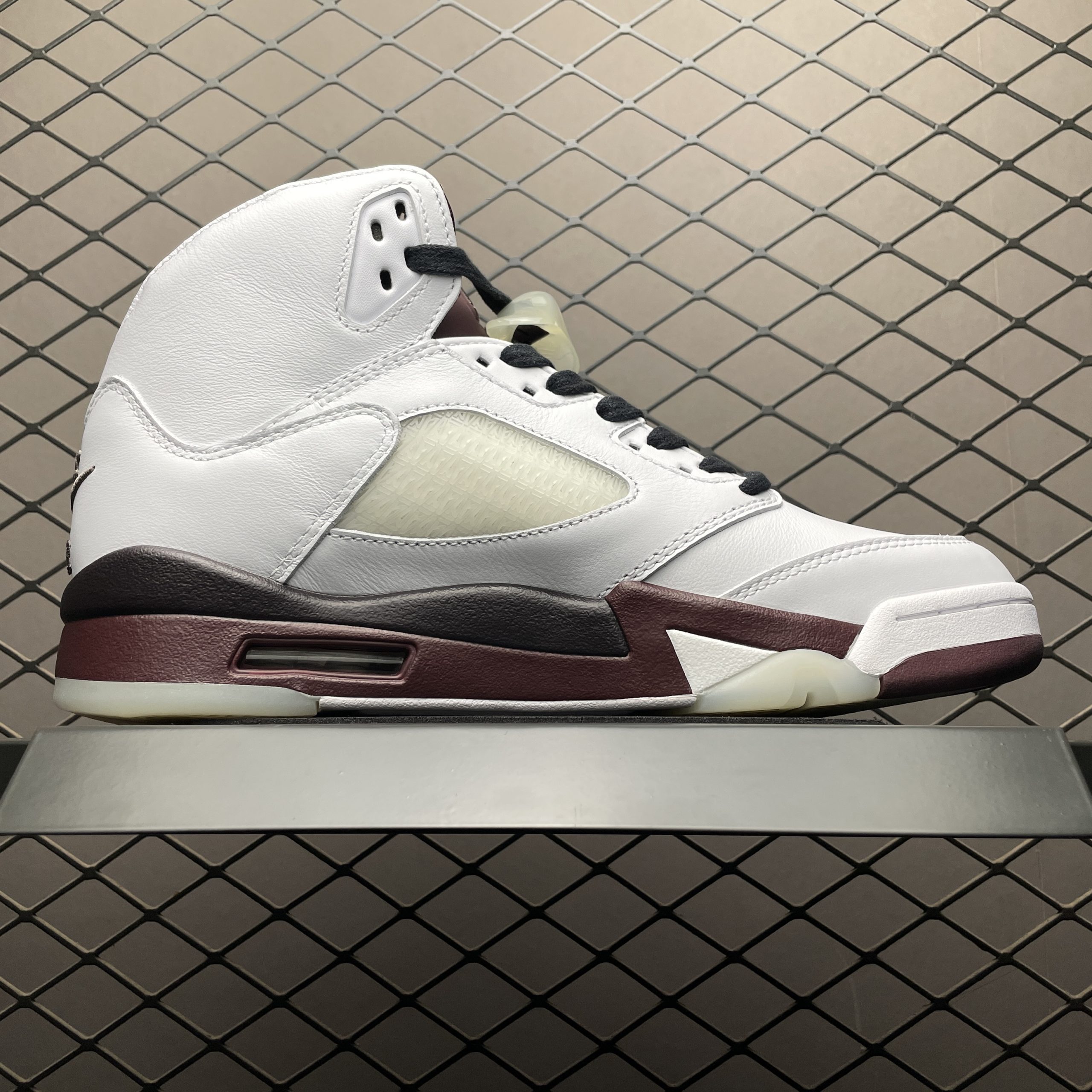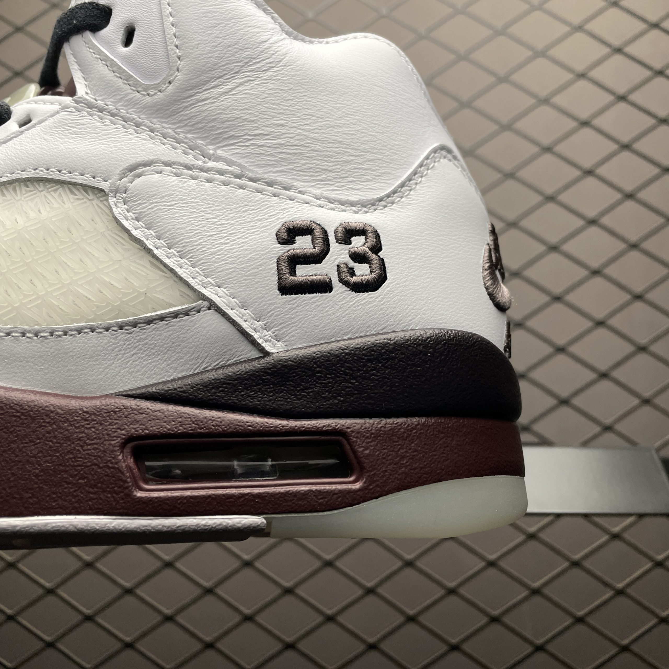 La tige de la chaussure est confectionnée en cuir de haute qualité, offrant à la fois durabilité et confort. Le cuir bordeaux est complété par des accents en daim, ajoutant une texture luxueuse et un contraste visuel intéressant. Les détails signature de la Jordan 5, tels que les œillets en plastique translucide et le filet latéral, sont présents, mais subtilement intégrés pour ne pas détourner l’attention de l’esthétique générale.