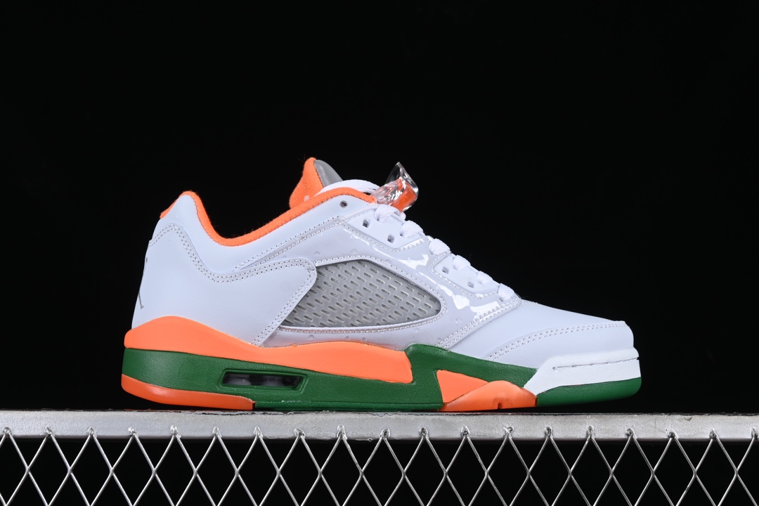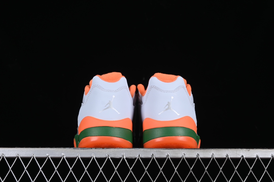 La Jordan 5 Retro Low « Miami Hurricanes » porte le numéro de modèle FQ1293-018 et est une édition spéciale inspirée par l’université de Miami. Cette sneaker arbore les couleurs de l’équipe de l’université, combinant principalement des tons de vert et d’orange, qui sont les couleurs officielles des Miami Hurricanes.