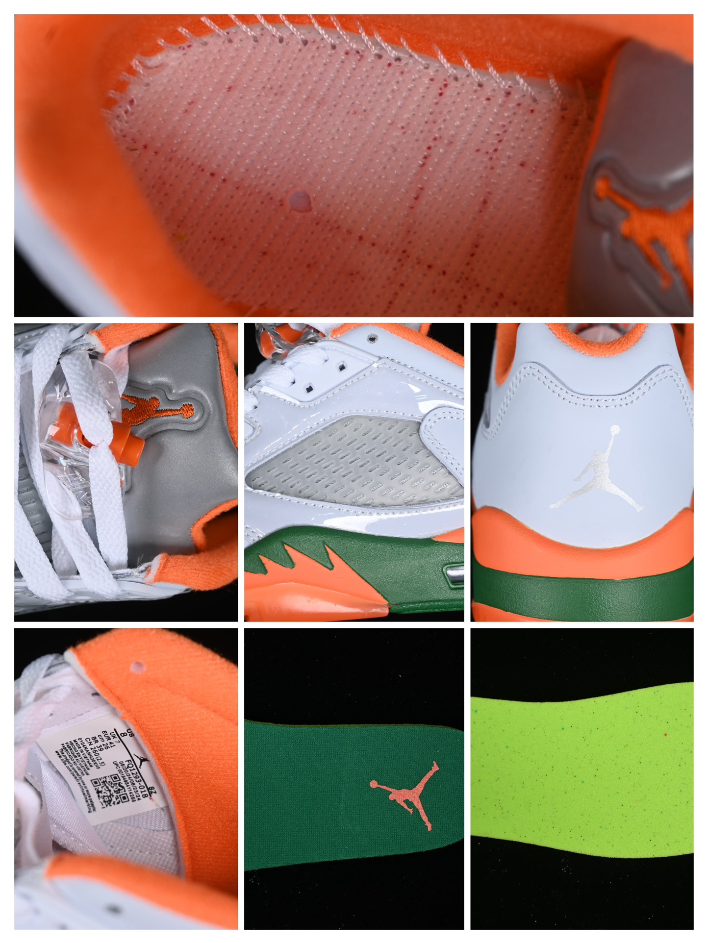 Un des détails emblématiques de ce modèle est la languette réfléchissante argentée, qui est une caractéristique classique des Jordan 5. Cette languette ajoute un élément distinctif qui capte la lumière et attire l’attention. De plus, le logo de l’université de Miami est présent sur le talon de la chaussure, affirmant ainsi l’association avec les Hurricanes.