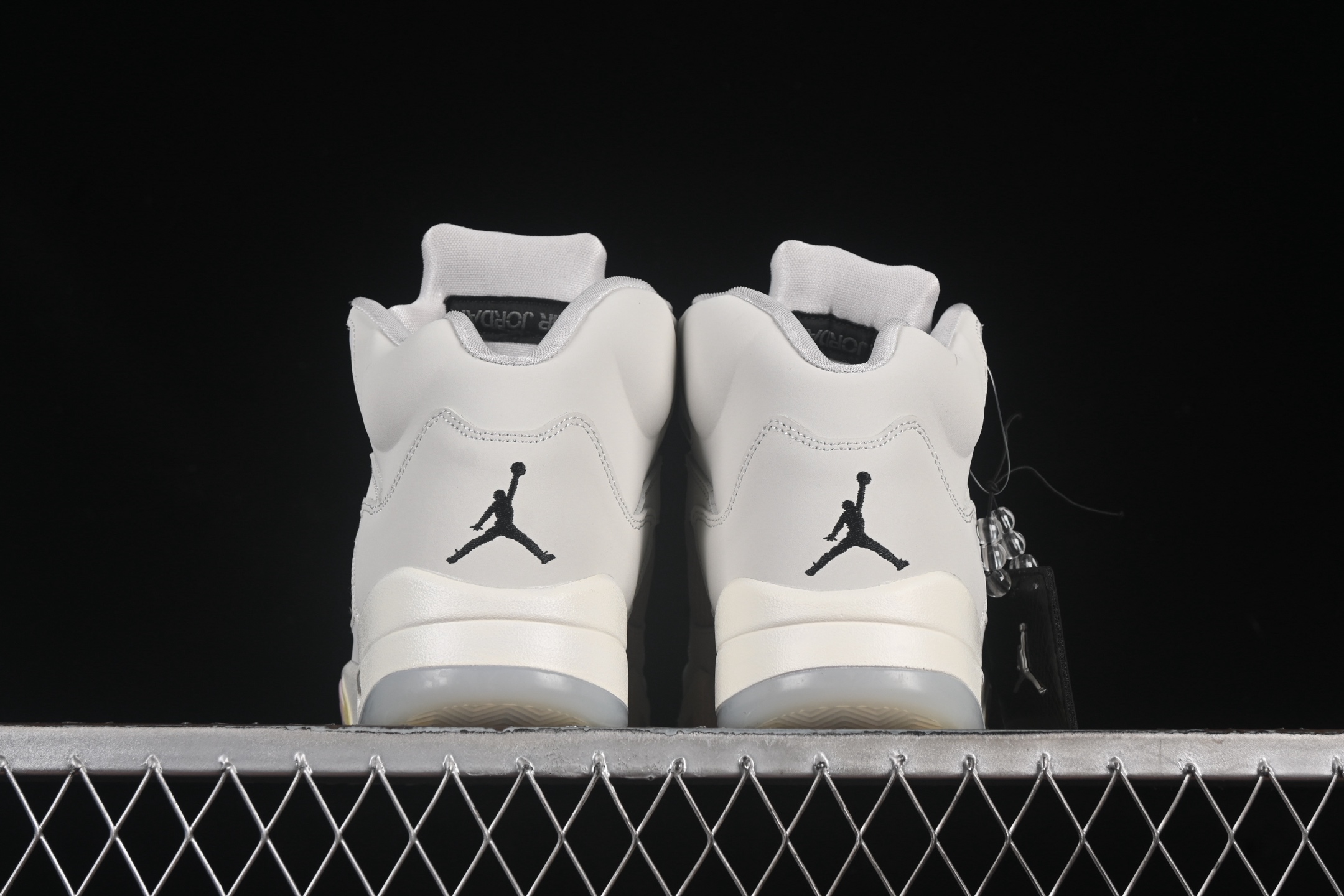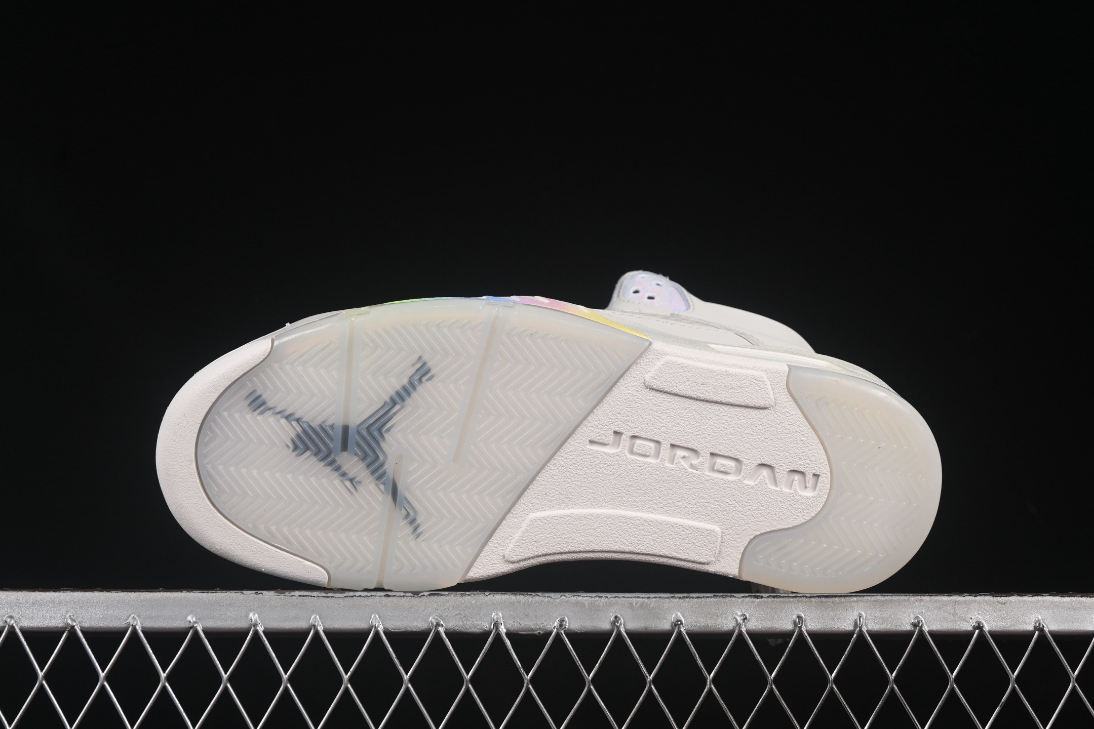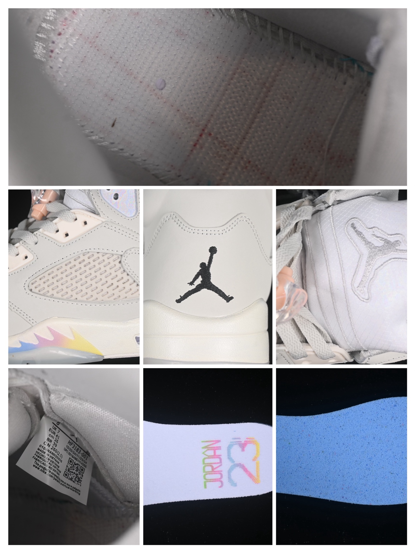 Les détails supplémentaires incluent des œillets en plastique renforcé et une semelle extérieure en caoutchouc translucide, qui non seulement améliorent l’adhérence mais ajoutent également une dimension esthétique moderne. Le logo Jumpman, signature de la marque, est fièrement affiché sur la languette et le talon, soulignant l’authenticité et le prestige de cette édition limitée.