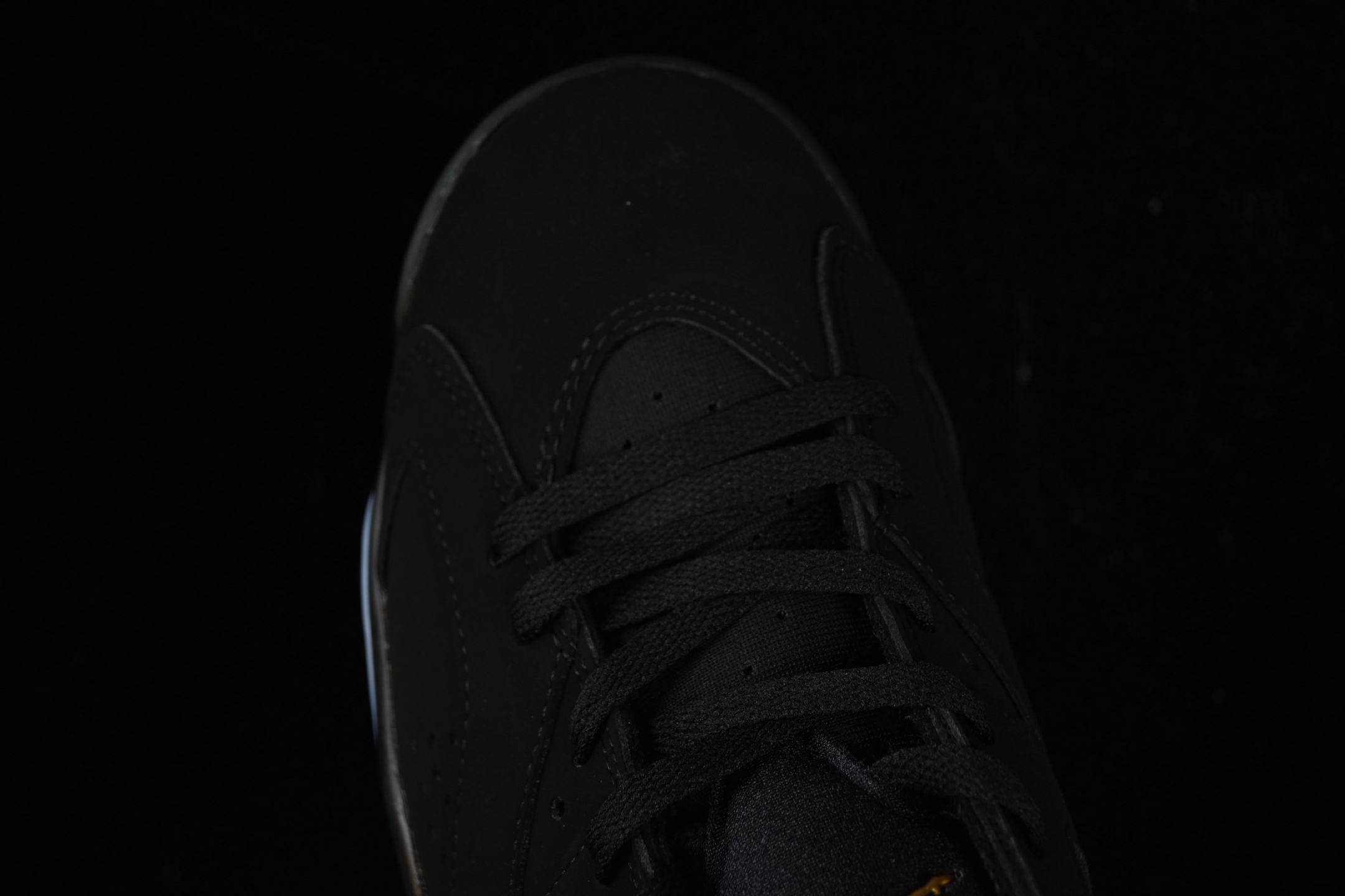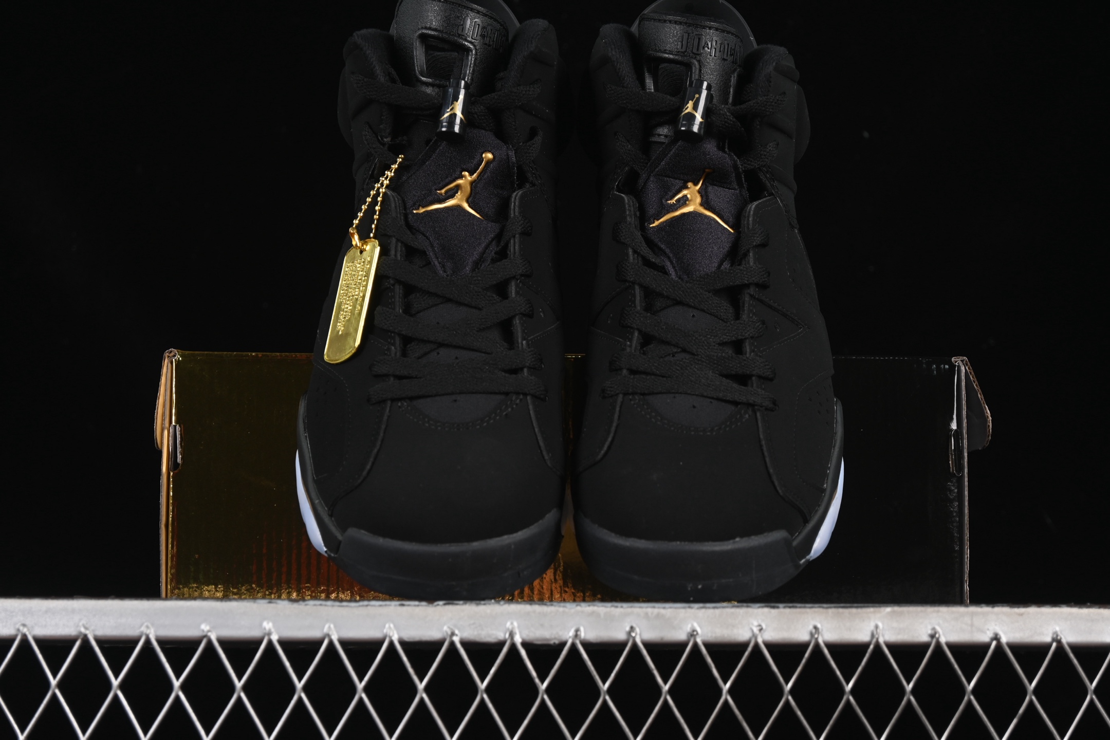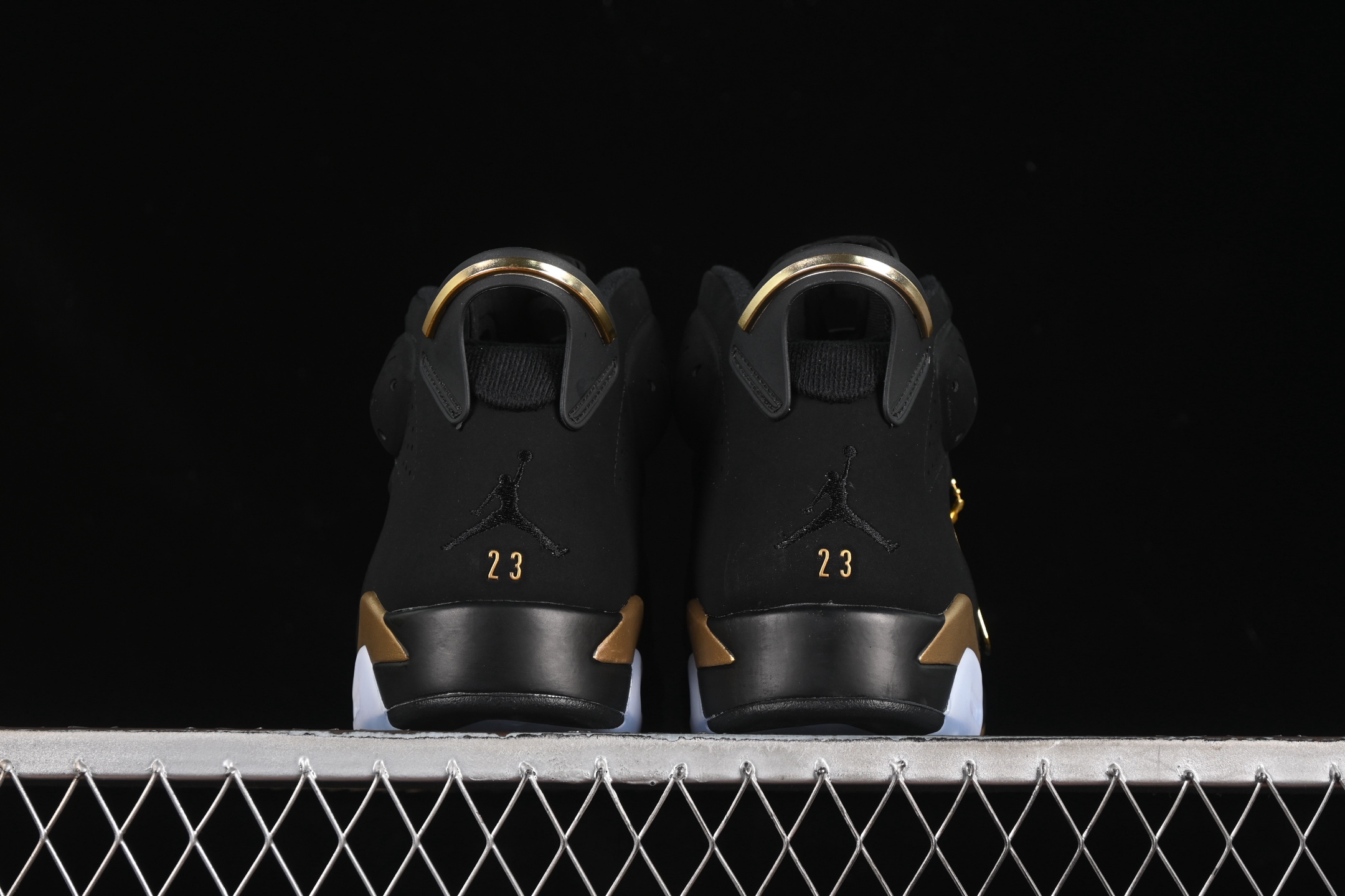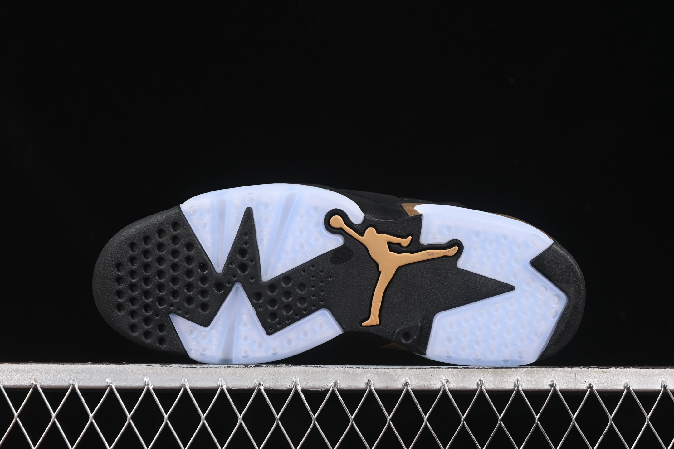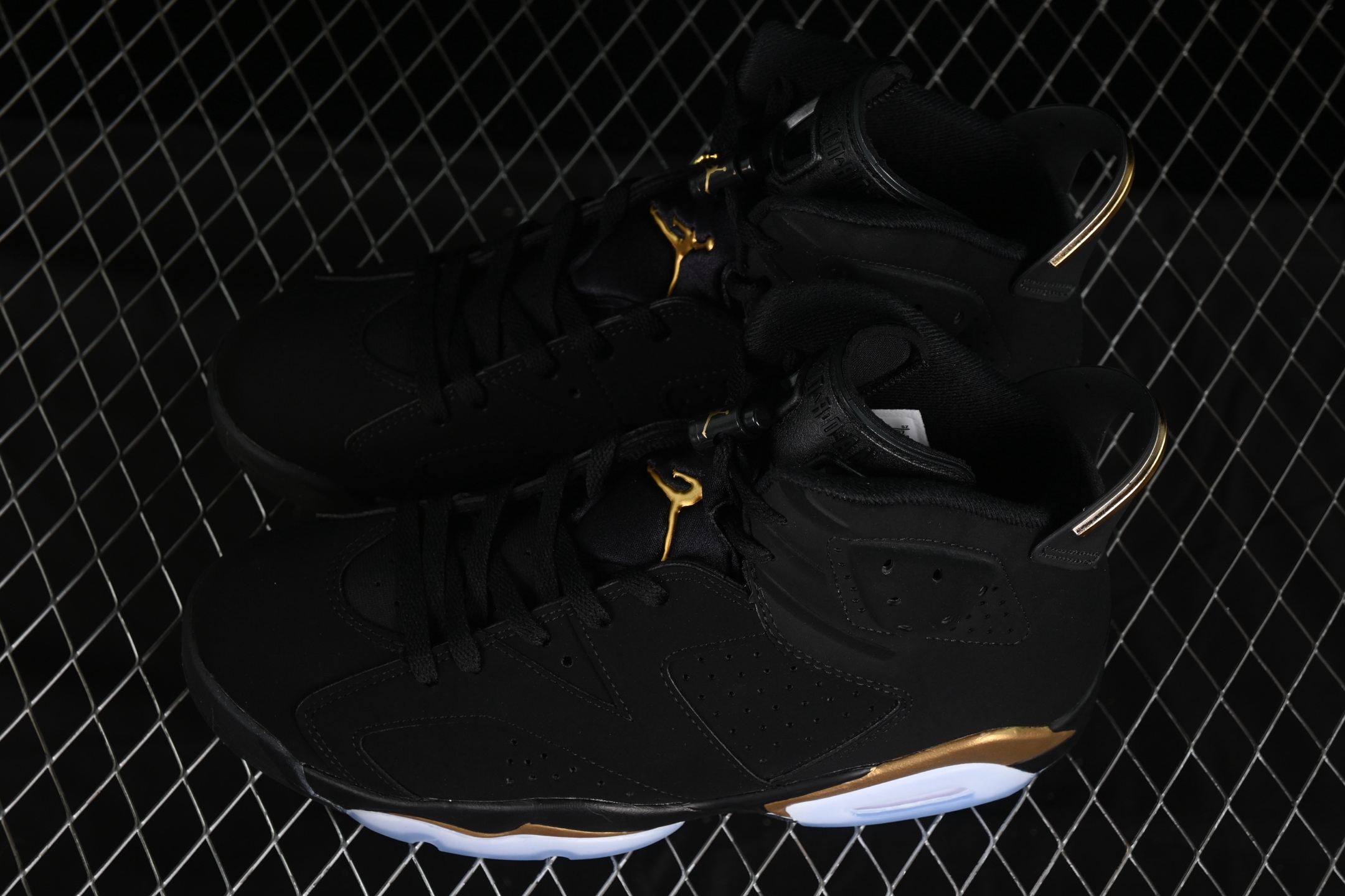 La chaussure arbore une tige en nubuck noir de haute qualité, offrant un look sobre et sophistiqué. Les accents dorés métalliques ajoutent une touche de luxe, notamment sur le talon, les œillets et le logo Jumpman, symbolisant le succès et la grandeur. La semelle intermédiaire noire est également rehaussée de touches dorées, créant un contraste visuel saisissant.