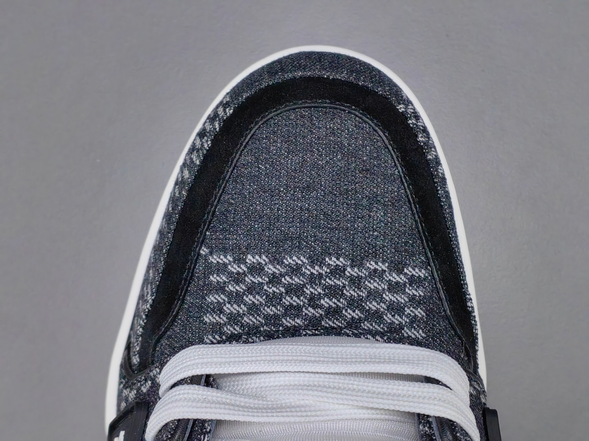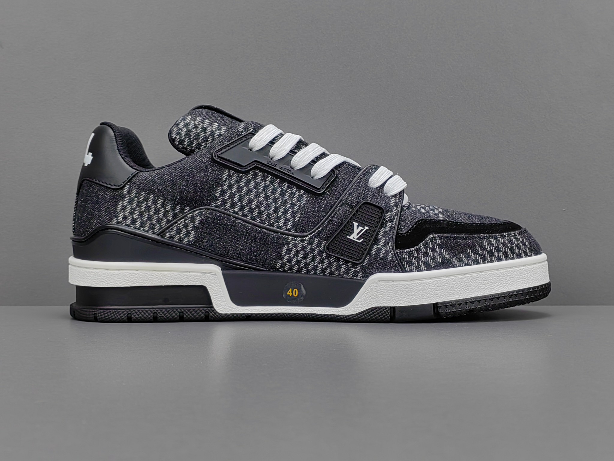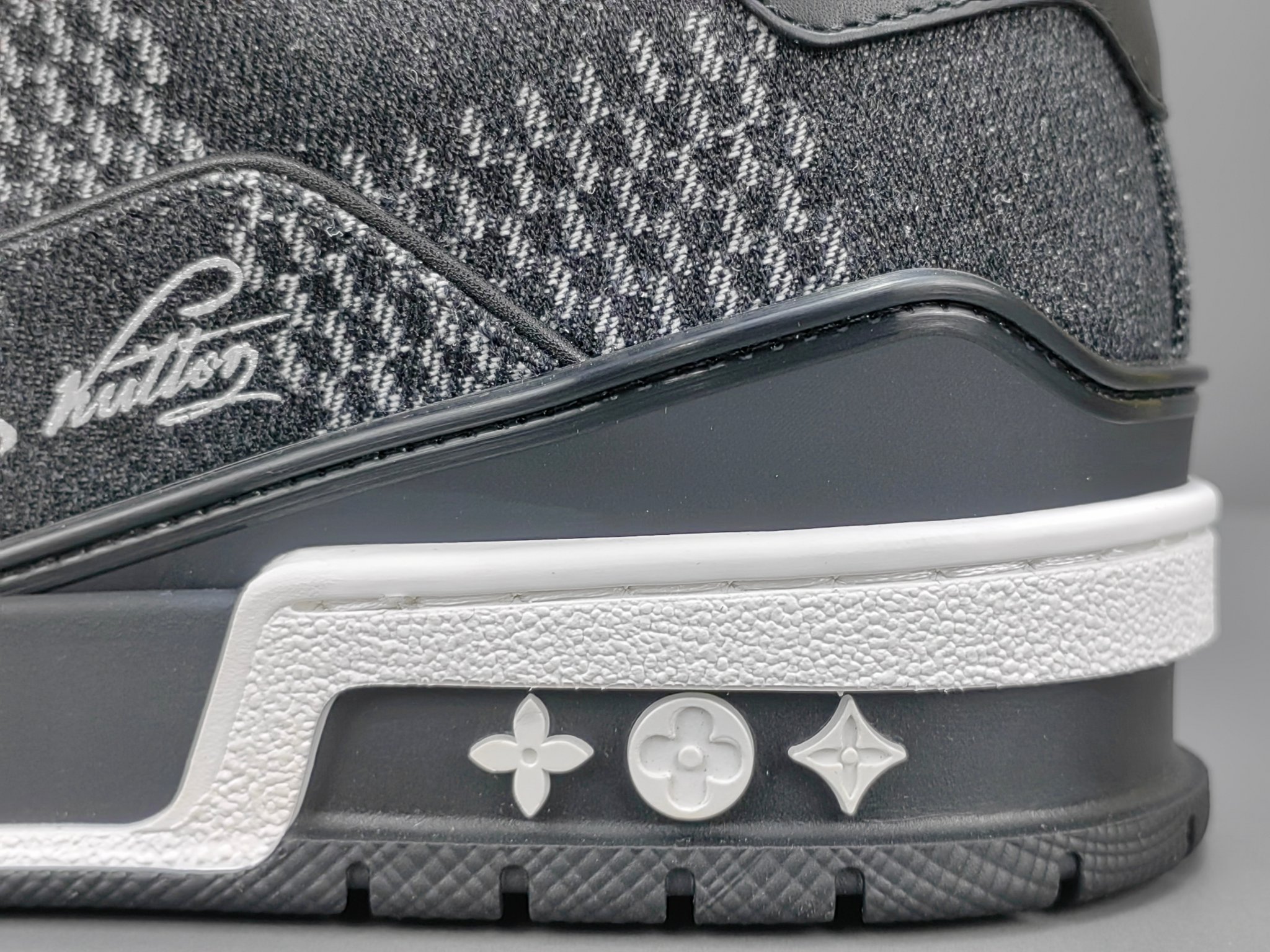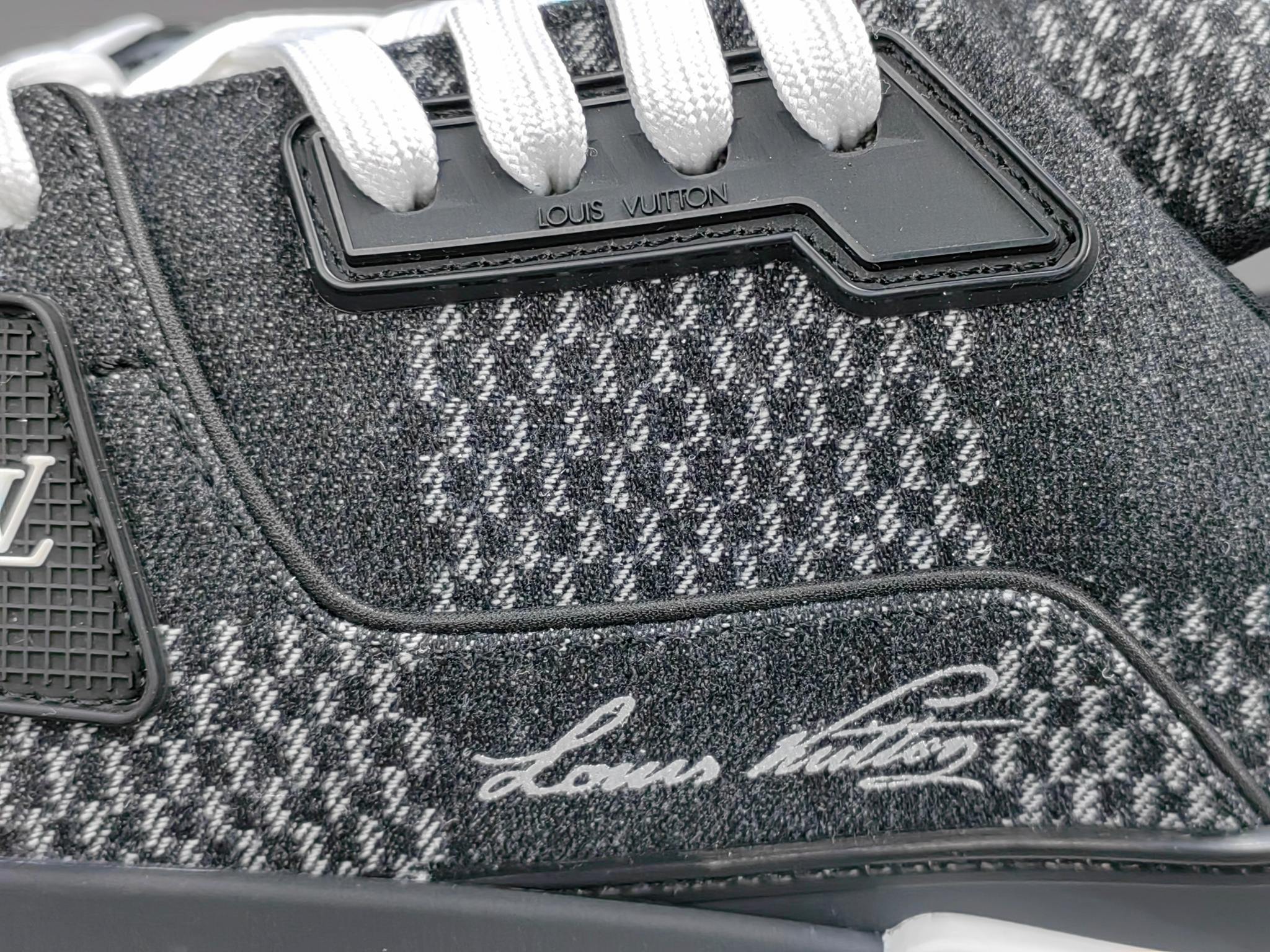 La tige de la sneaker est confectionnée en denim Damier 3D noir, un motif emblématique de Louis Vuitton revisité avec une texture tridimensionnelle qui apporte profondeur et caractère à la chaussure. Ce matériau innovant est non seulement esthétique, mais aussi résistant, garantissant une durabilité exceptionnelle.