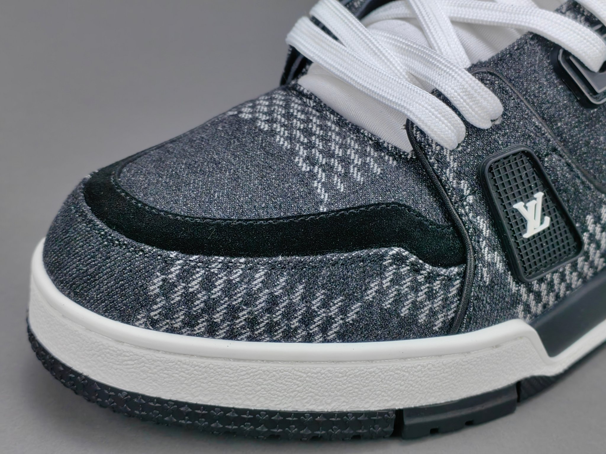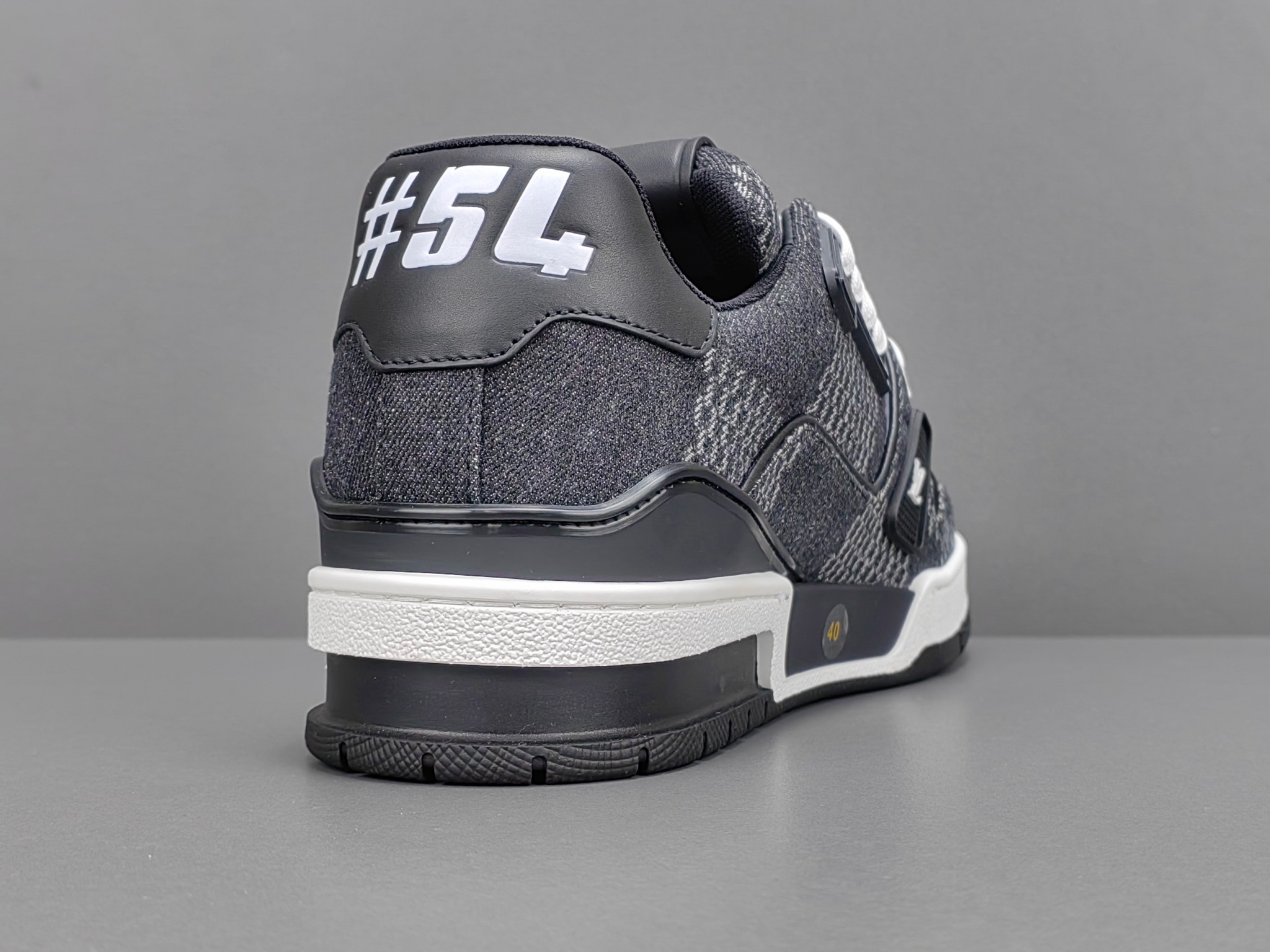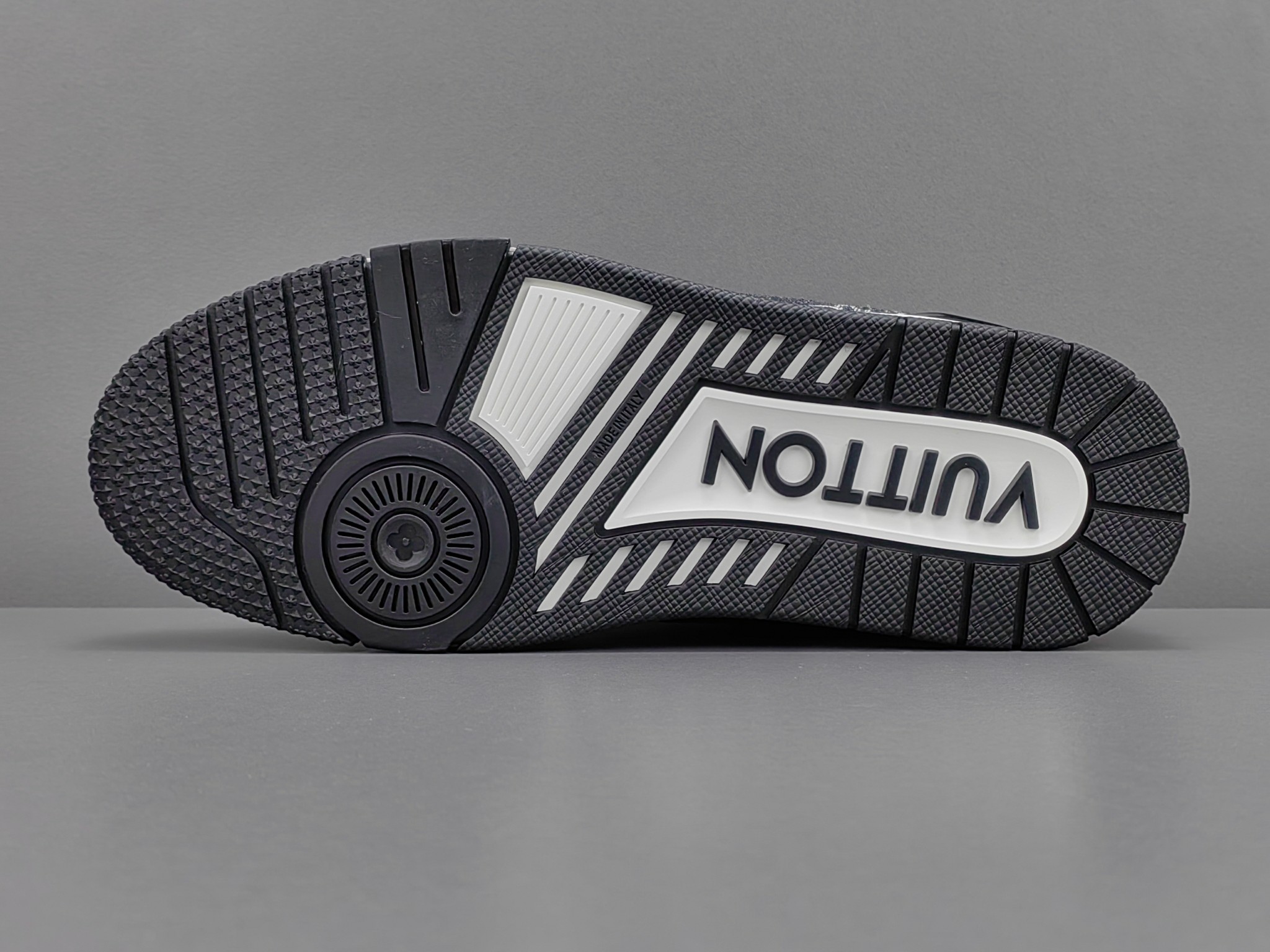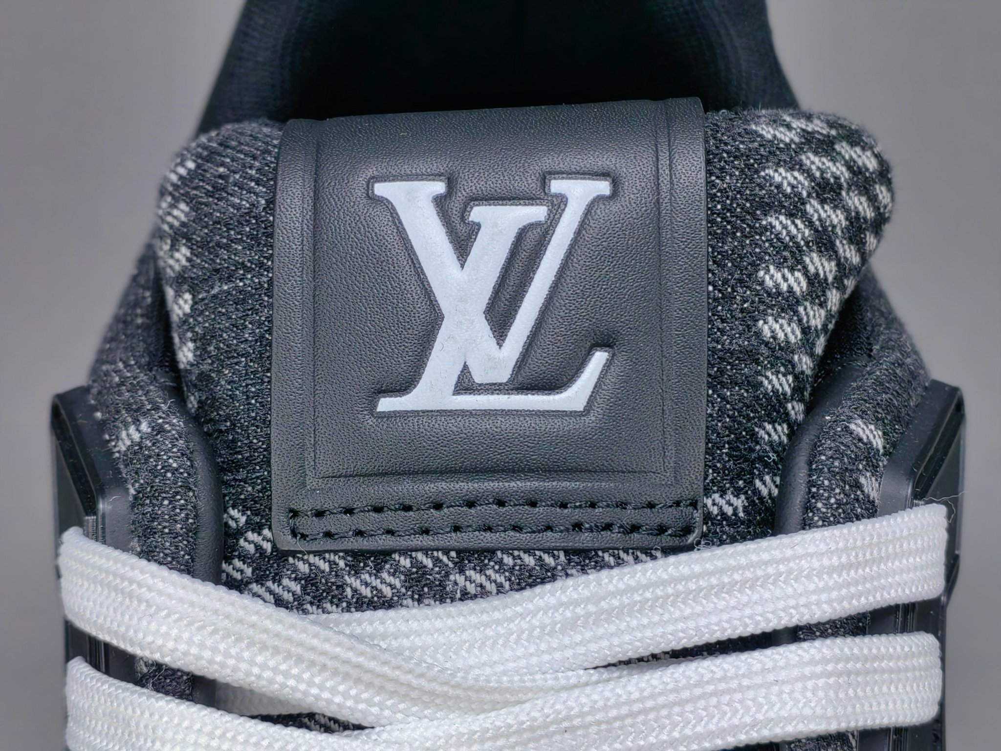 La tige de la sneaker est confectionnée en denim Damier 3D noir, un motif emblématique de Louis Vuitton revisité avec une texture tridimensionnelle qui apporte profondeur et caractère à la chaussure. Ce matériau innovant est non seulement esthétique, mais aussi résistant, garantissant une durabilité exceptionnelle.