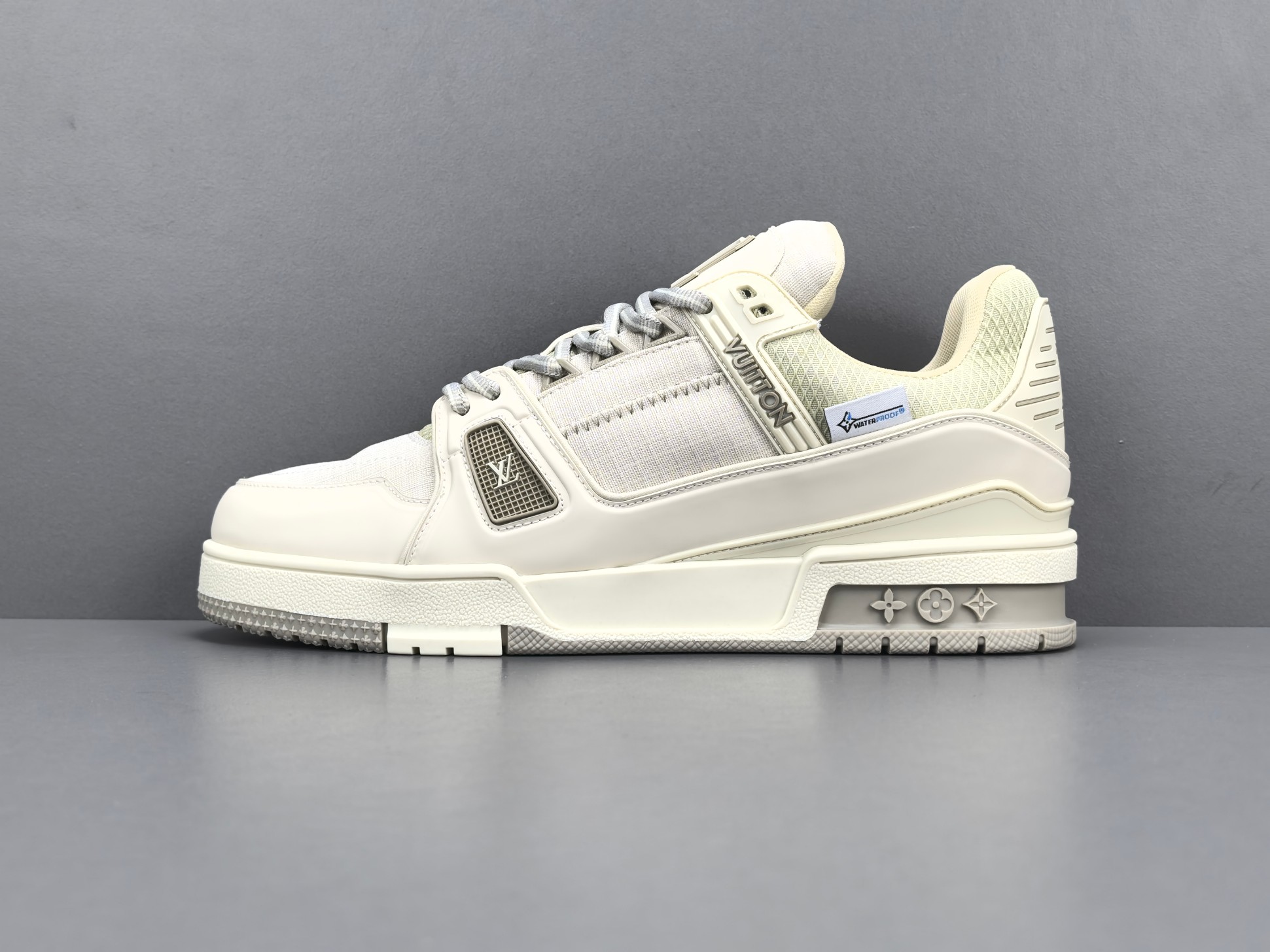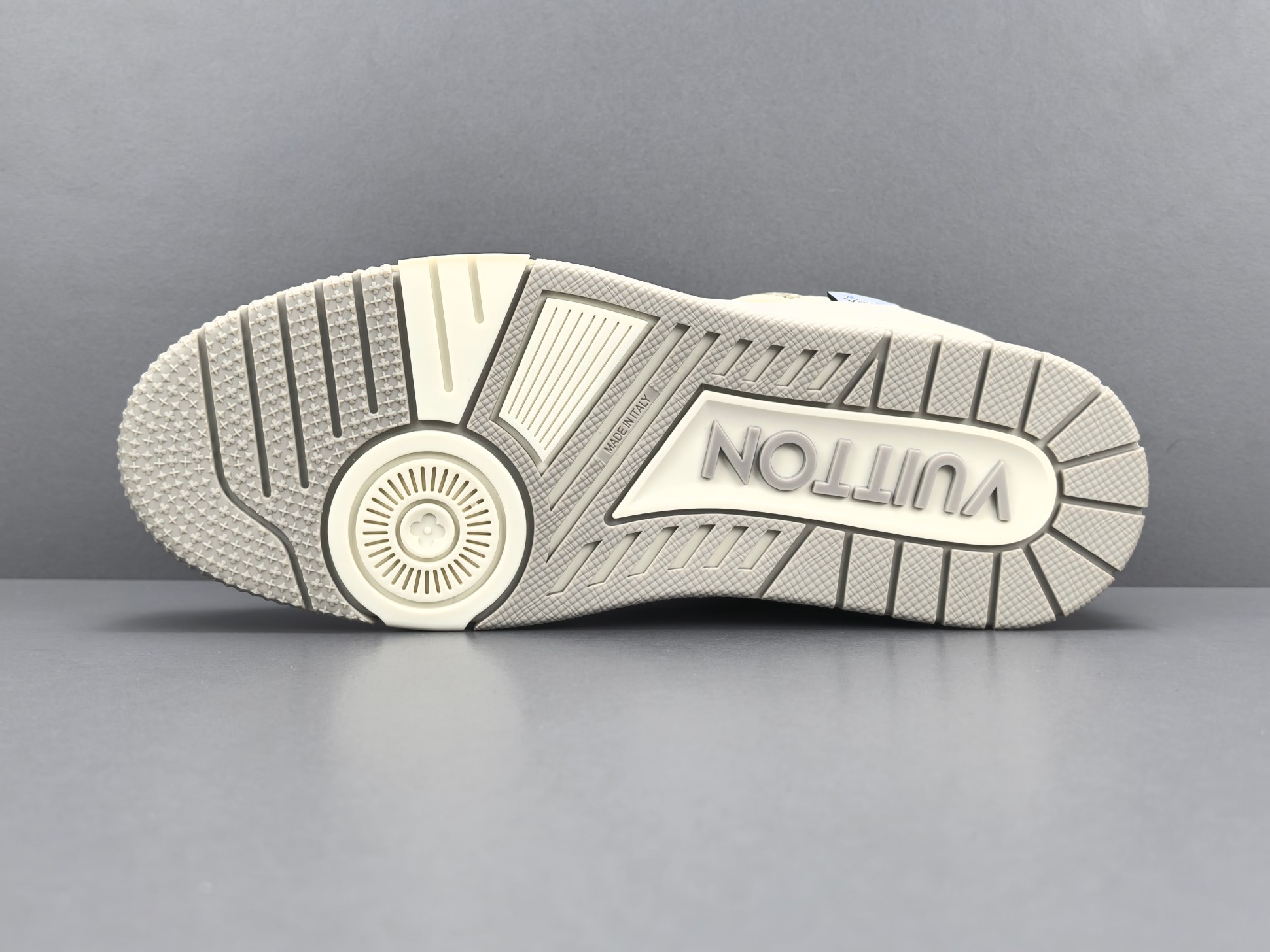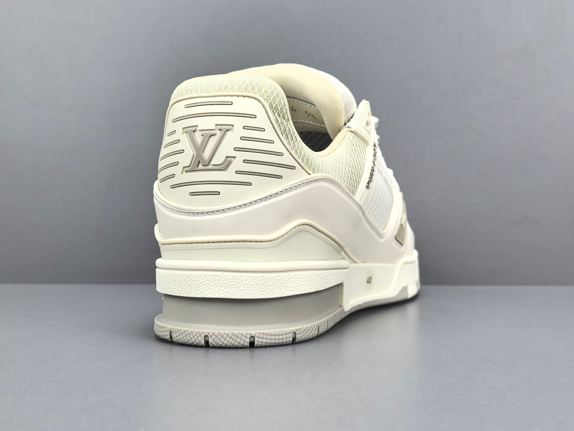 La tige de la sneaker est réalisée en cuir de veau de haute qualité, offrant à la fois durabilité et confort. La couleur grise dominante est subtilement rehaussée par des accents blancs et des détails en relief, ajoutant une dimension visuelle raffinée. Le logo emblématique de Louis Vuitton est discrètement embossé sur le côté, tandis que la signature « LV » est présente sur la languette et le talon, affirmant l’identité de la marque.
