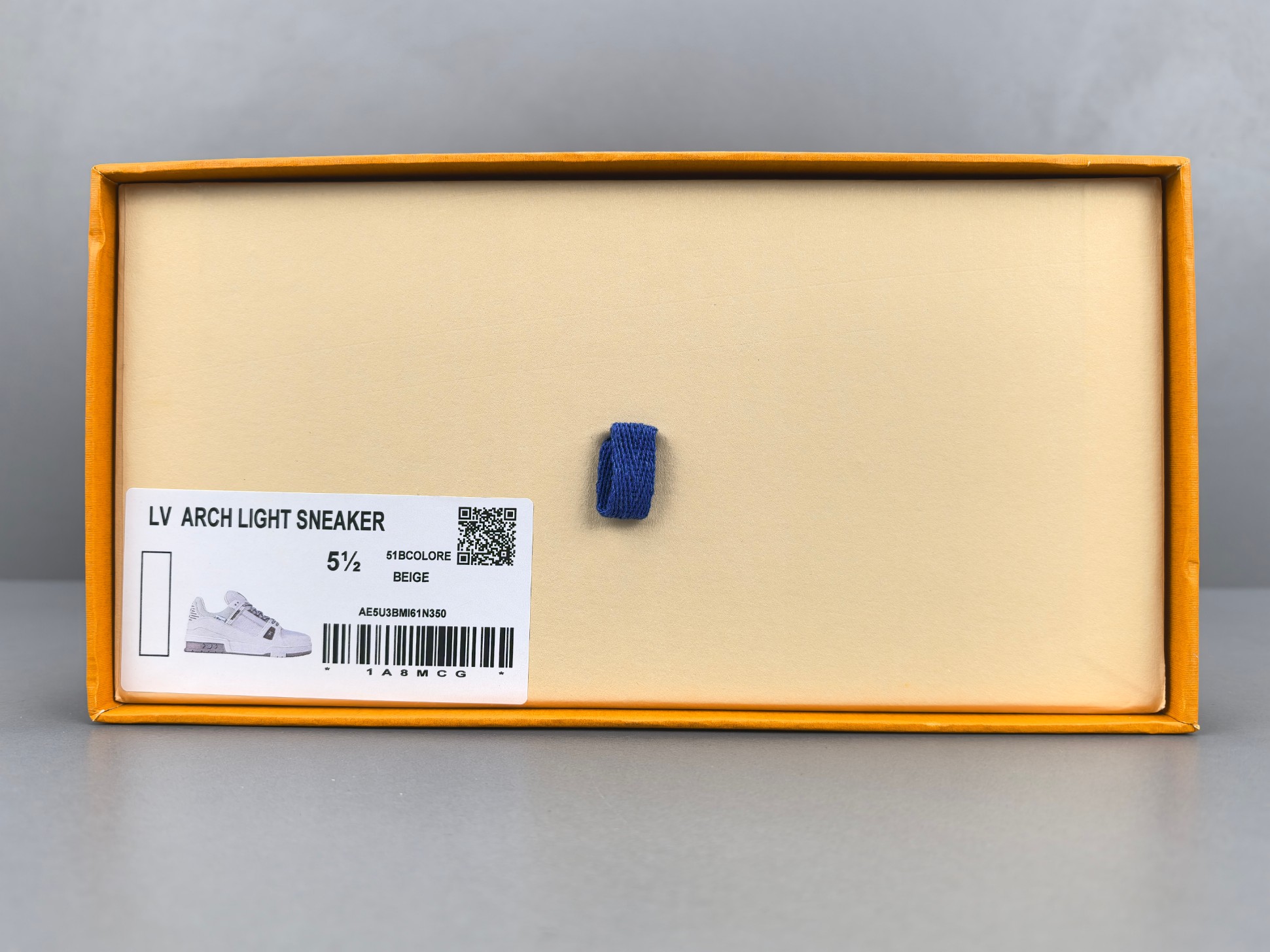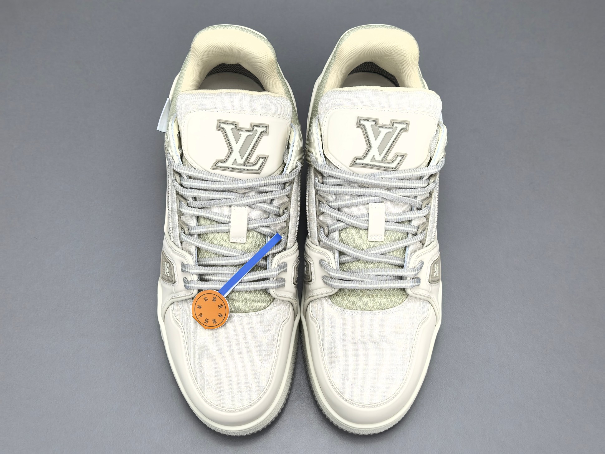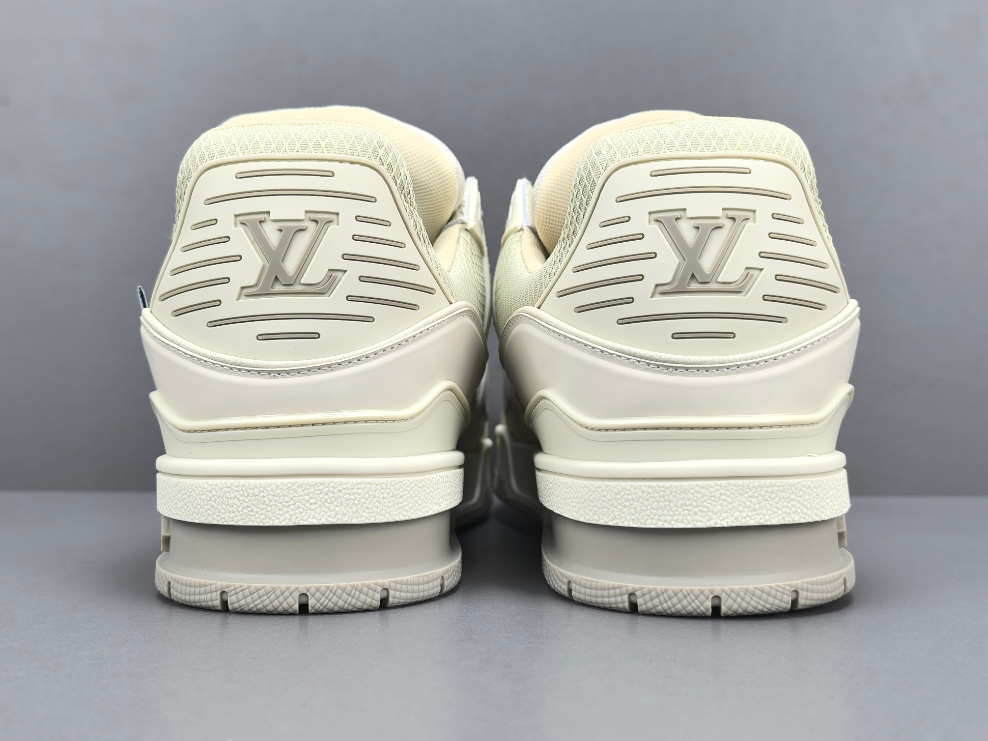 La tige de la sneaker est réalisée en cuir de veau de haute qualité, offrant à la fois durabilité et confort. La couleur grise dominante est subtilement rehaussée par des accents blancs et des détails en relief, ajoutant une dimension visuelle raffinée. Le logo emblématique de Louis Vuitton est discrètement embossé sur le côté, tandis que la signature « LV » est présente sur la languette et le talon, affirmant l’identité de la marque.