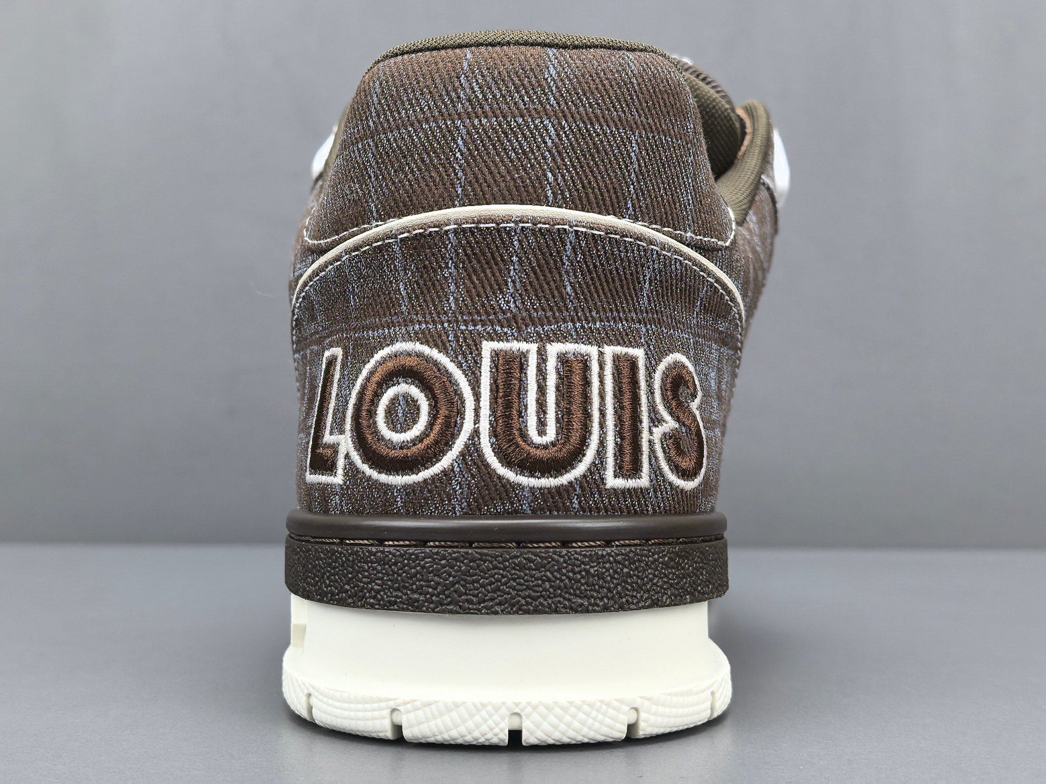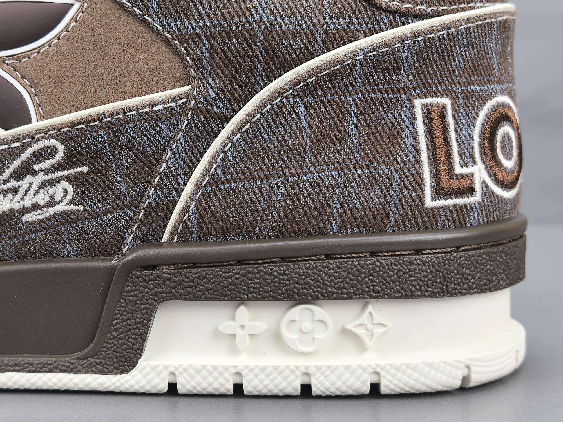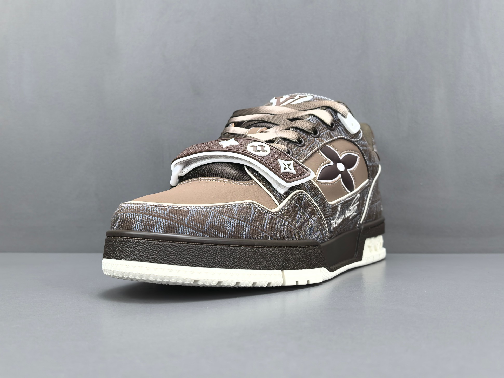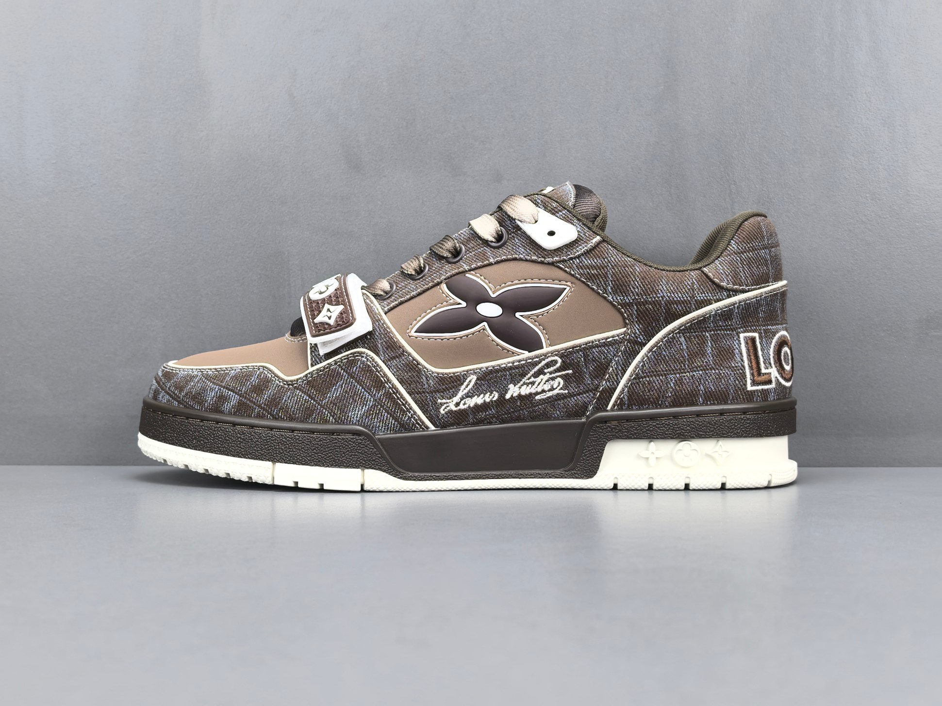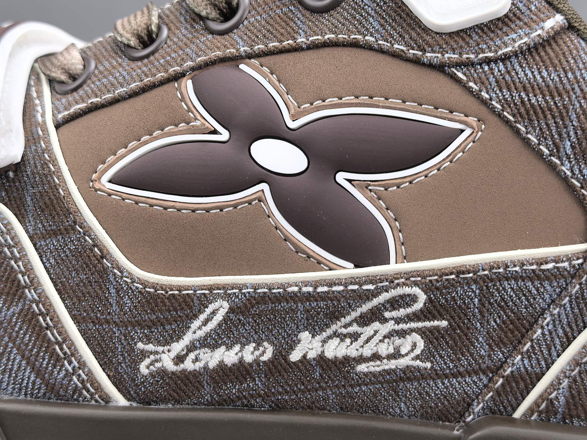 Les finitions sont impeccables, avec le logo emblématique de Louis Vuitton subtilement embossé sur le côté de la chaussure, ajoutant une signature discrète mais reconnaissable. Les lacets en coton ciré et les œillets métalliques complètent l’esthétique haut de gamme de cette sneaker.