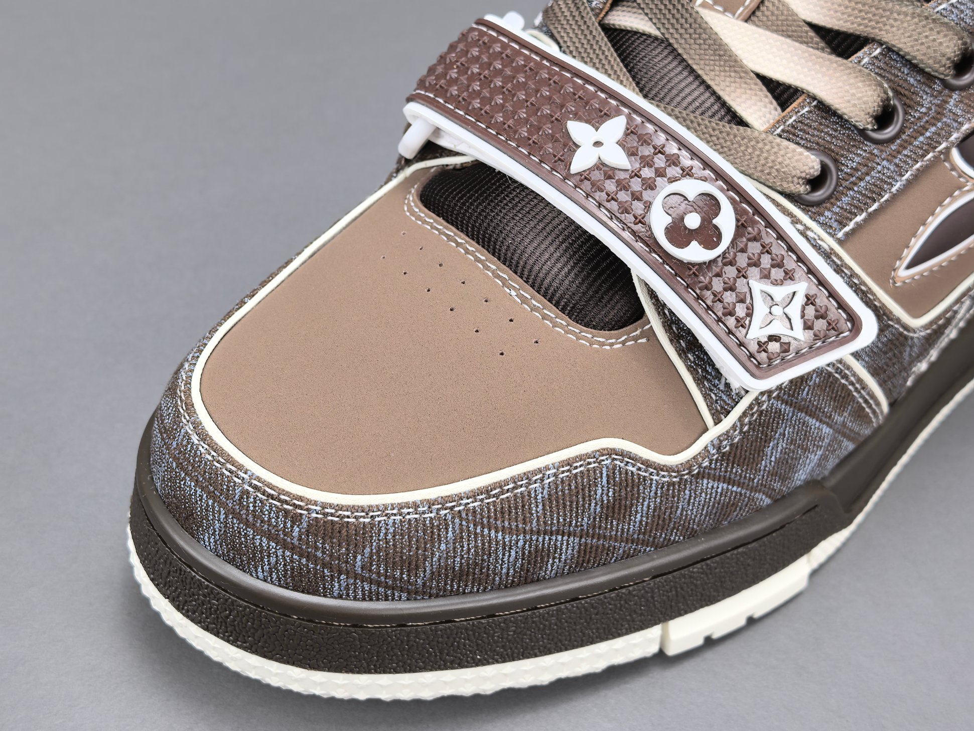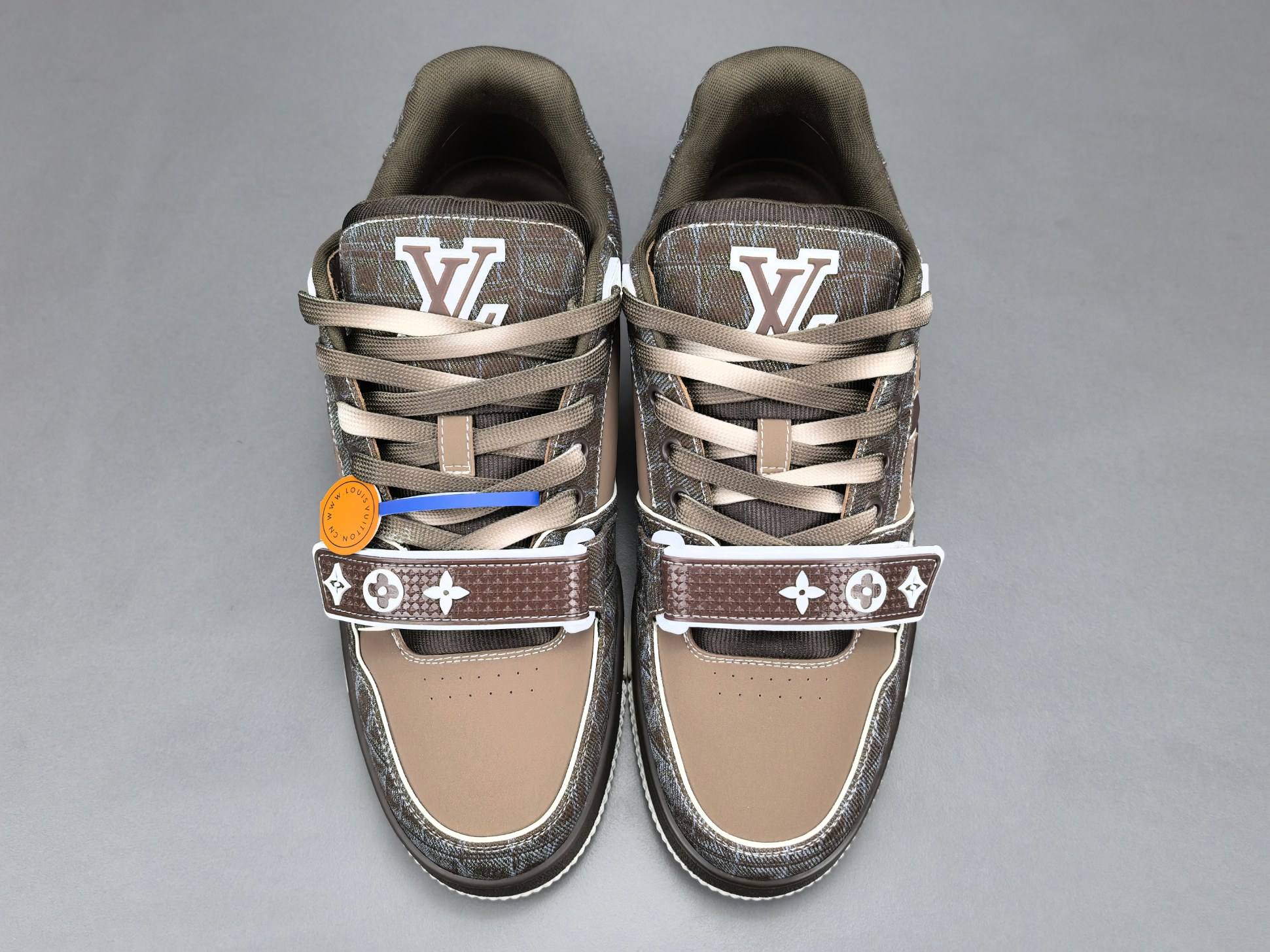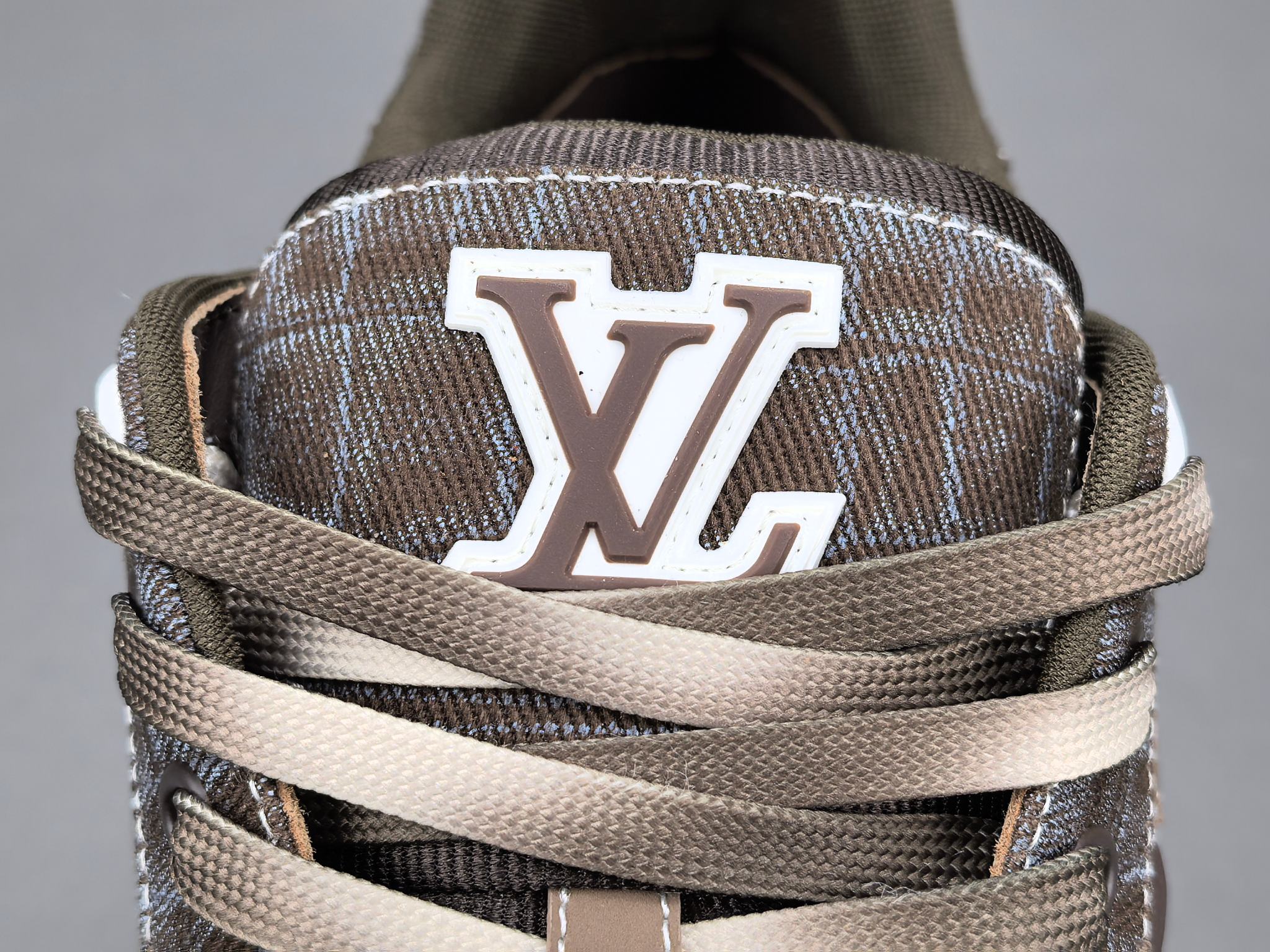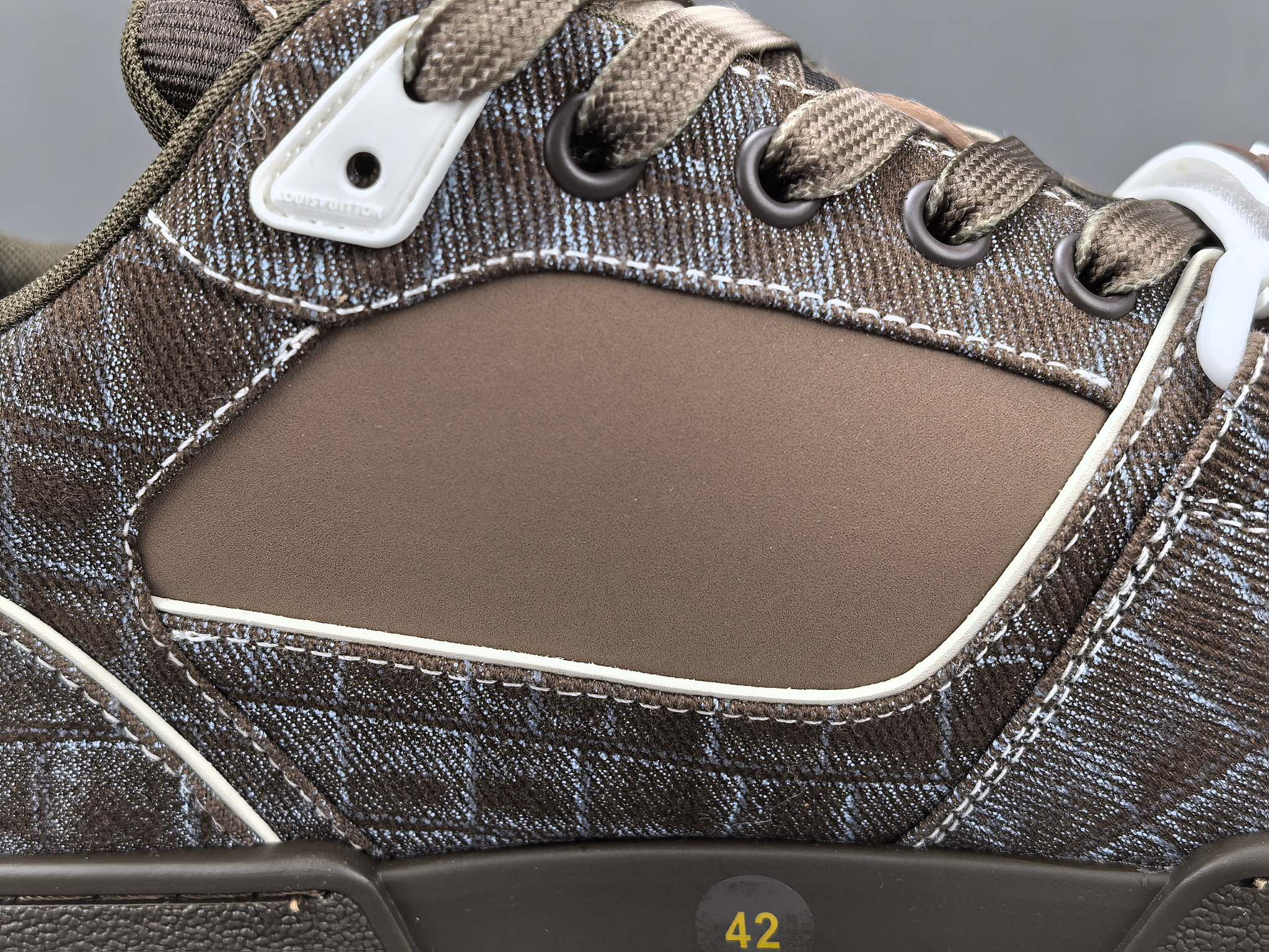 Les finitions sont impeccables, avec le logo emblématique de Louis Vuitton subtilement embossé sur le côté de la chaussure, ajoutant une signature discrète mais reconnaissable. Les lacets en coton ciré et les œillets métalliques complètent l’esthétique haut de gamme de cette sneaker.
