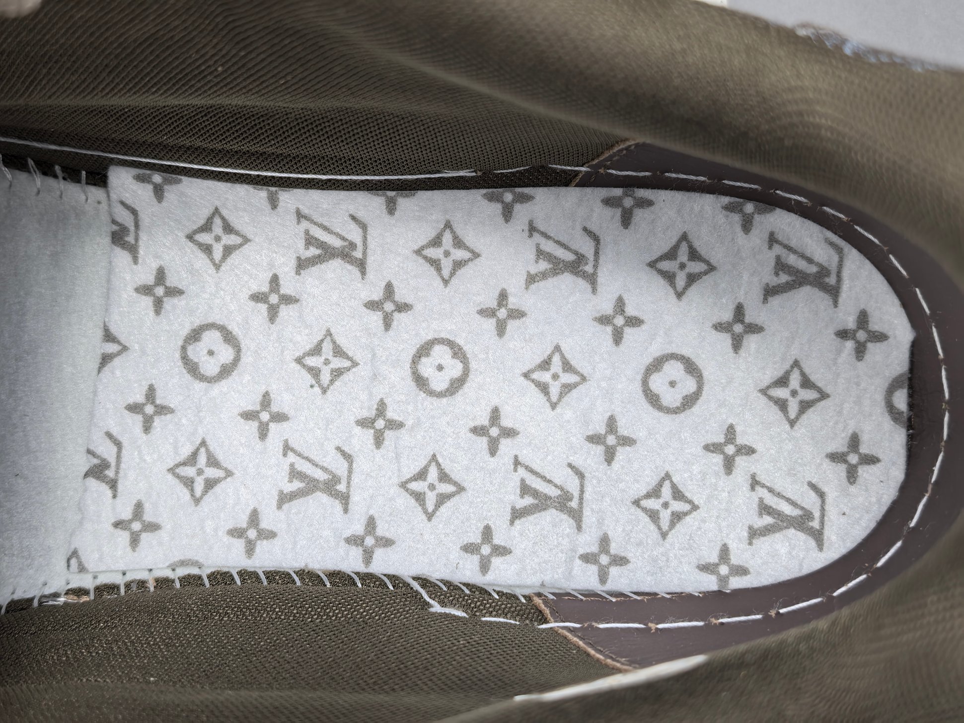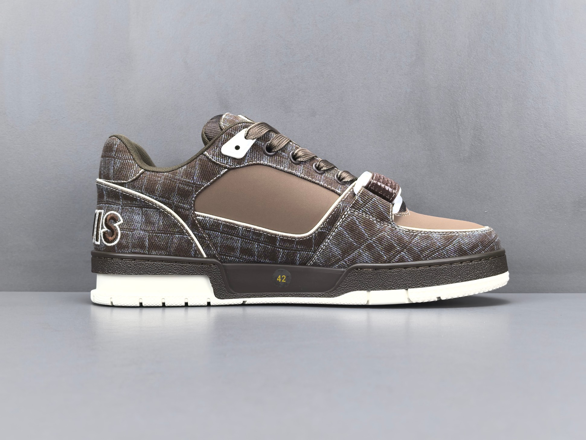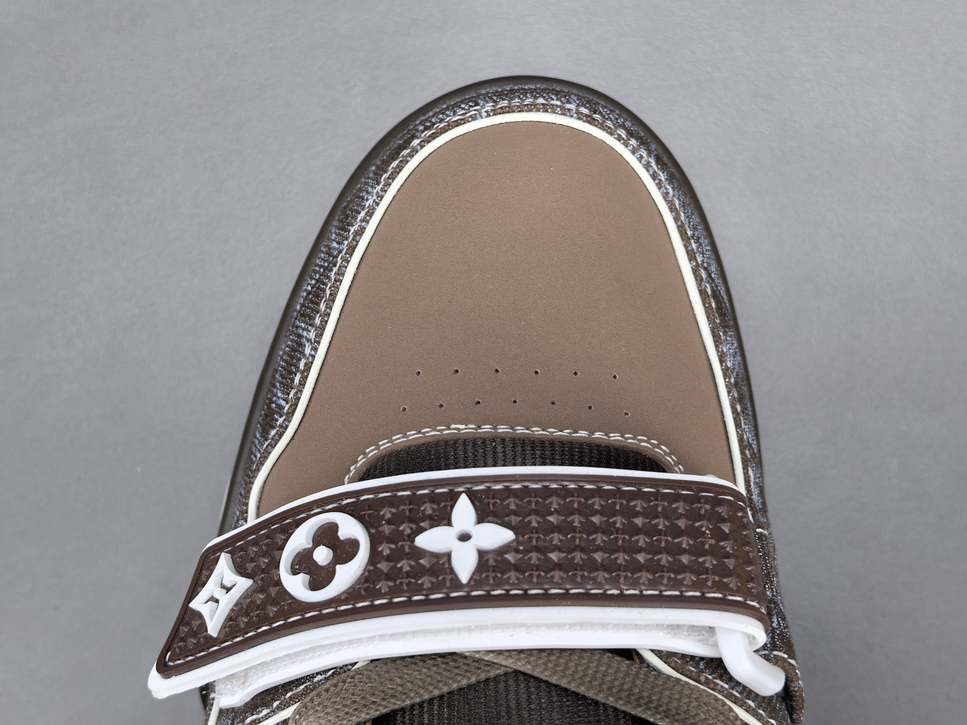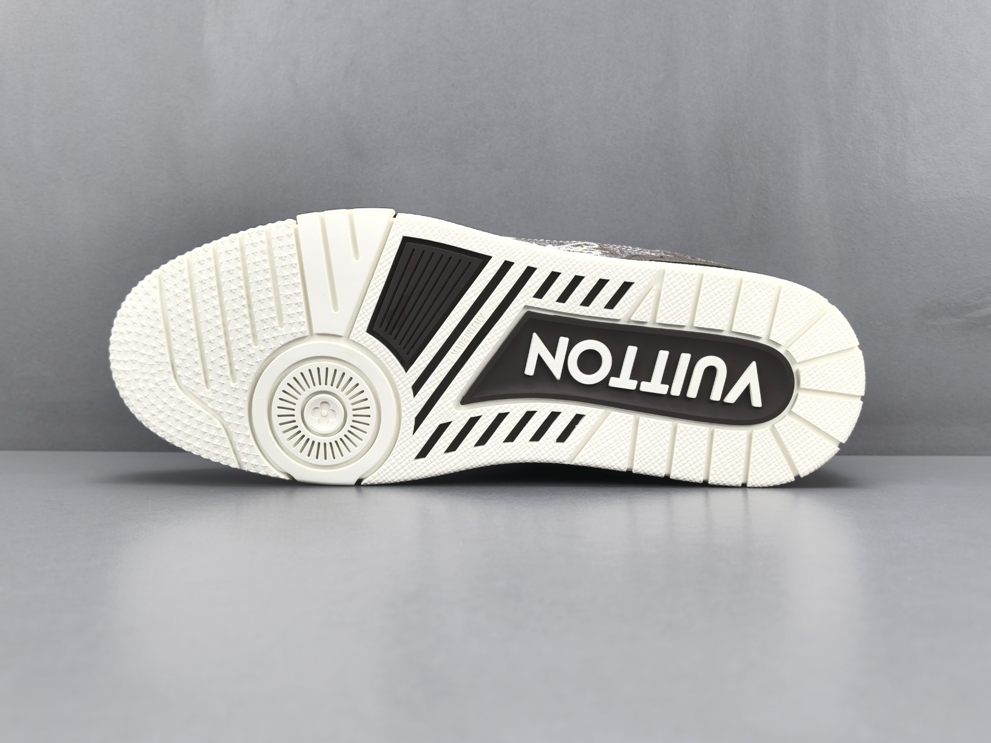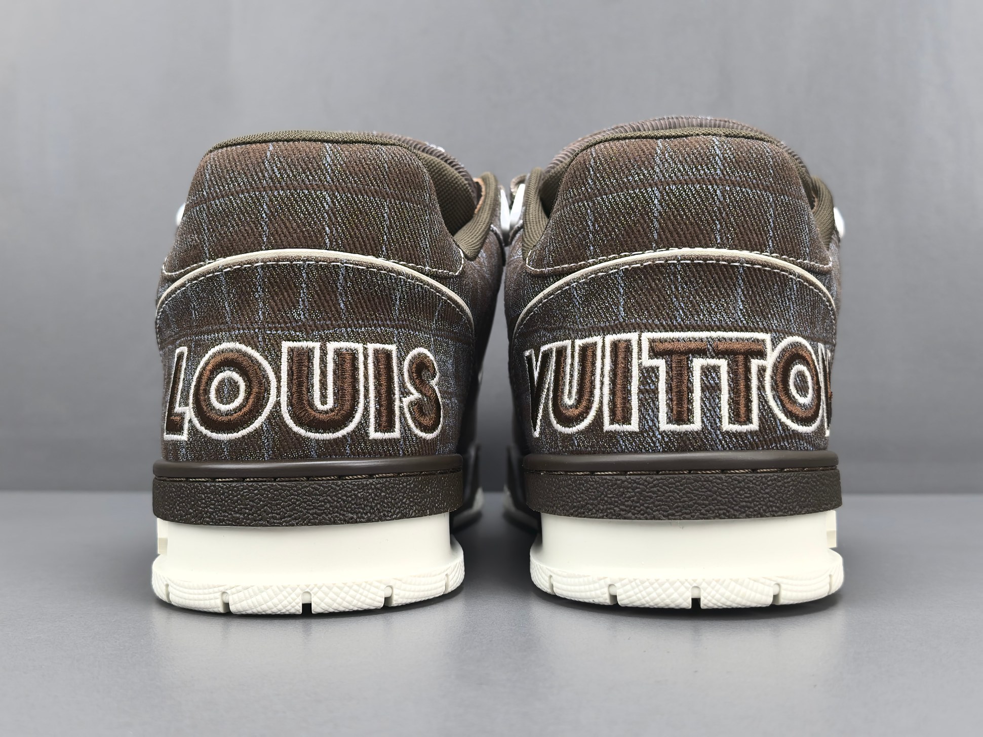 Les finitions sont impeccables, avec le logo emblématique de Louis Vuitton subtilement embossé sur le côté de la chaussure, ajoutant une signature discrète mais reconnaissable. Les lacets en coton ciré et les œillets métalliques complètent l’esthétique haut de gamme de cette sneaker.