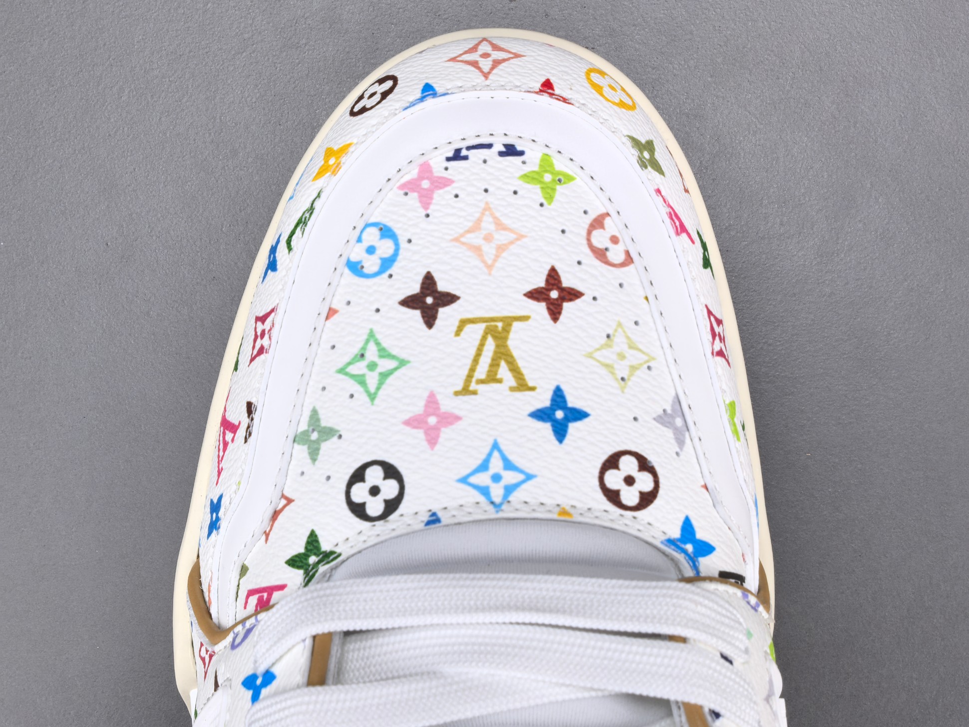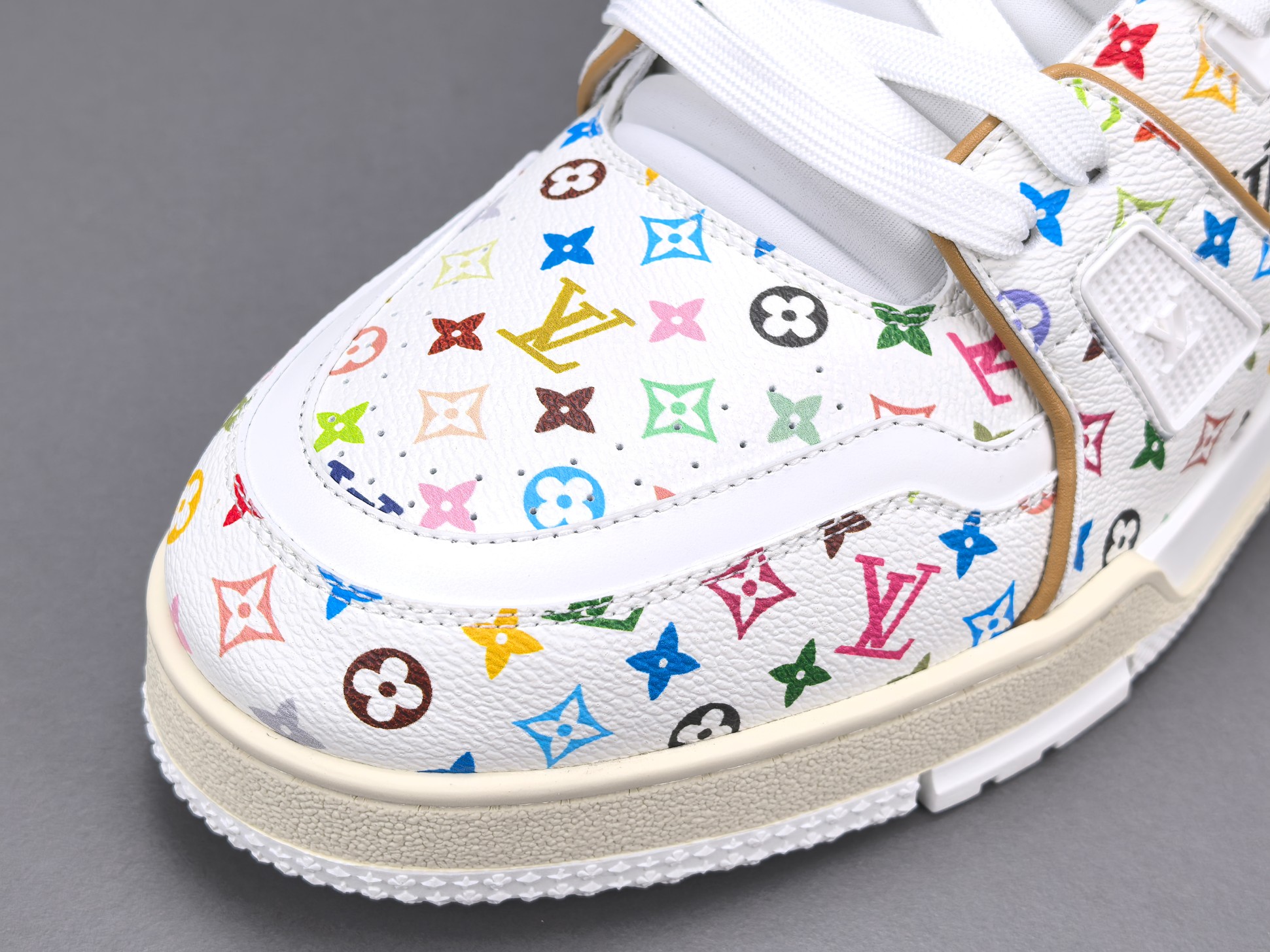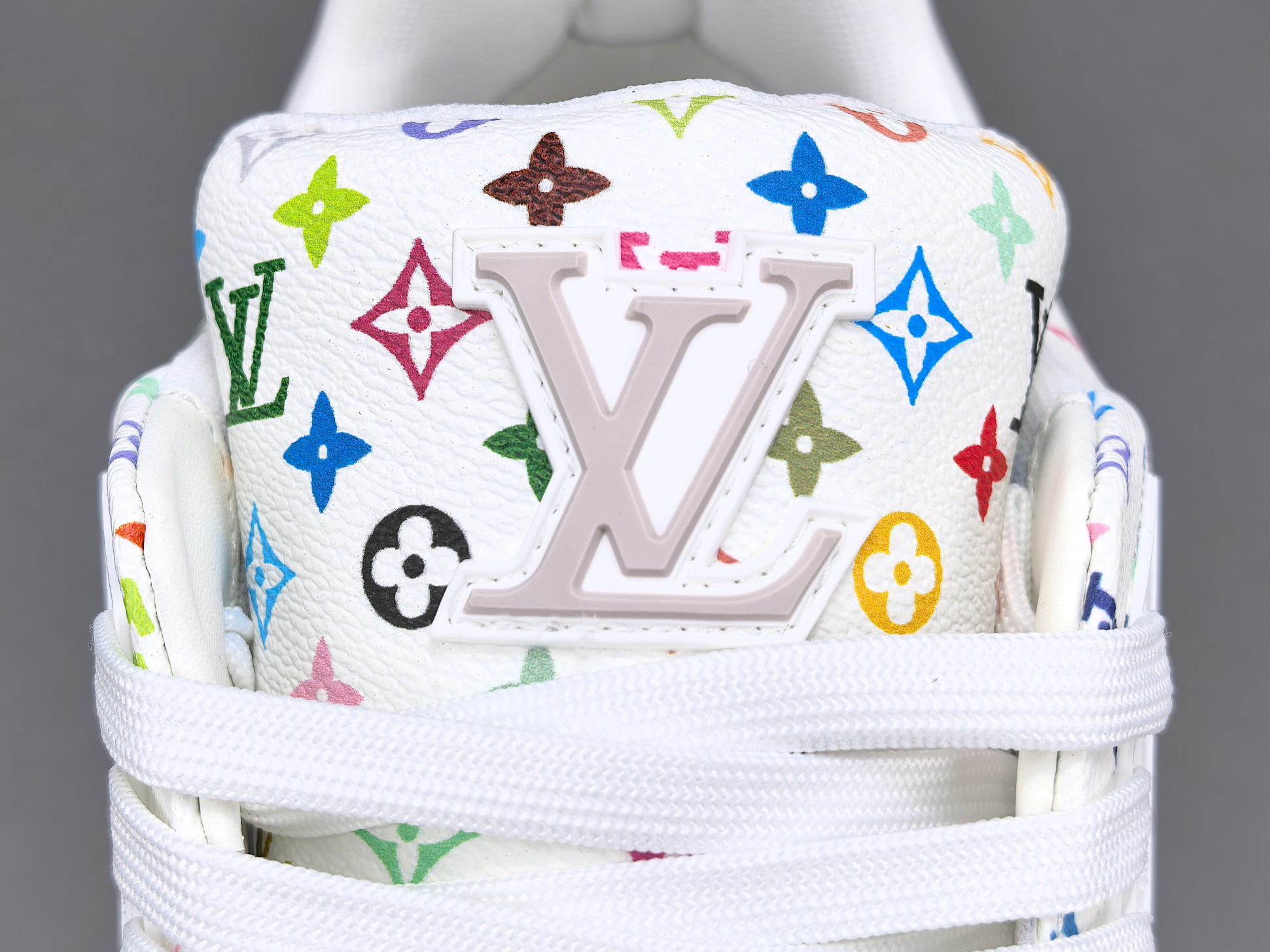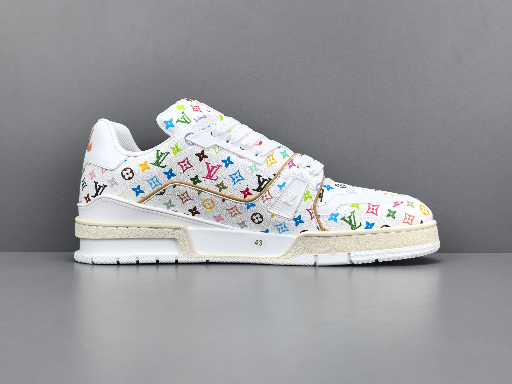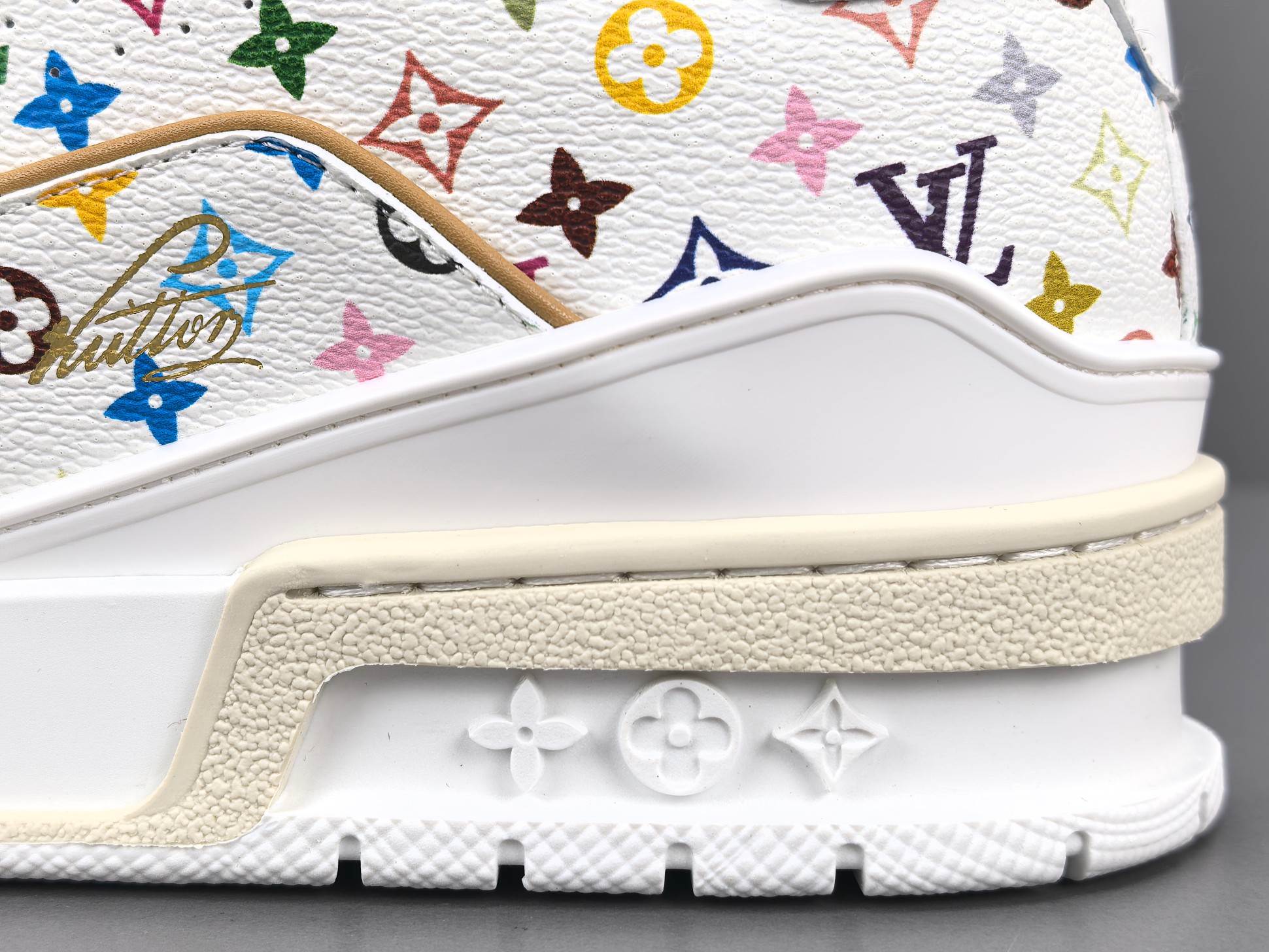 La sneaker arbore une base en cuir blanc de haute qualité, offrant à la fois confort et durabilité. Les accents multicolores, signature de Murakami, ajoutent une touche vibrante et contemporaine, transformant chaque paire en une pièce unique. Le logo emblématique de Louis Vuitton est subtilement intégré dans le design, assurant une reconnaissance immédiate de la marque.
