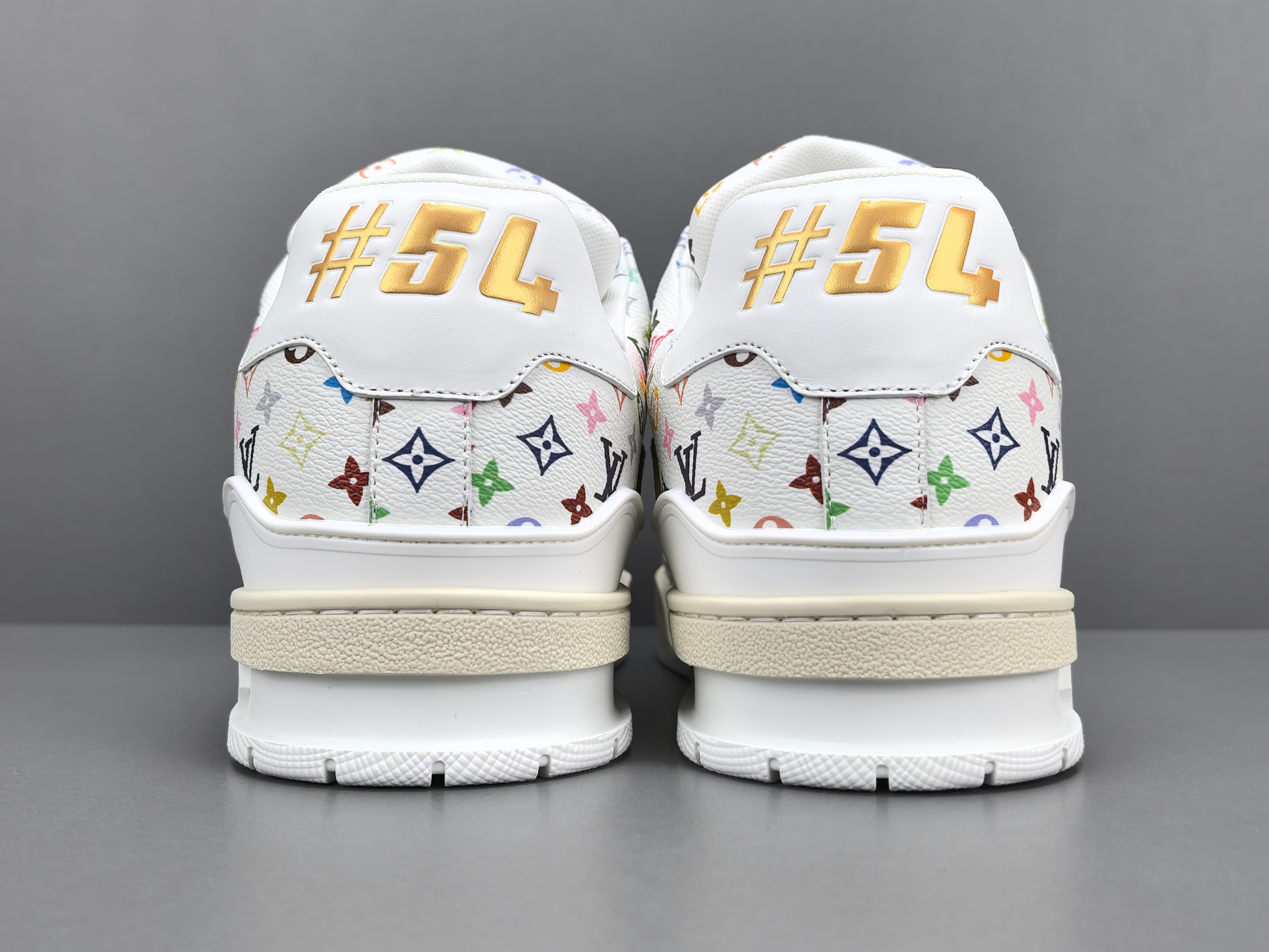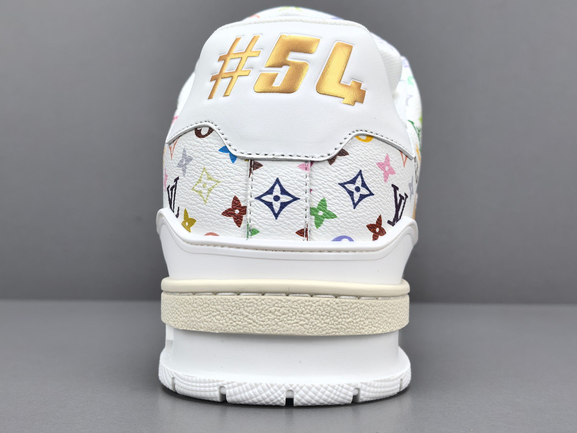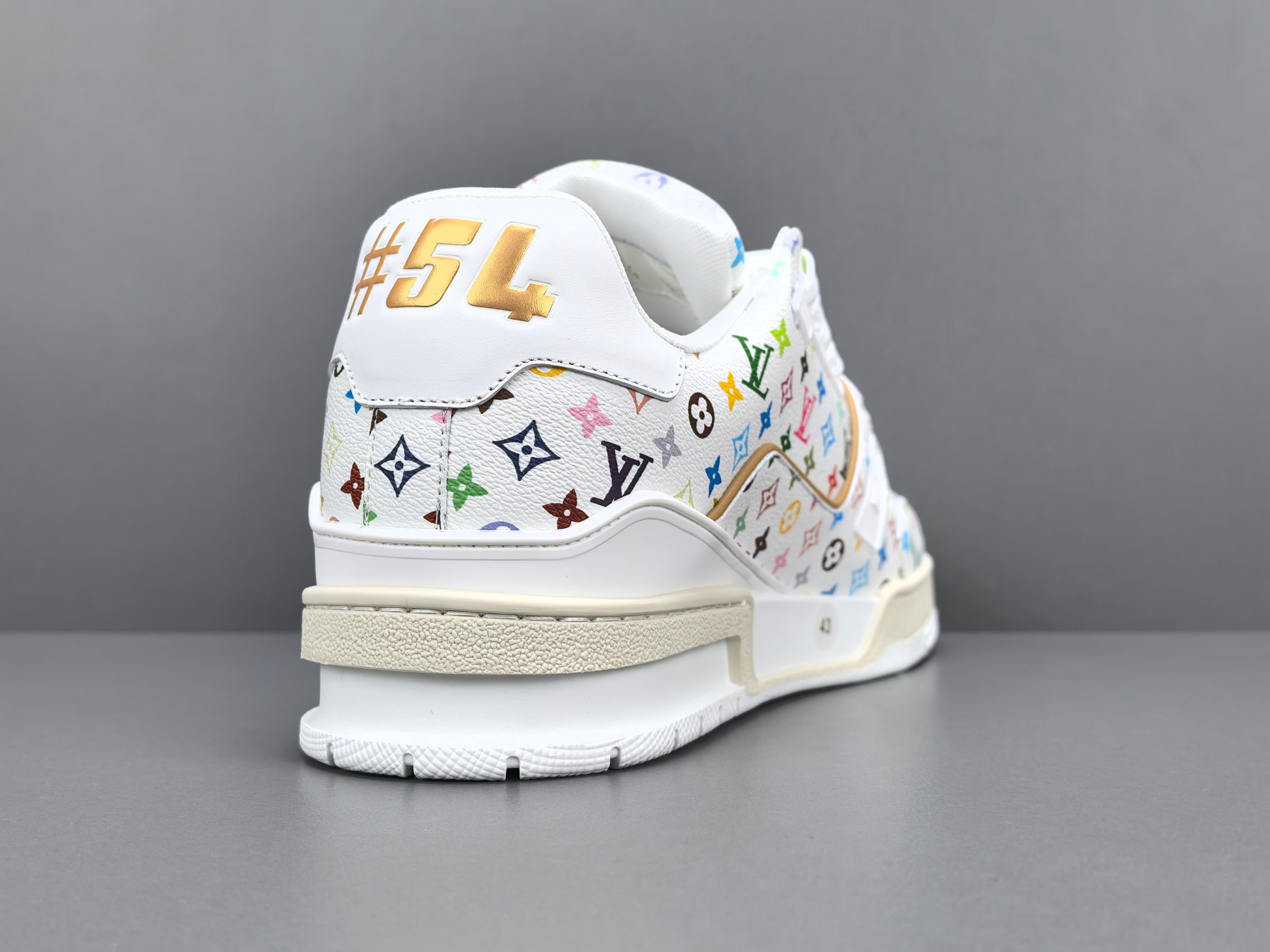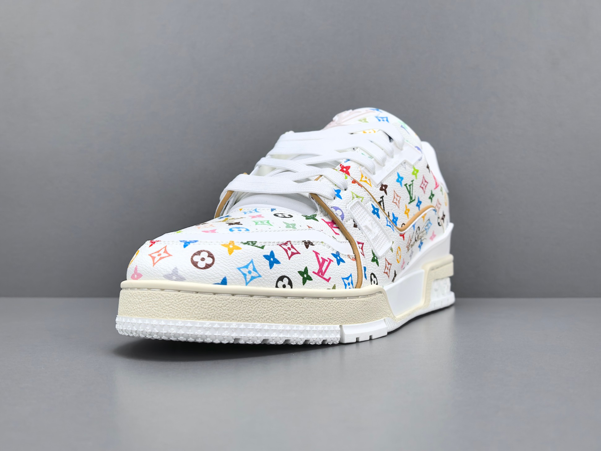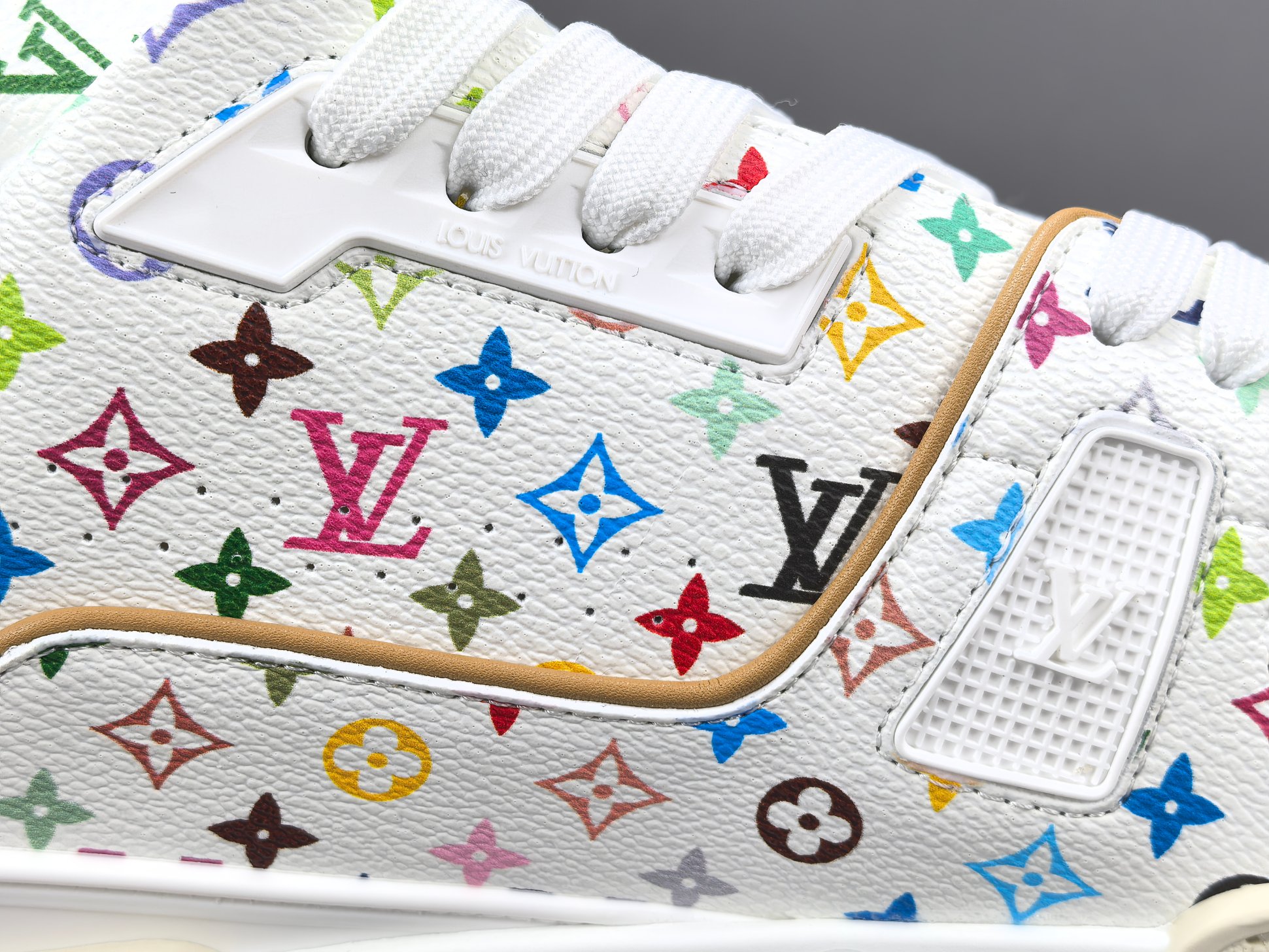 La sneaker arbore une base en cuir blanc de haute qualité, offrant à la fois confort et durabilité. Les accents multicolores, signature de Murakami, ajoutent une touche vibrante et contemporaine, transformant chaque paire en une pièce unique. Le logo emblématique de Louis Vuitton est subtilement intégré dans le design, assurant une reconnaissance immédiate de la marque.