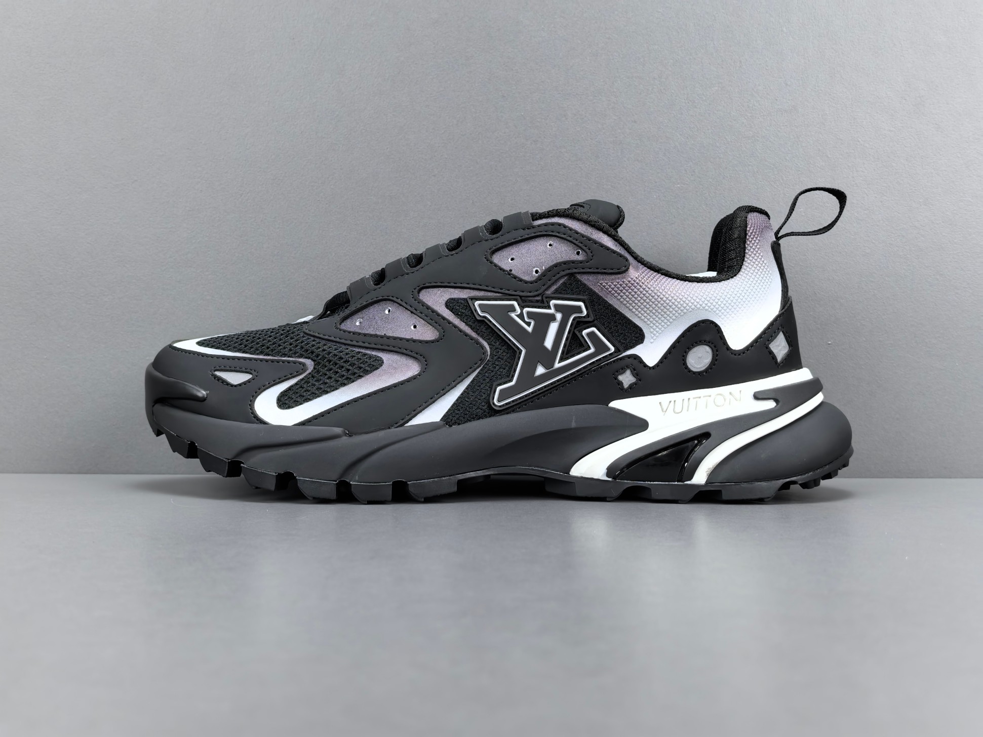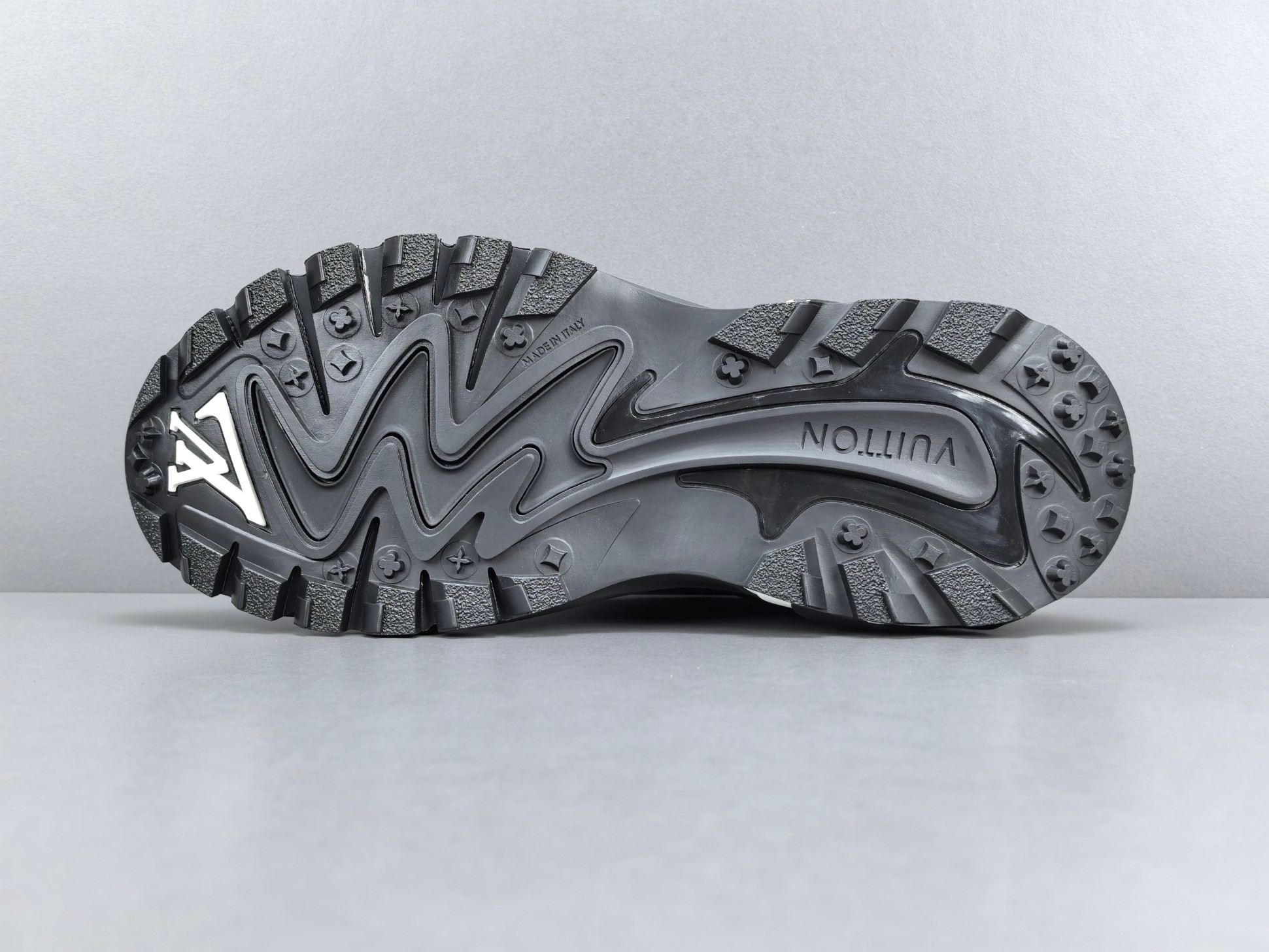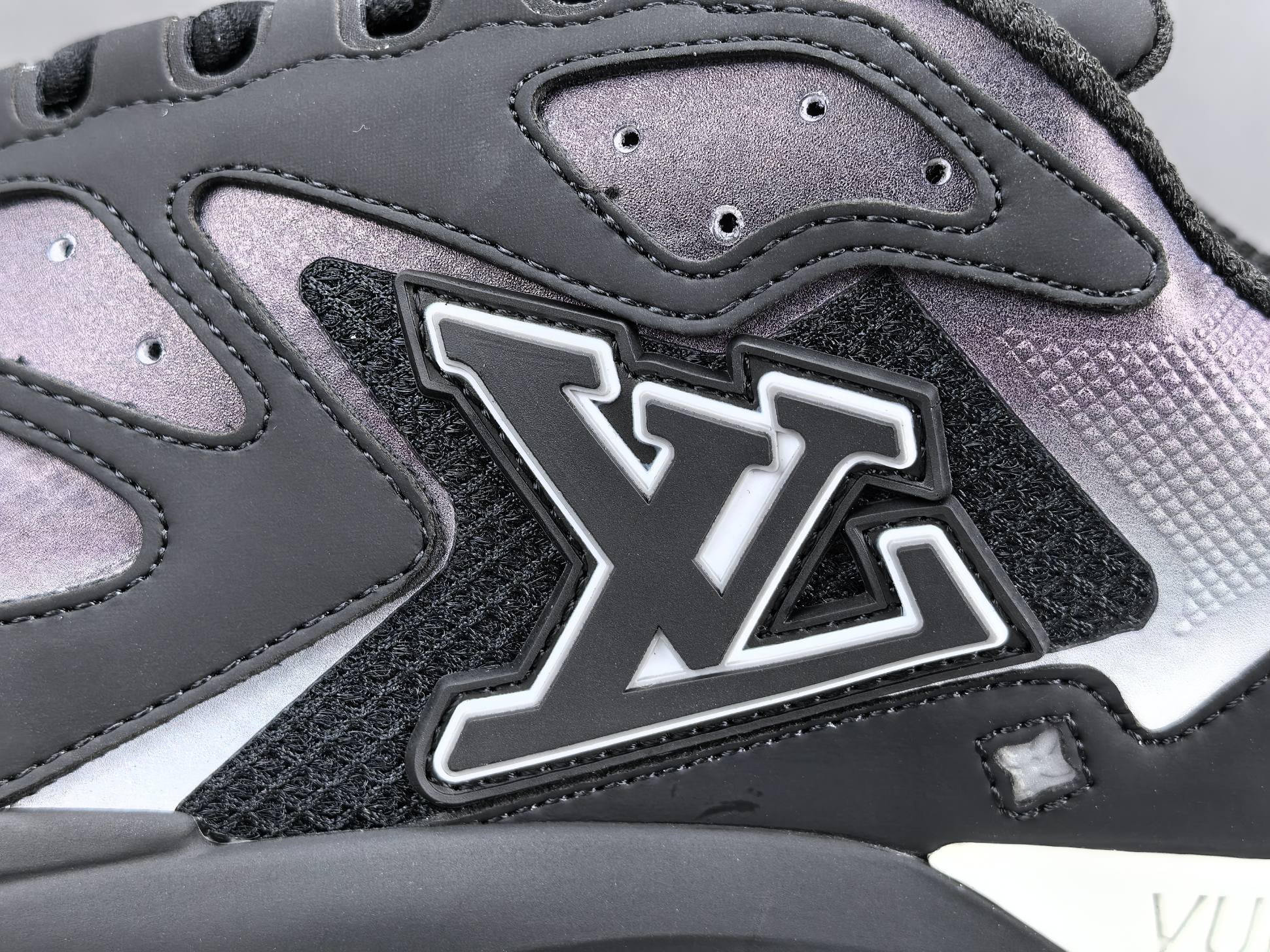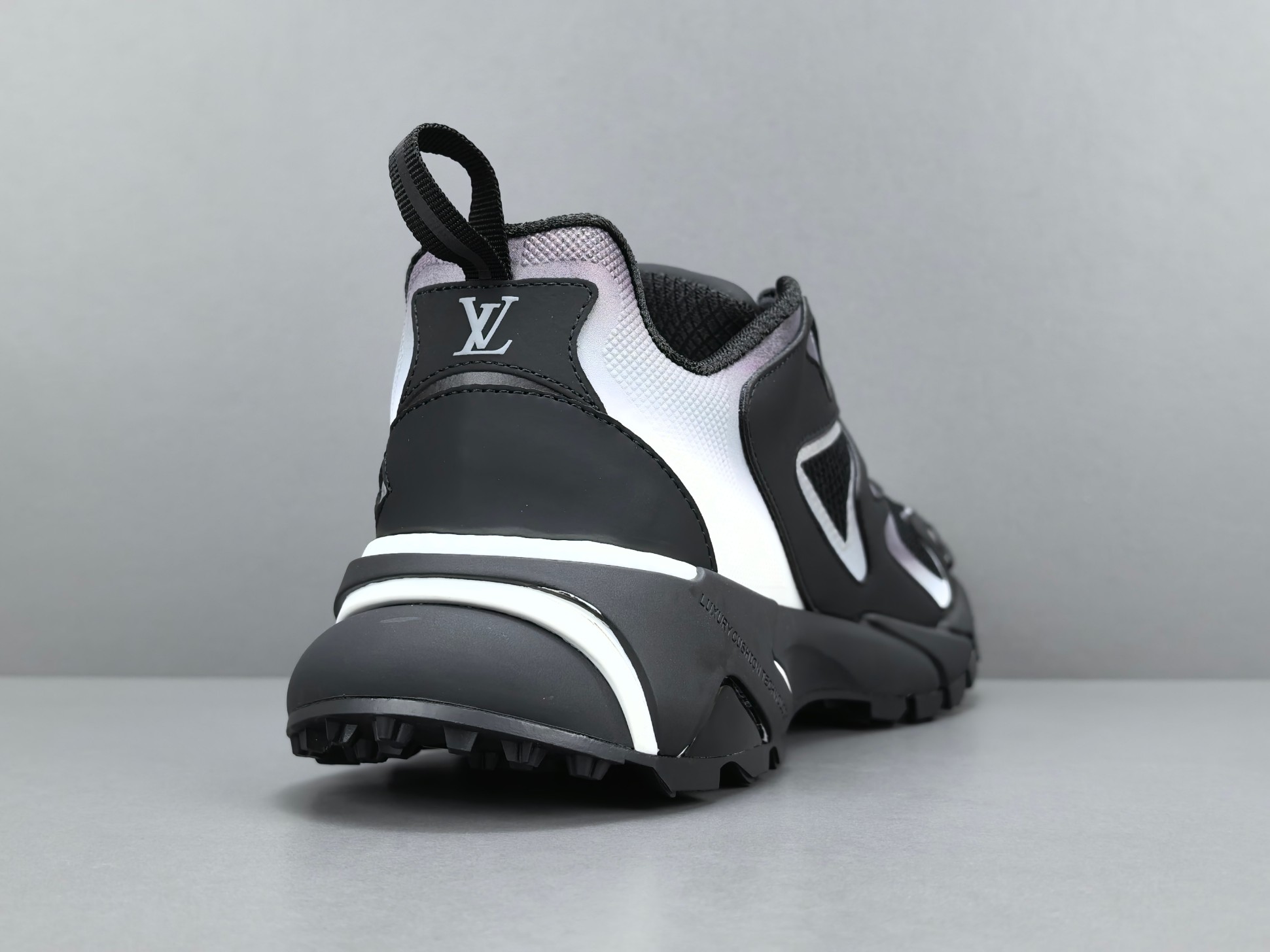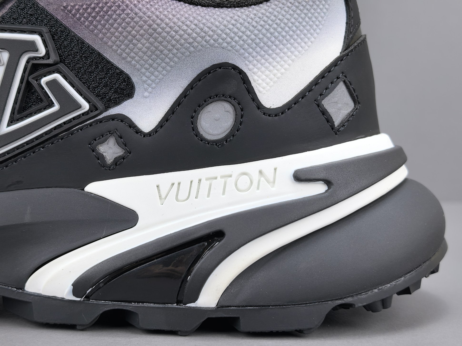La semelle intermédiaire est conçue pour offrir un amorti optimal, garantissant un confort exceptionnel lors de la marche ou de la course. La semelle extérieure, quant à elle, est dotée d’un motif antidérapant qui assure une adhérence supérieure sur différentes surfaces. Les détails de finition, tels que le logo Louis Vuitton subtilement apposé et les coutures soignées, témoignent de l’attention portée aux détails et du luxe inhérent à la marque.