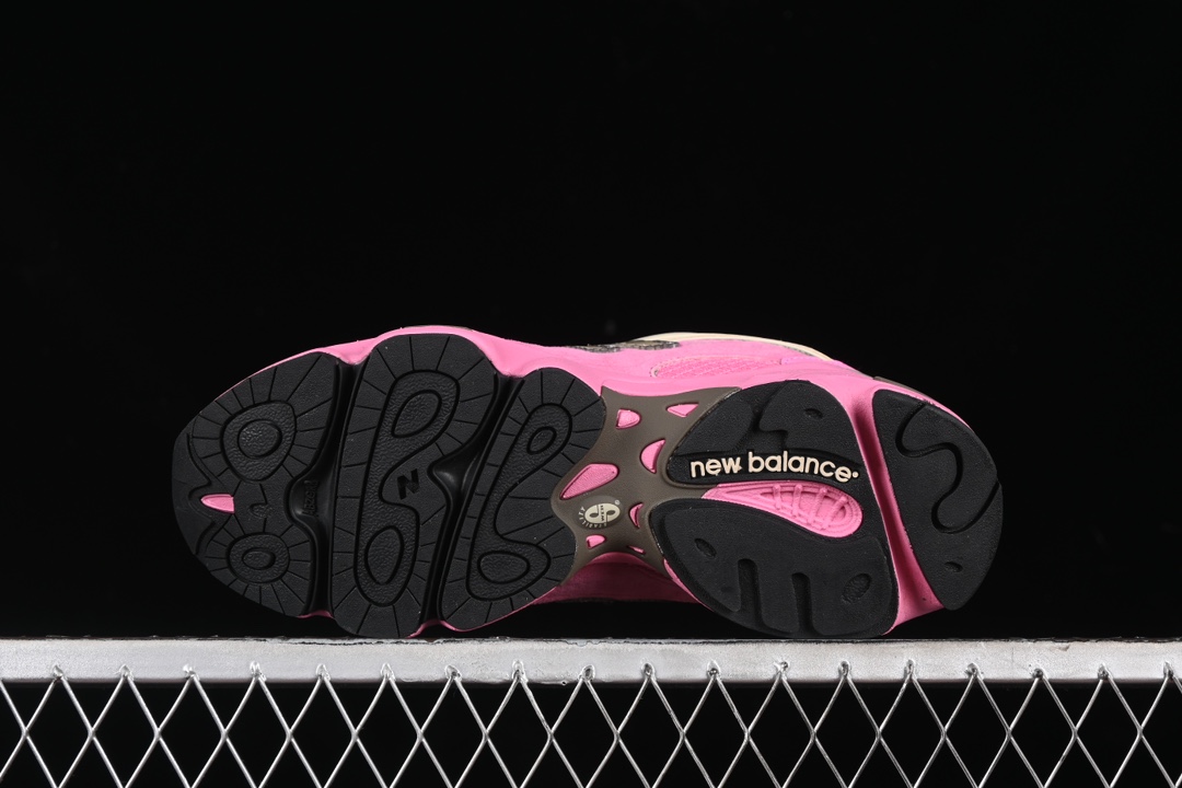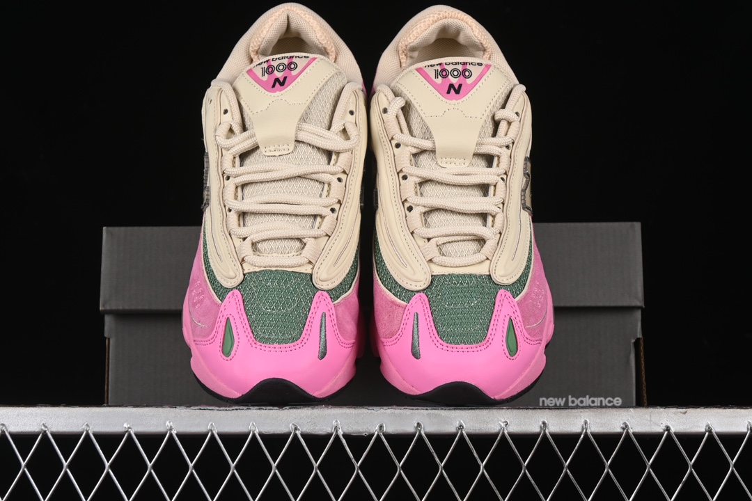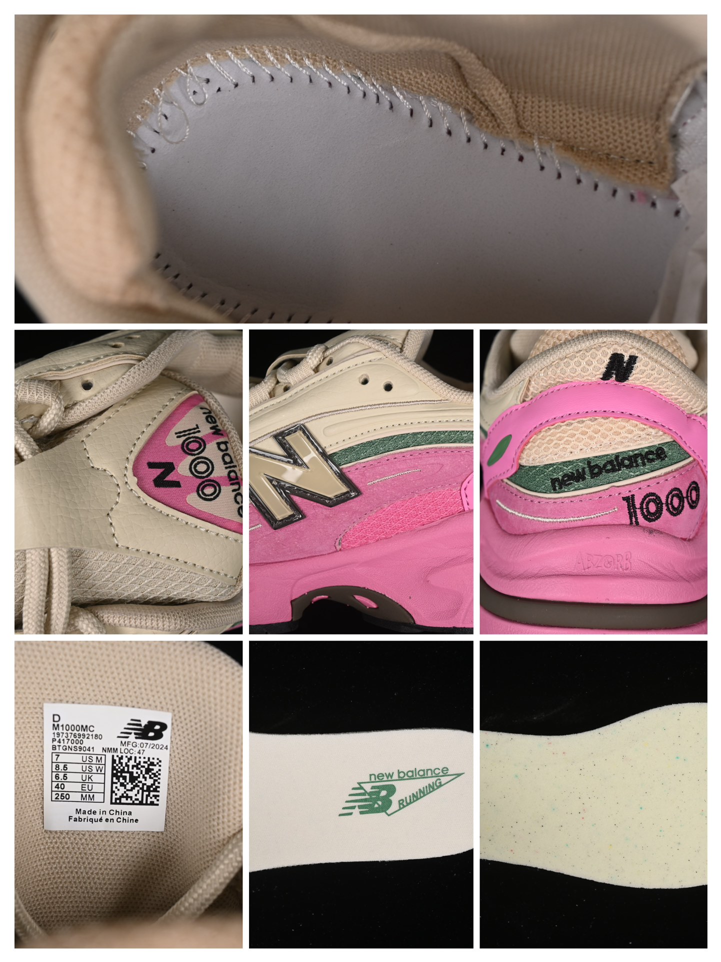 La New Balance 1000 Tan Pink Green M1000MC est une chaussure de sport qui combine style et confort. Elle présente une tige en daim de couleur tan (beige) qui offre une texture douce et un aspect premium. Des accents de couleur rose et vert sont appliqués sur différentes parties de la chaussure, notamment sur le logo « N » emblématique de New Balance, sur la languette et autour de la cheville, apportant une touche de vivacité et de contraste.