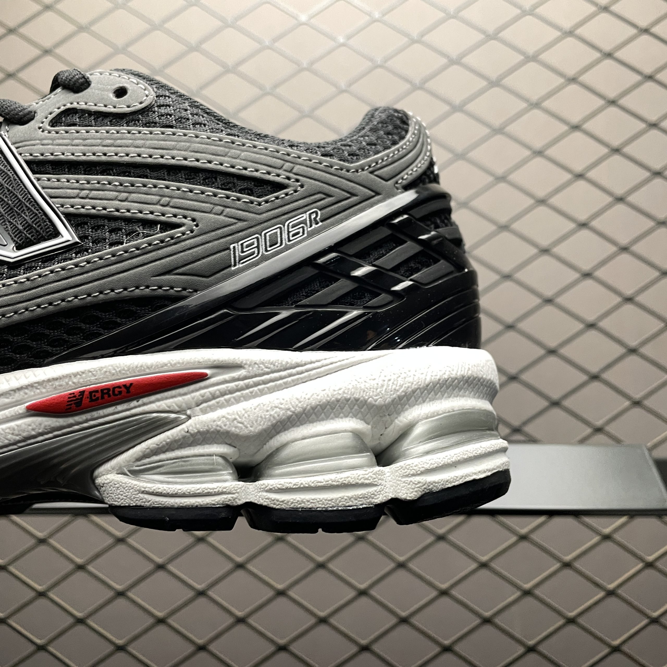 Le modèle 1906R présente une tige en mesh respirant, combinée à des empiècements en cuir et en synthétique, offrant à la fois durabilité et confort. La palette de couleurs Black Team Red Castlerock confère à la chaussure un look dynamique et polyvalent, avec une base noire élégante rehaussée de touches de rouge vif et de gris Castlerock, créant un contraste visuel saisissant.