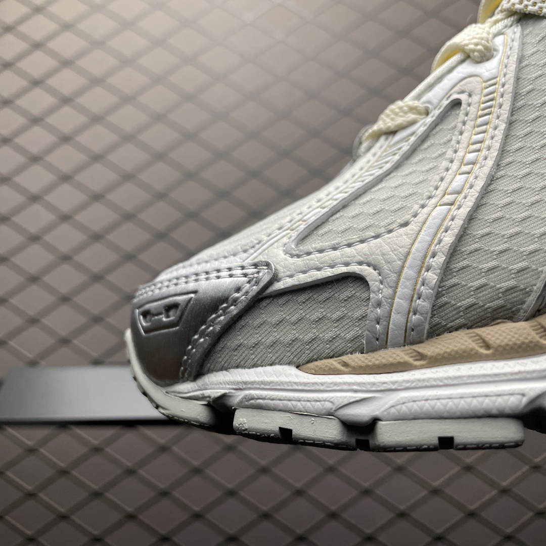 La chaussure présente une esthétique rétro avec des technologies modernes. Le dessus est fabriqué à partir d’un mélange de matériaux de qualité, incluant du cuir lisse et du mesh respirant, principalement en blanc, avec des touches de gris et d’argent pour un look épuré et versatile. Le logo « N » emblématique de New Balance apparaît sur les côtés dans une couleur argentée contrastante.