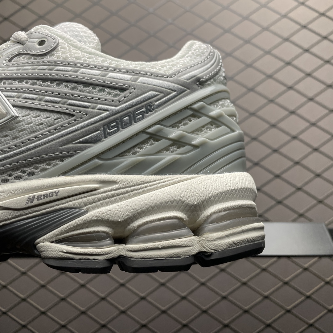 La chaussure présente une palette de couleurs principalement grises, avec des nuances de gris foncé et des touches de noir, ce qui lui confère un look sobre et versatile. Le modèle 1906R est connu pour son esthétique rétro inspirée des chaussures de course des années 2000, combinée à des technologies modernes pour améliorer le confort et la performance.