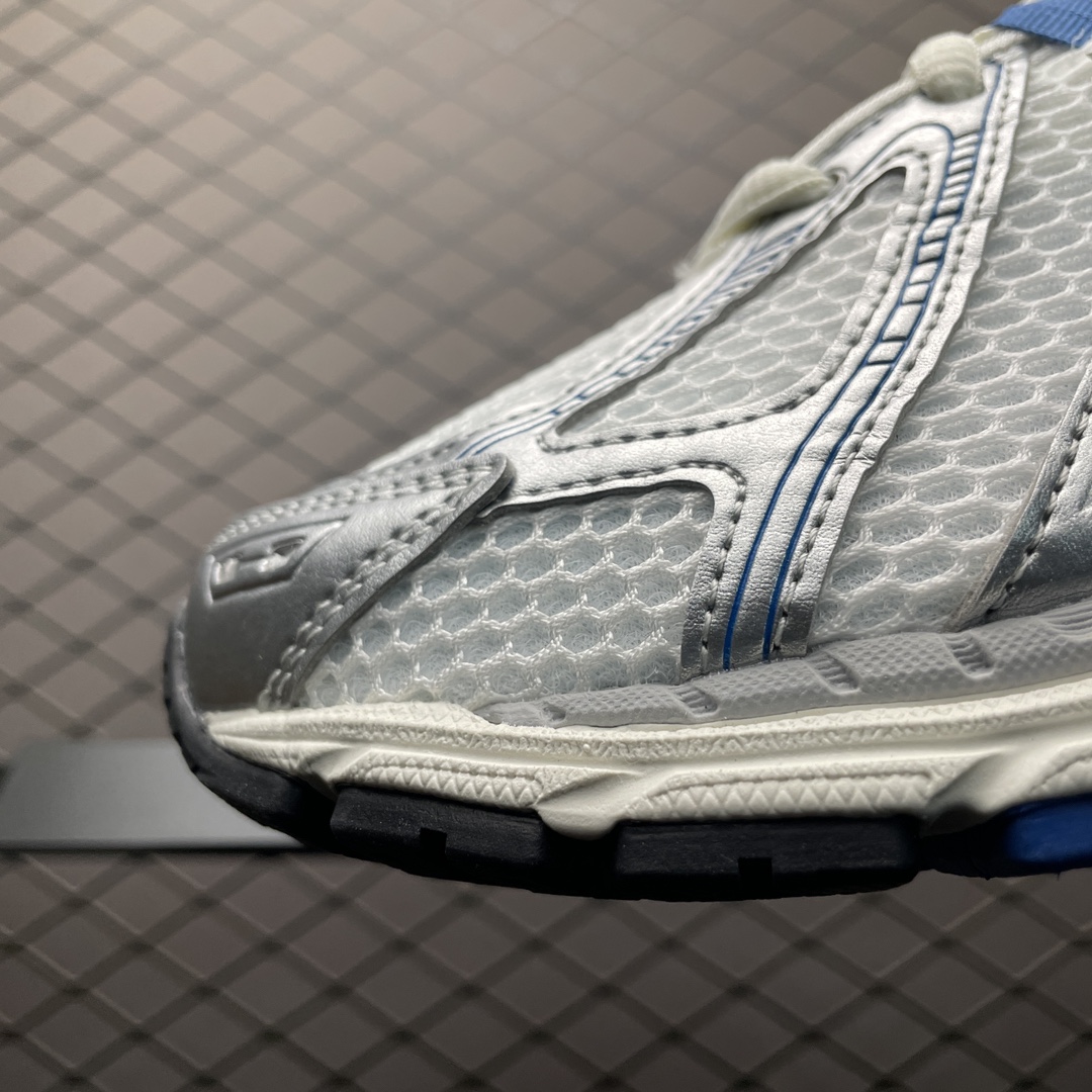 La partie supérieure de la chaussure est conçue avec une combinaison de matériaux, incluant du mesh respirant et des empiècements en cuir, offrant ainsi un équilibre entre durabilité, confort et style. La couleur dominante est un bleu agate métallisé, accompagné de touches d’argent, ce qui confère à la chaussure un aspect à la fois élégant et accrocheur.
