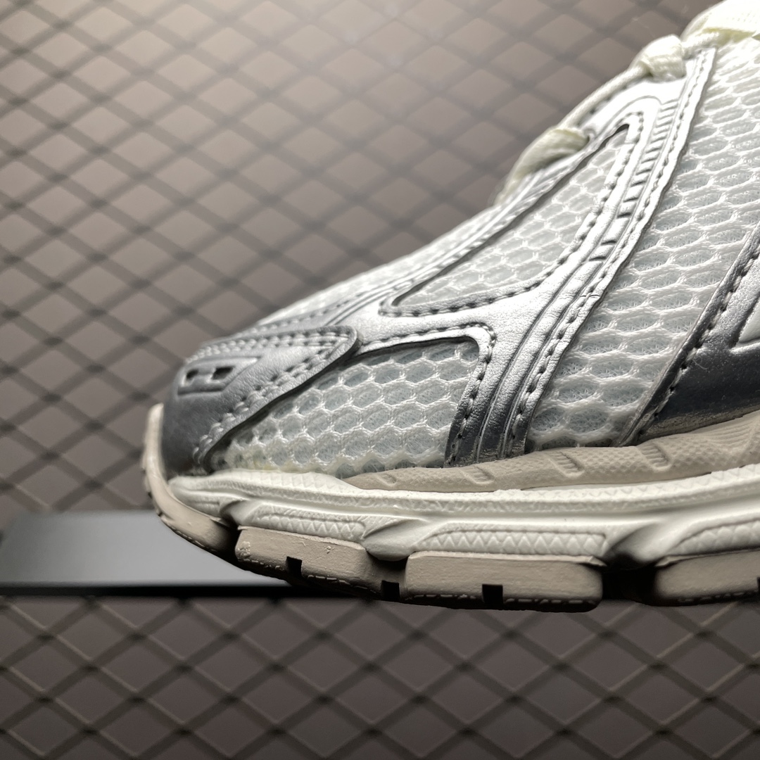 La tige de la chaussure est fabriquée en mesh et en cuir, offrant à la fois respirabilité et durabilité. La couleur dominante est un gris métallique argenté, accompagné de détails en blanc et en nuances de gris plus clair, ce qui lui confère un look à la fois élégant et polyvalent.