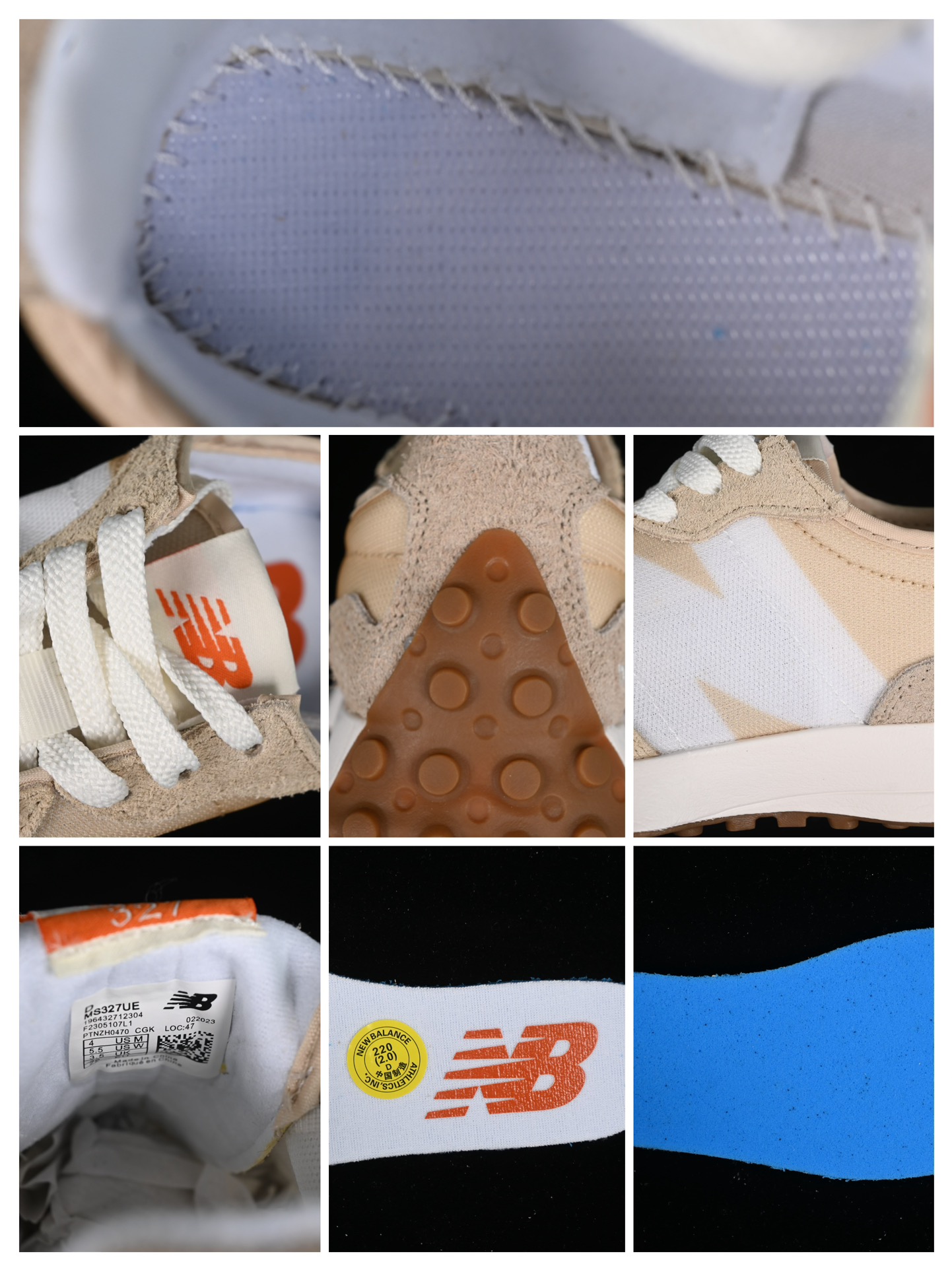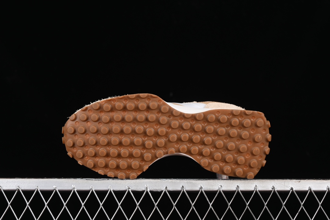 La semelle extérieure est en caoutchouc, étendue sur le talon, ce qui est une caractéristique distinctive de la série 327, offrant non seulement un aspect unique mais aussi une traction supplémentaire. La semelle intermédiaire est conçue pour fournir un confort optimal, permettant une utilisation prolongée tout au long de la journée sans inconfort.