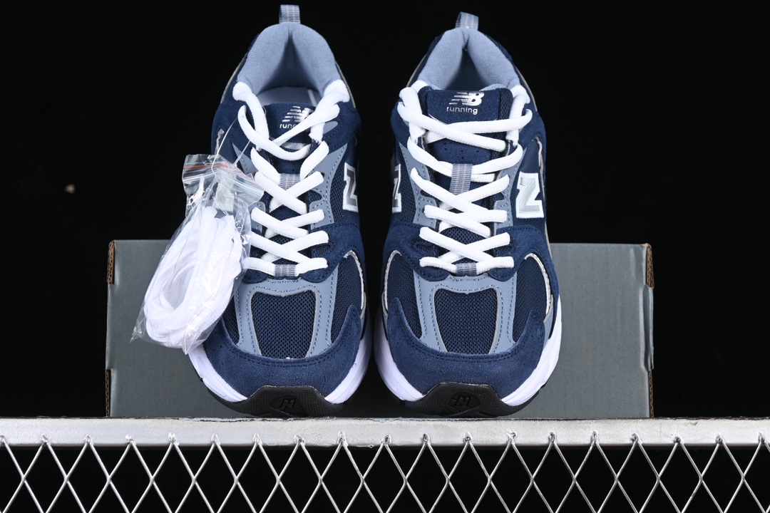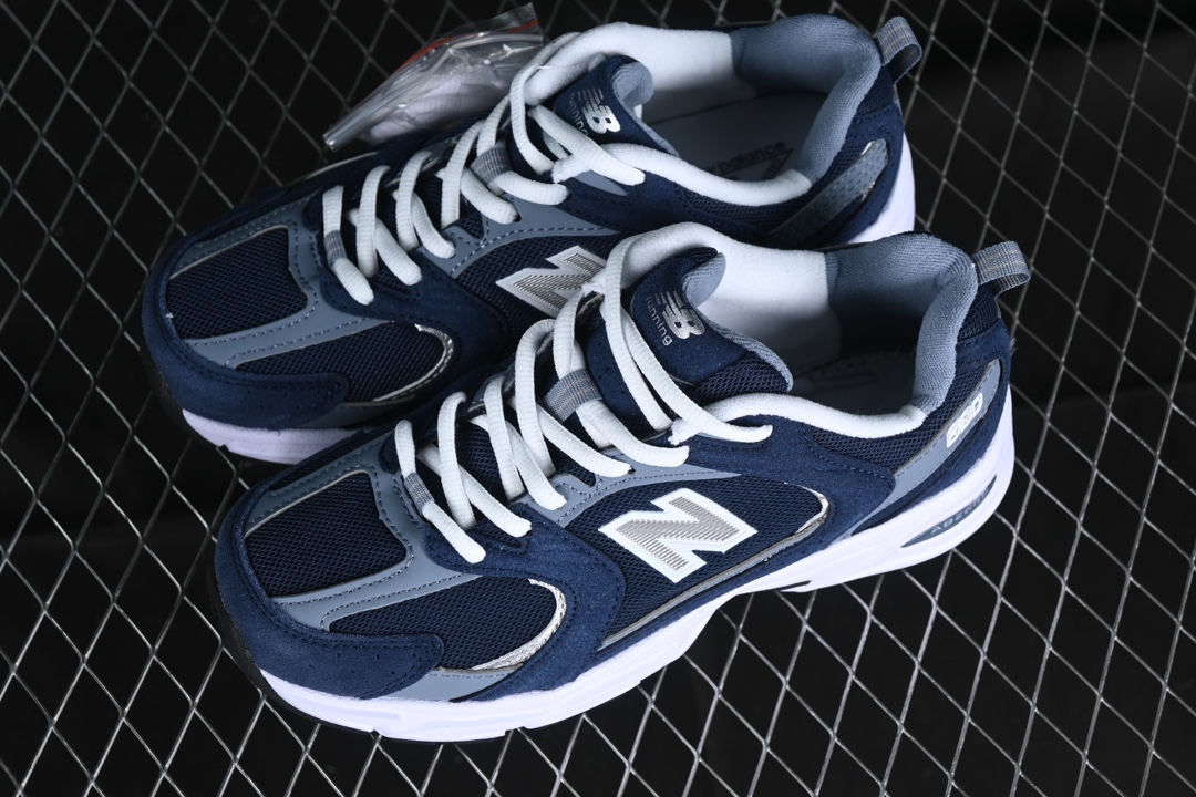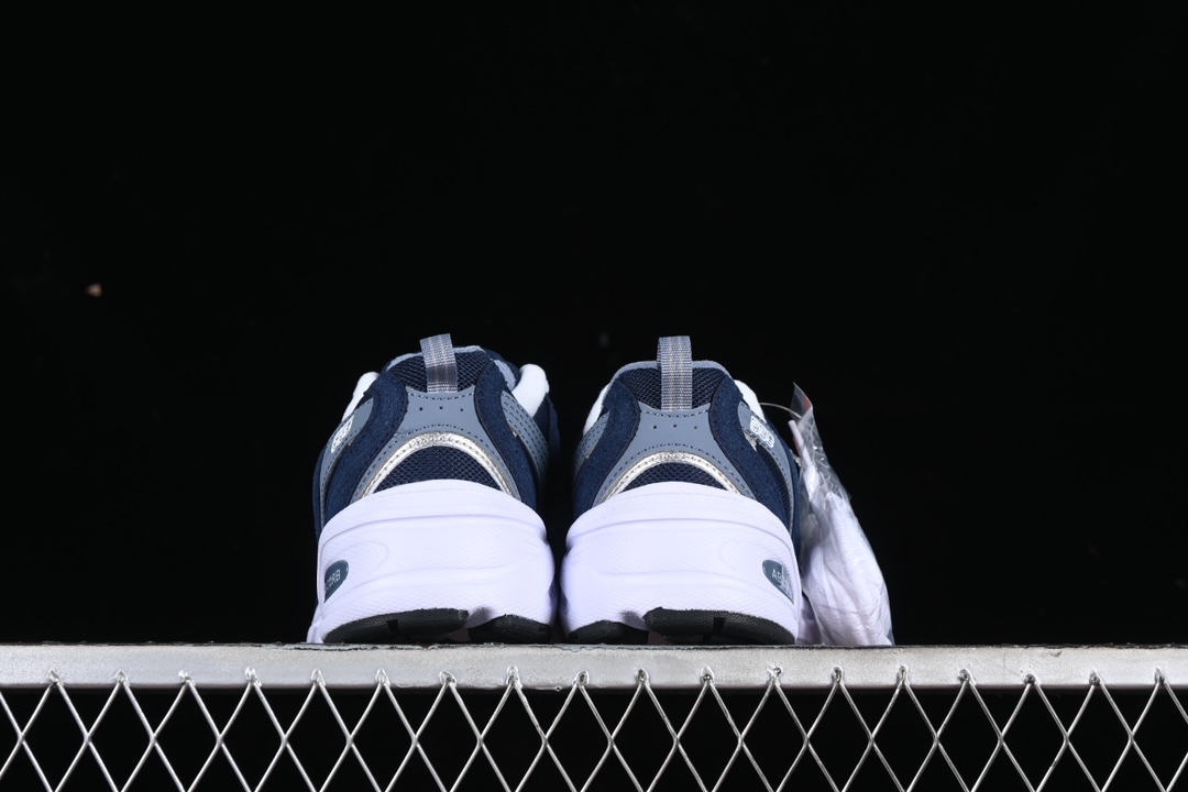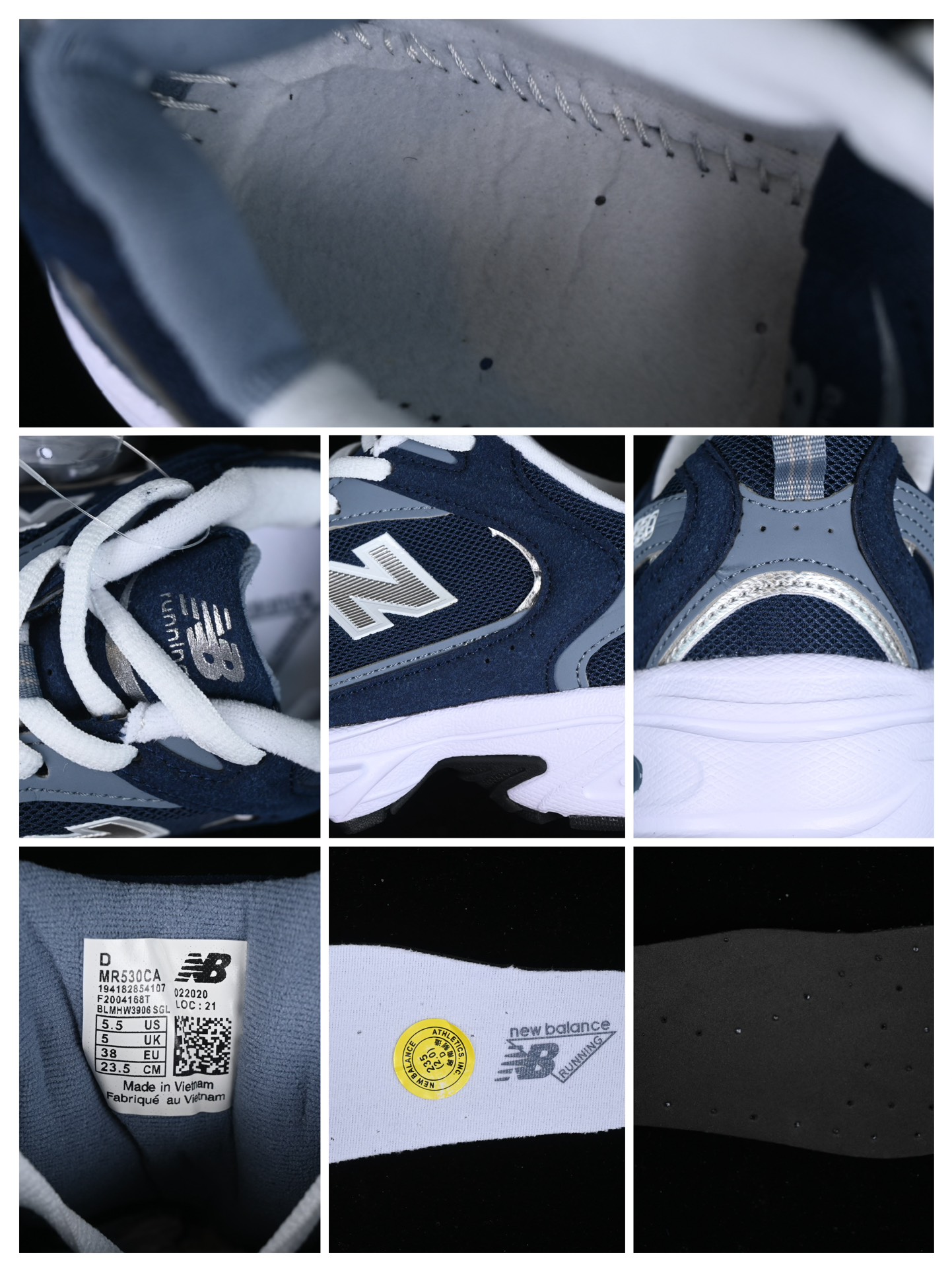 La New Balance 530 Navy Arctic Grey MR530CA est une chaussure de style rétro-running qui combine confort et esthétique vintage. Le modèle présente une tige en matériaux mixtes, incluant du cuir et du mesh, ce qui offre à la fois durabilité et respirabilité. La palette de couleurs utilise principalement le bleu marine avec des touches de gris arctique, créant une apparence à la fois sobre et élégante.
