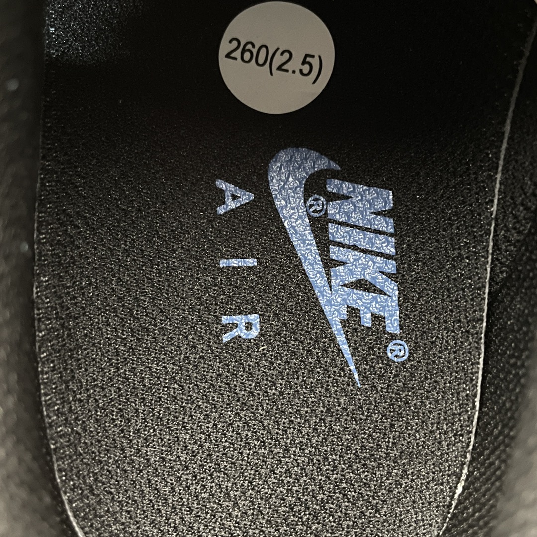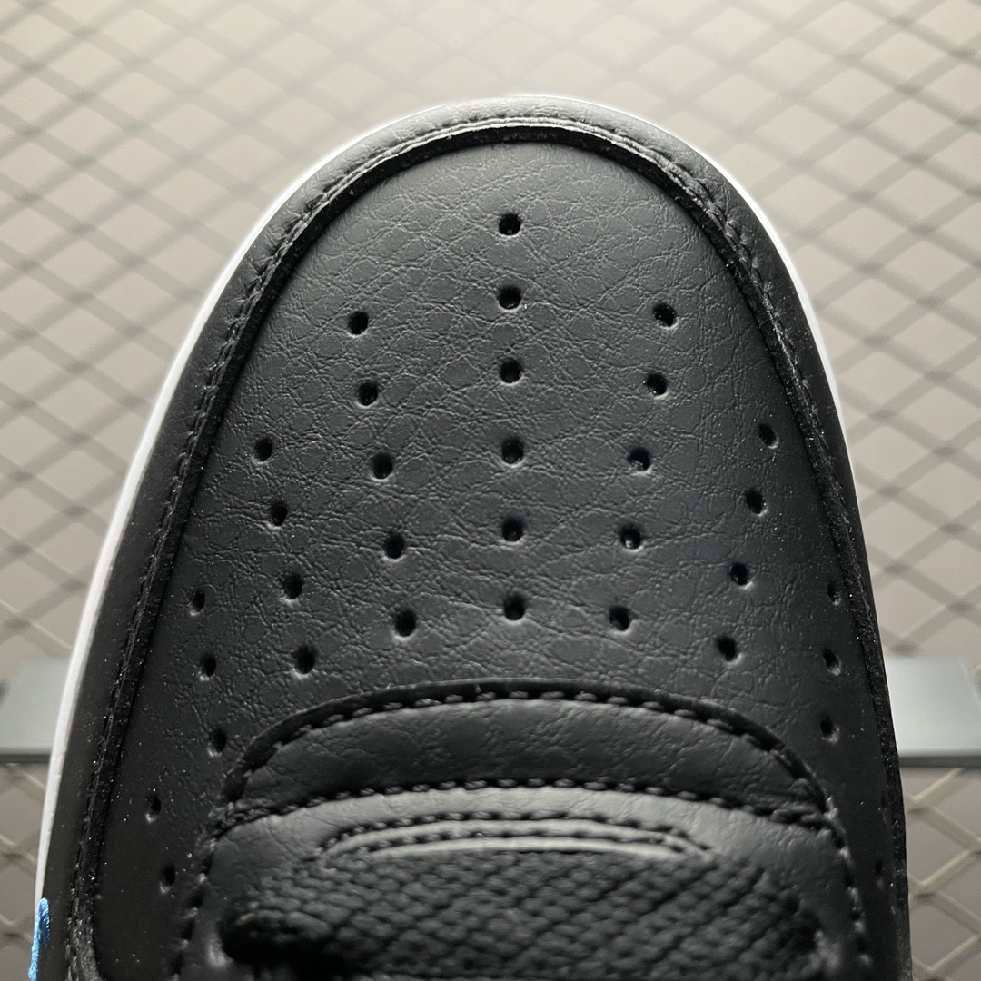 La tige est fabriquée principalement en cuir de haute qualité, ce qui assure à la fois durabilité et confort. Le cuir noir lisse est utilisé sur la majorité de la chaussure, tandis que le contraste est apporté par le cuir bleu sur le logo Swoosh et d’autres éléments décoratifs. Cette combinaison de couleurs offre un look à la fois classique et audacieux.