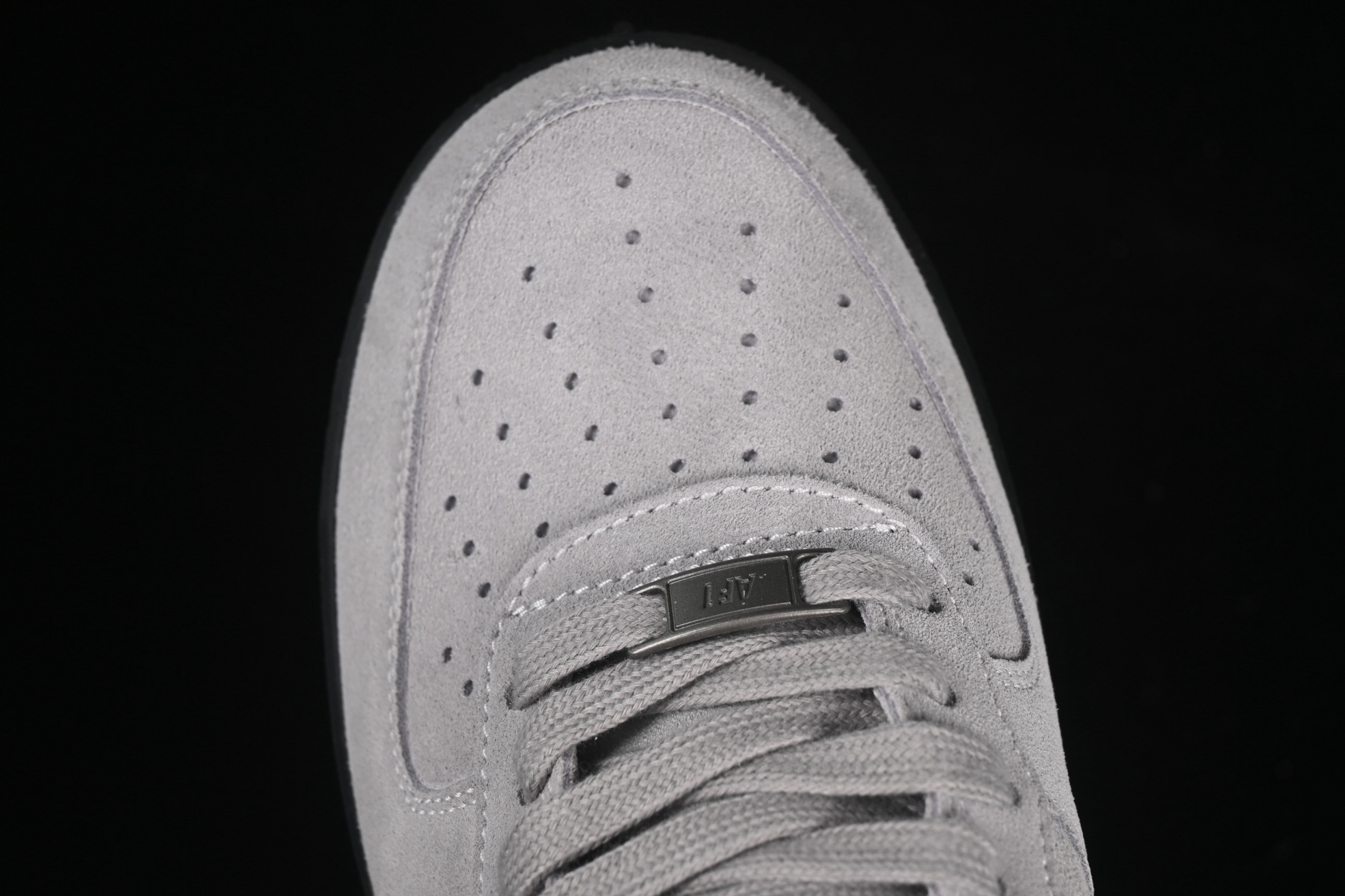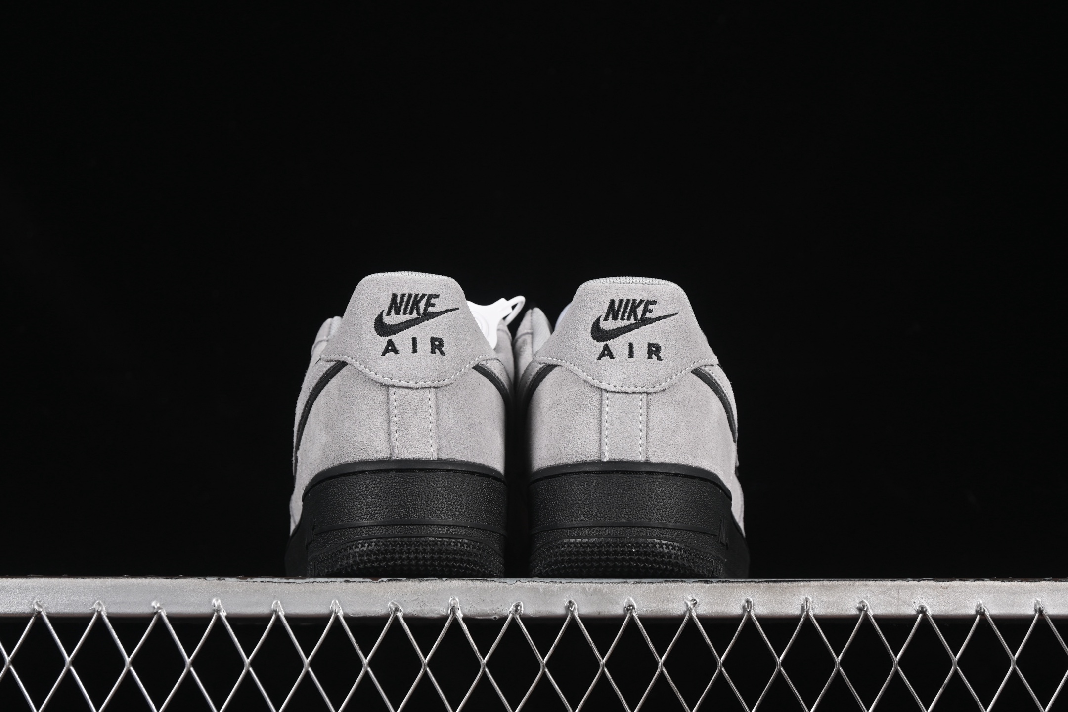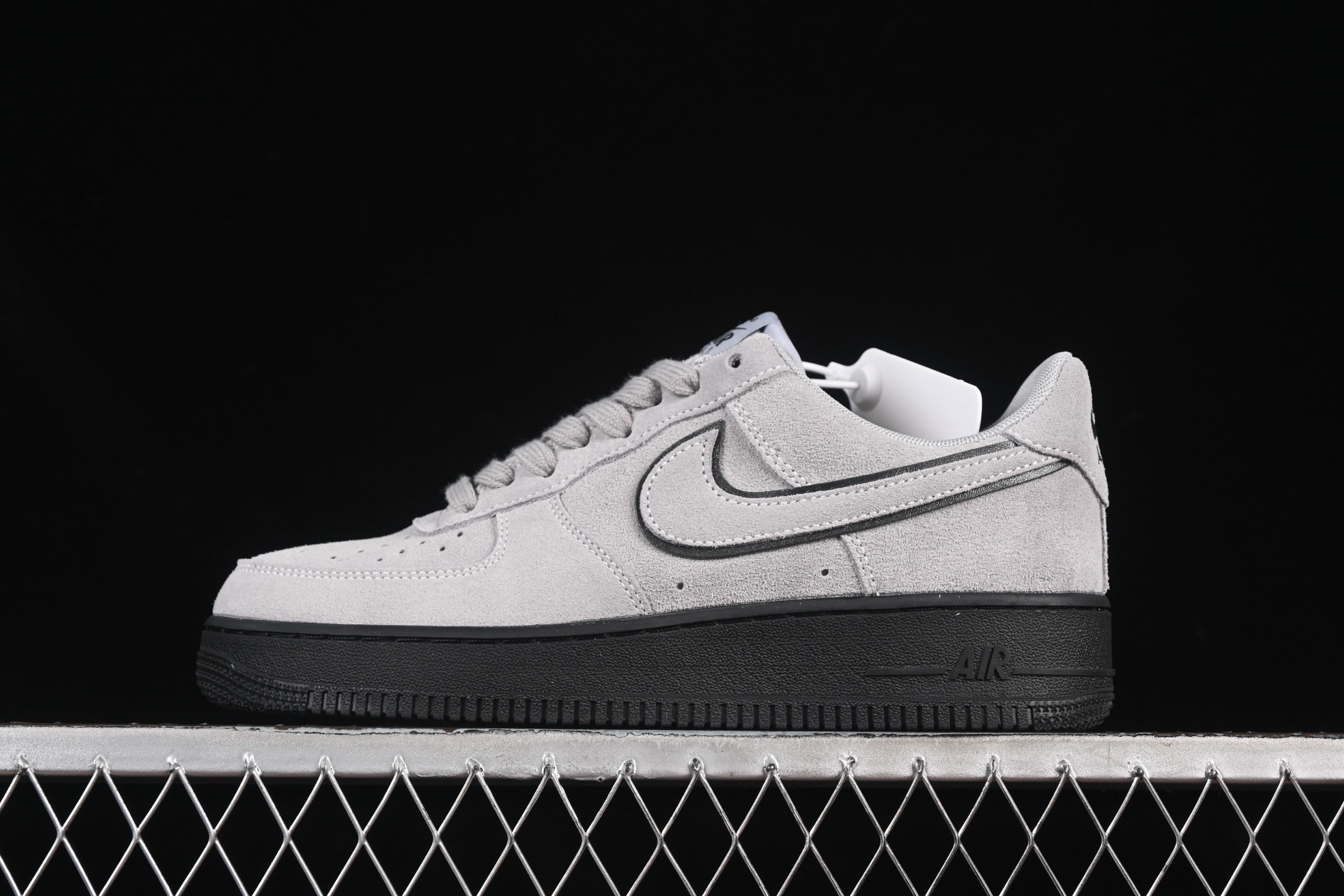 La tige de la chaussure est confectionnée en daim de couleur gris clair, offrant une texture douce et un aspect luxueux. Ce choix de matériau confère à la sneaker une allure sophistiquée tout en restant fidèle à l’esthétique emblématique de la Air Force 1. Les empiècements en daim sont soigneusement assemblés pour assurer durabilité et confort.