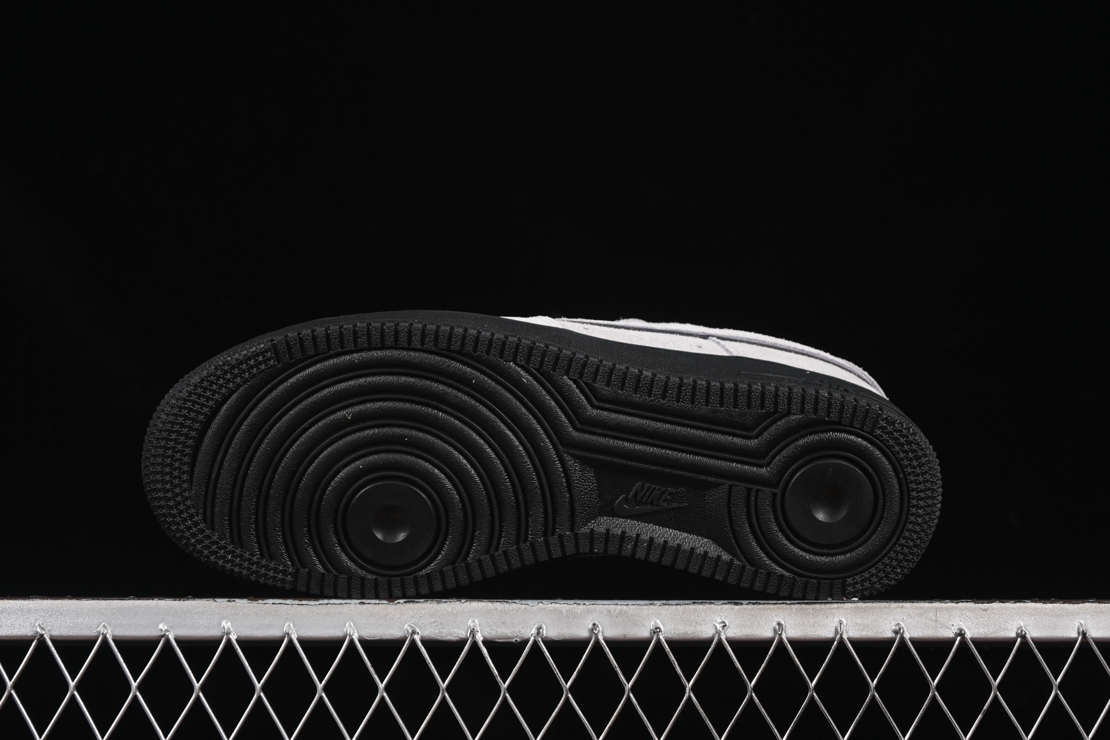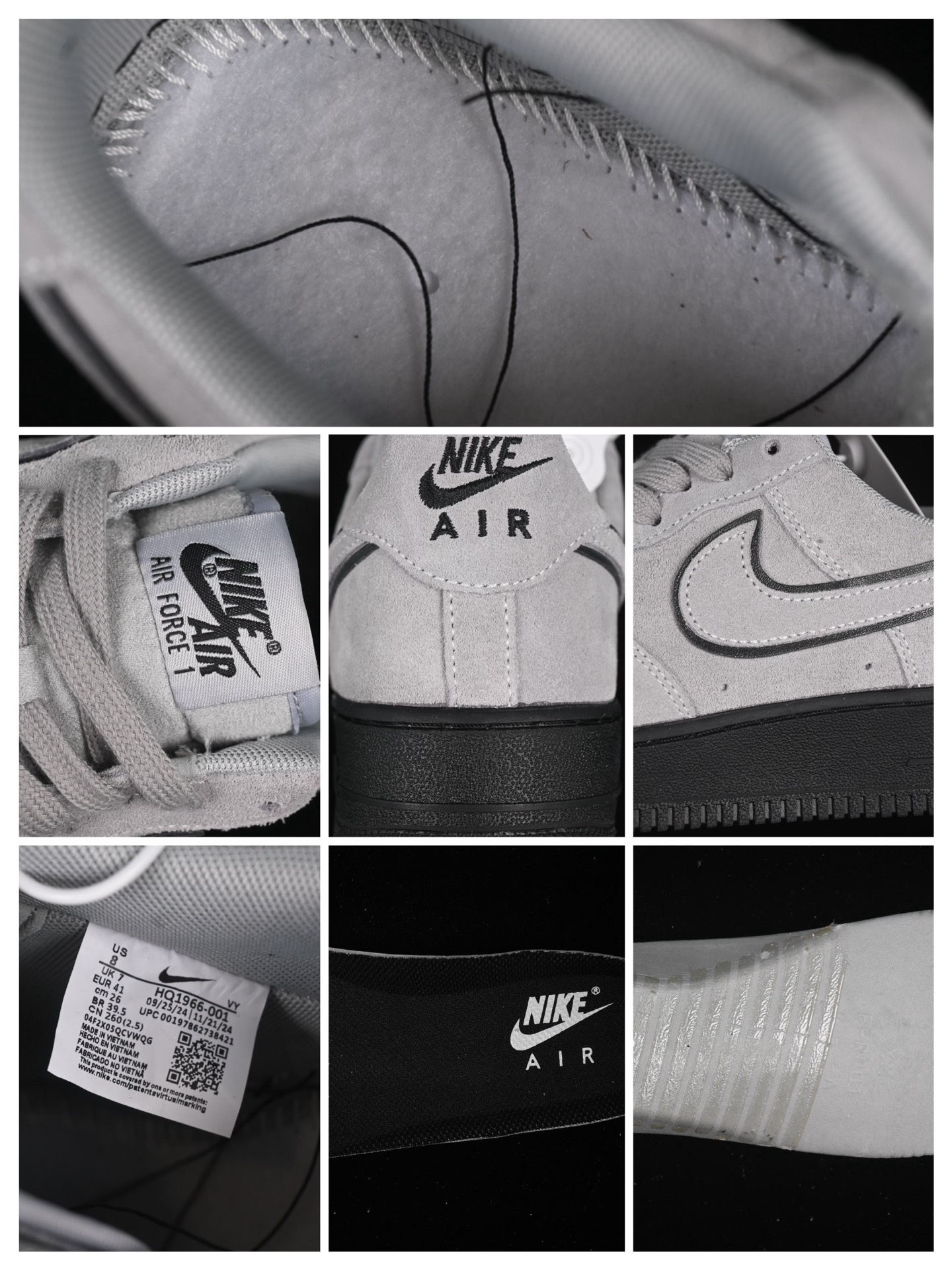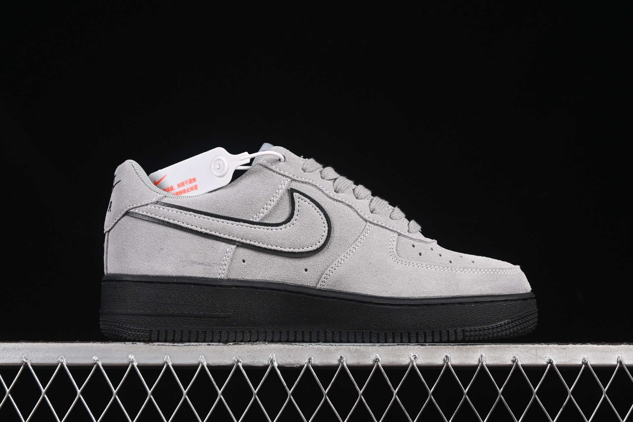 La tige de la chaussure est confectionnée en daim de couleur gris clair, offrant une texture douce et un aspect luxueux. Ce choix de matériau confère à la sneaker une allure sophistiquée tout en restant fidèle à l’esthétique emblématique de la Air Force 1. Les empiècements en daim sont soigneusement assemblés pour assurer durabilité et confort.