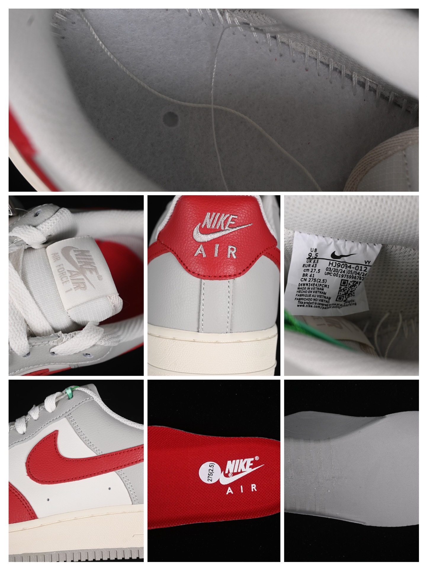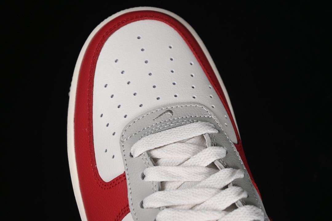 La tige est fabriquée en cuir de haute qualité, garantissant durabilité et confort. La couleur principale de la chaussure est un gris clair (Phantom), complétée par des accents rouge vif (Gym Red) sur la languette, le talon et le logo Nike Swoosh, ajoutant une touche dynamique au design sobre.