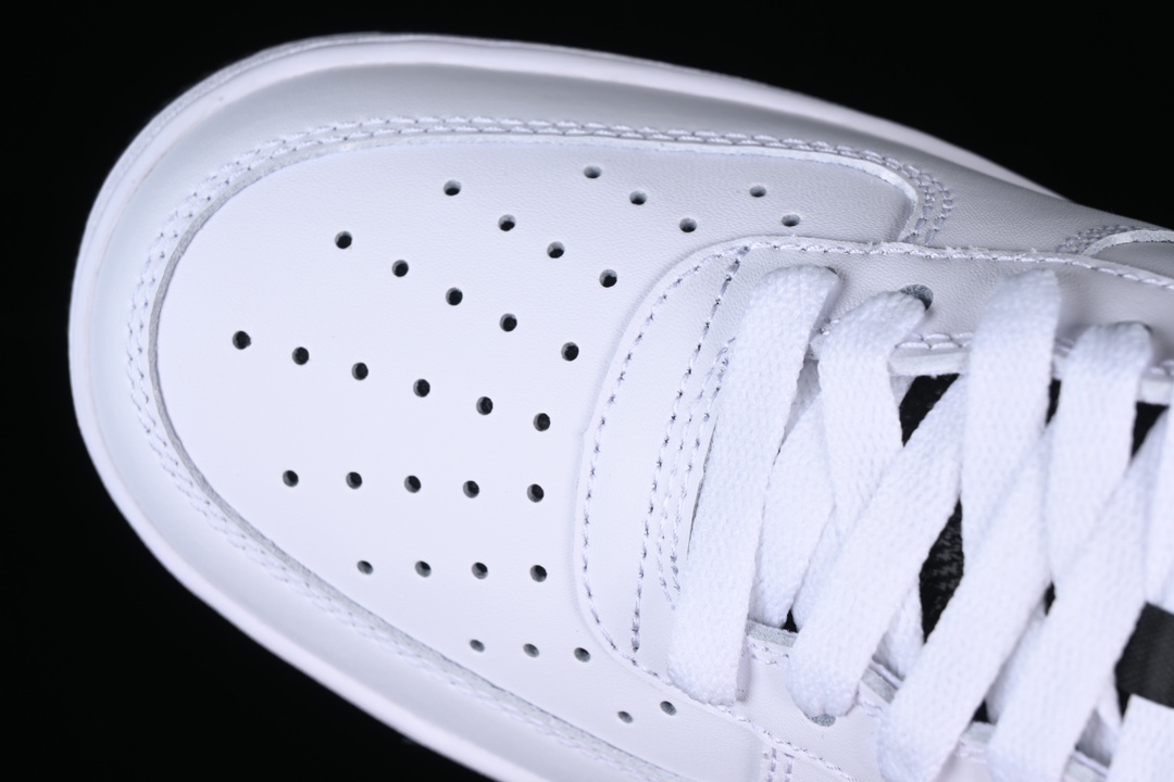 La tige de la chaussure est principalement en cuir blanc, ce qui lui confère un aspect classique et intemporel. Des détails en daim bleu nuit sont présents sur le talon et le Swoosh emblématique de Nike sur les côtés. Ces touches de couleur ajoutent une touche de sophistication à la chaussure.