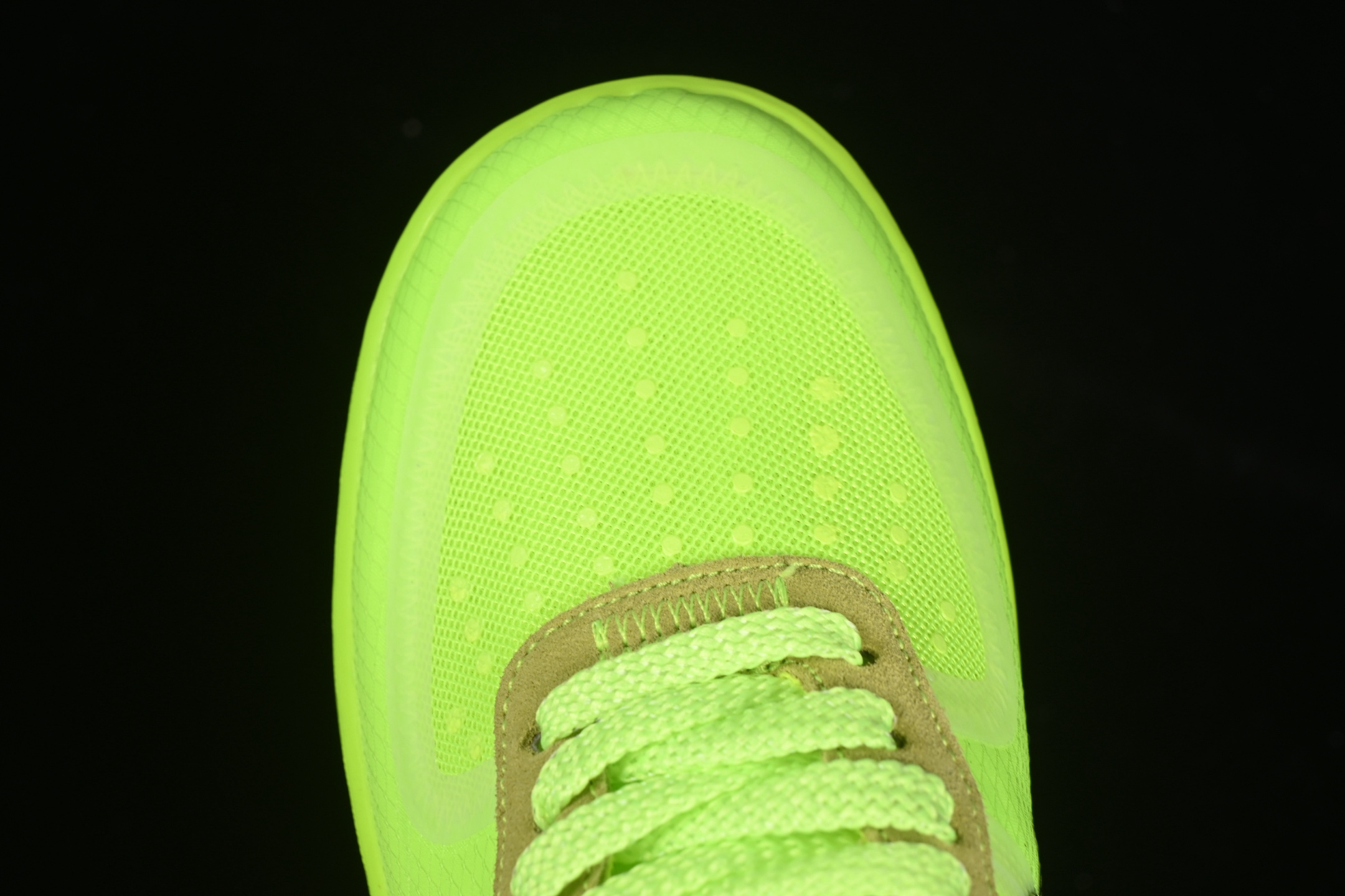 La tige est fabriquée en mesh et en matériaux synthétiques, offrant à la fois respirabilité et durabilité. Les coutures apparentes et les éléments déstructurés ajoutent une touche avant-gardiste au design. Sur le côté, on retrouve le Swoosh de Nike en noir, contrastant fortement avec le fond volt, et fixé par des coutures visibles qui accentuent l’esthétique industrielle.