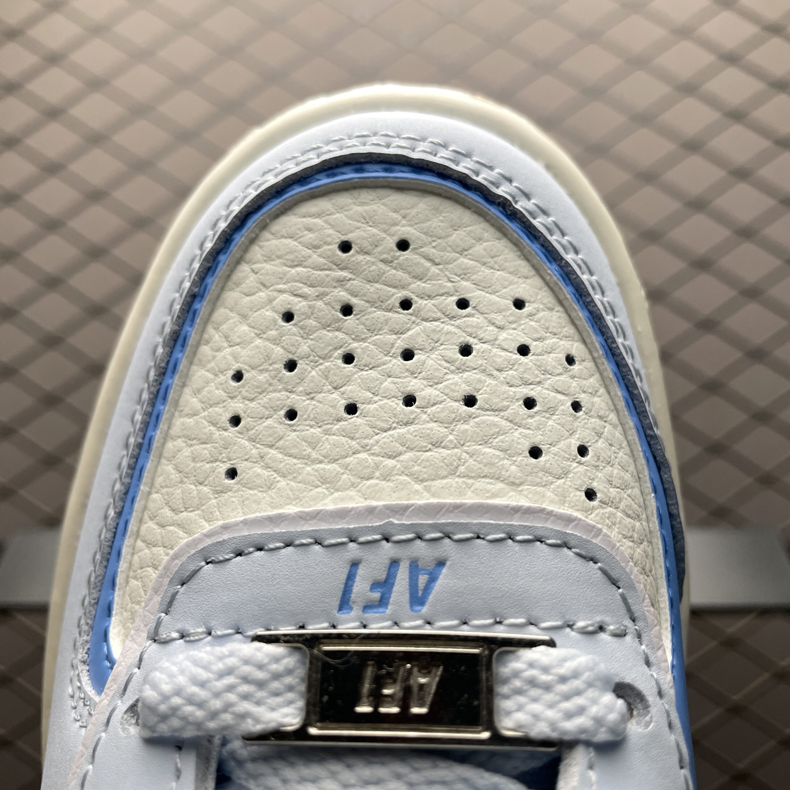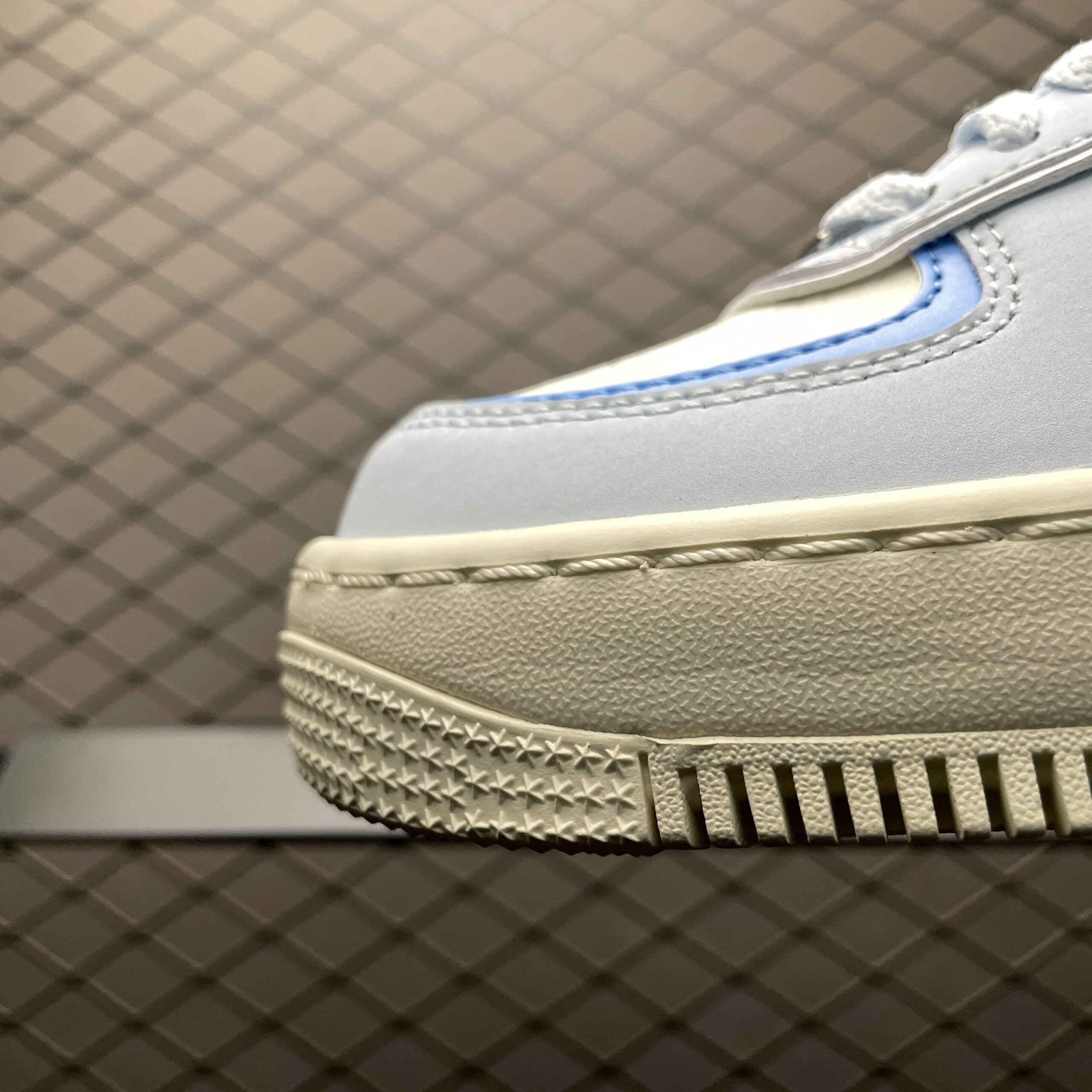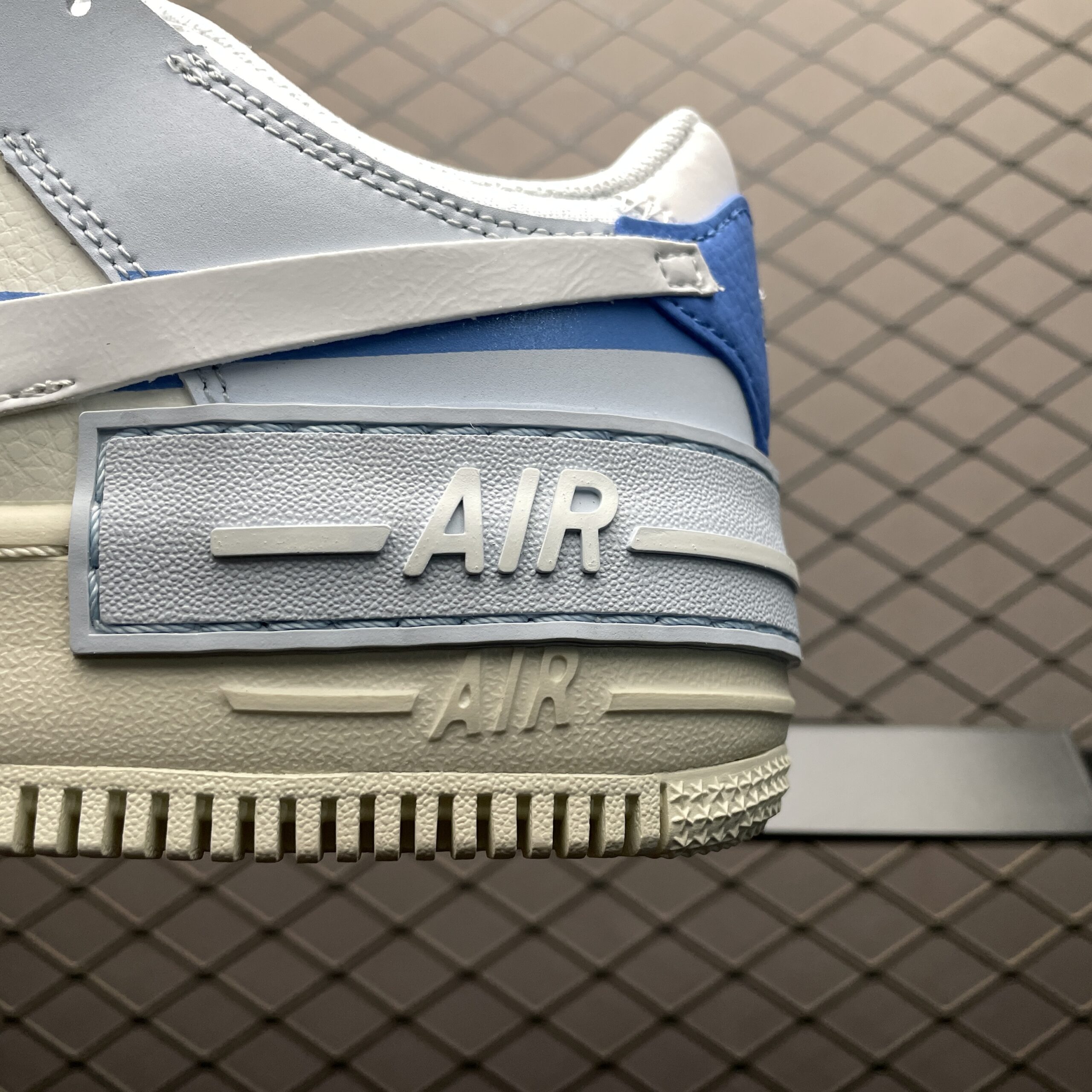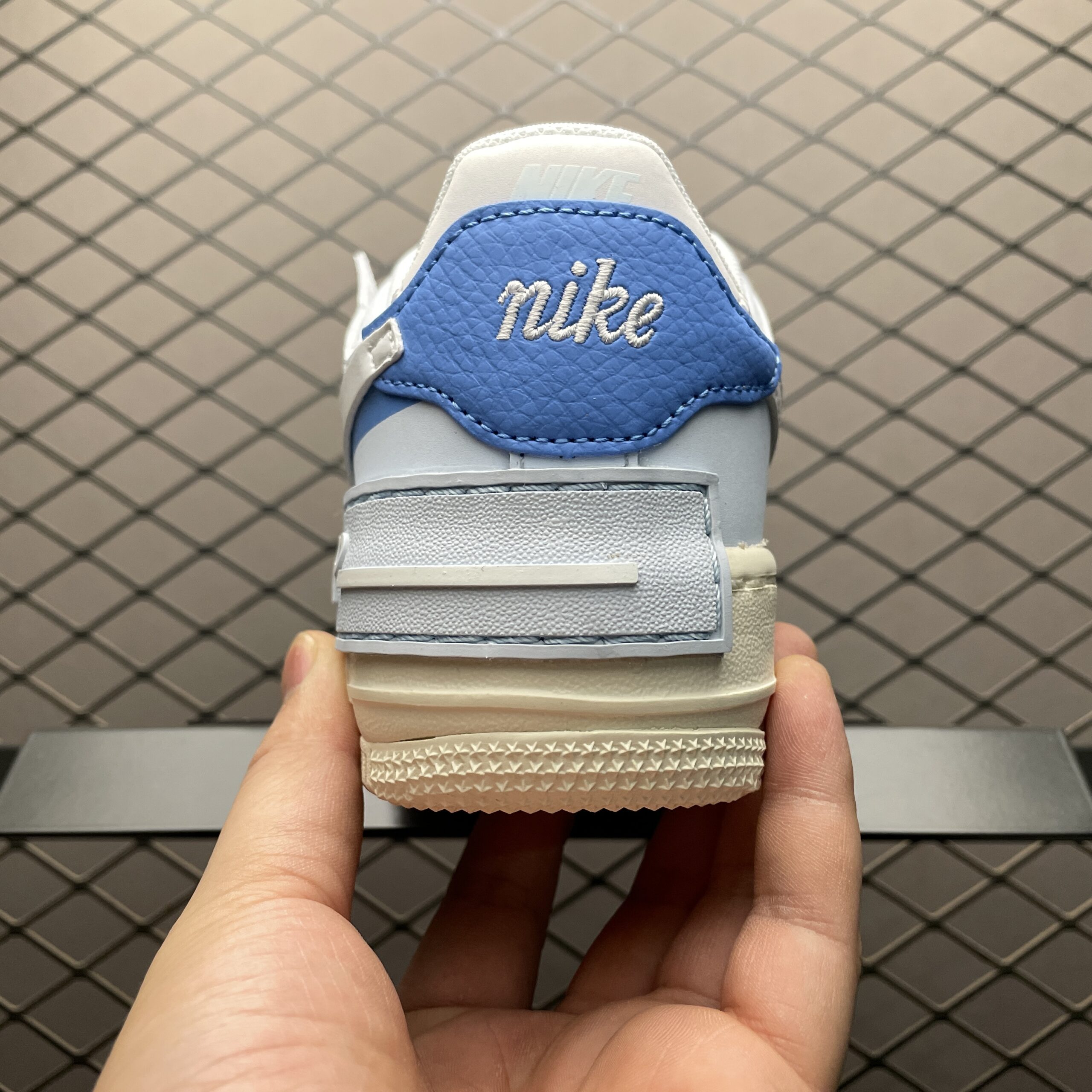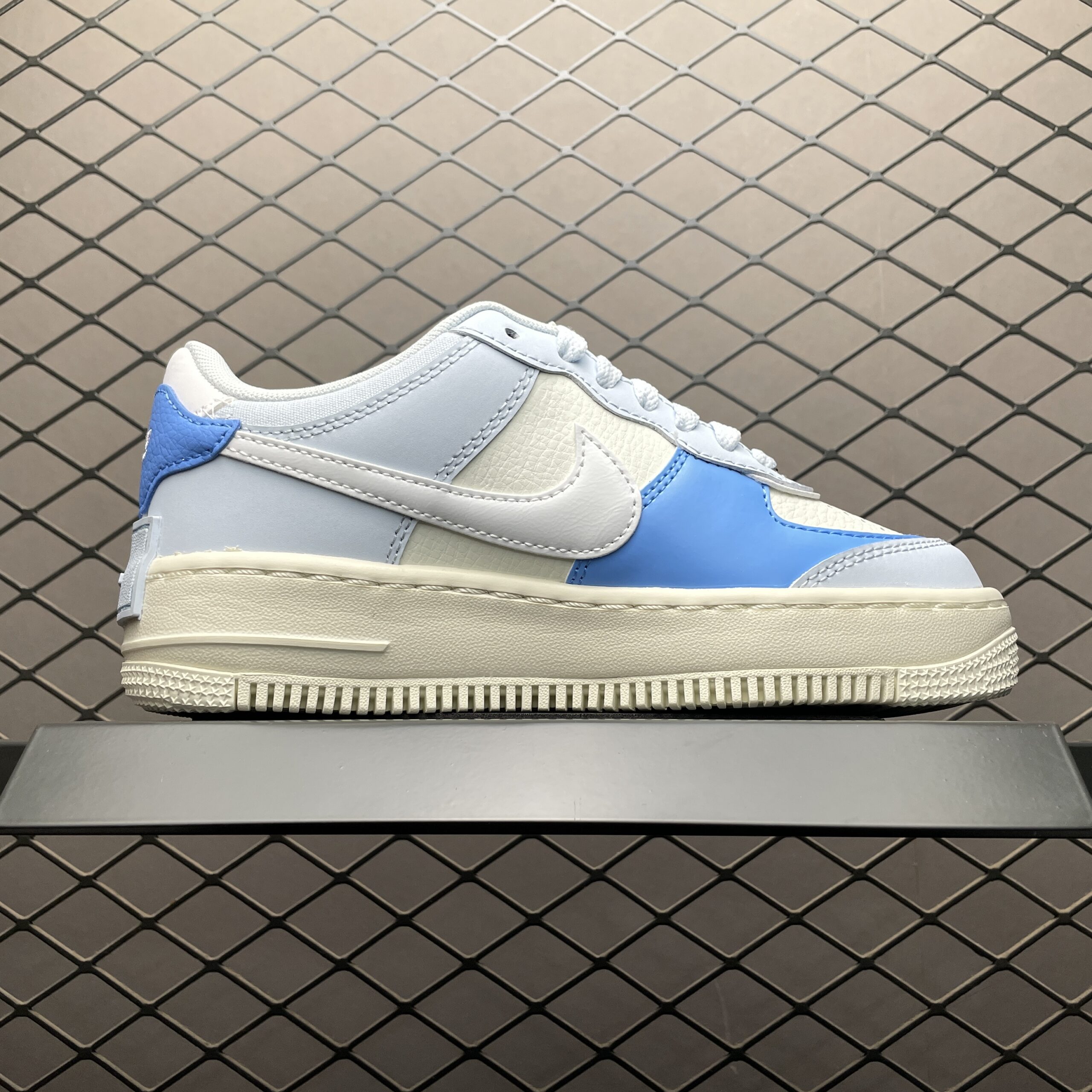 La Nike Air Force 1 Low Shadow Blue Tint University Blue (référence DZ1847-400) est une déclinaison moderne et audacieuse de la silhouette classique Air Force 1. Ce modèle se distingue par son design multicouche qui ajoute de la profondeur et du dynamisme à la chaussure. La tige est principalement composée de cuir de haute qualité, offrant durabilité et confort. La palette de couleurs combine des teintes de bleu clair (Blue Tint) et de bleu universitaire (University Blue), créant un contraste subtil mais accrocheur.