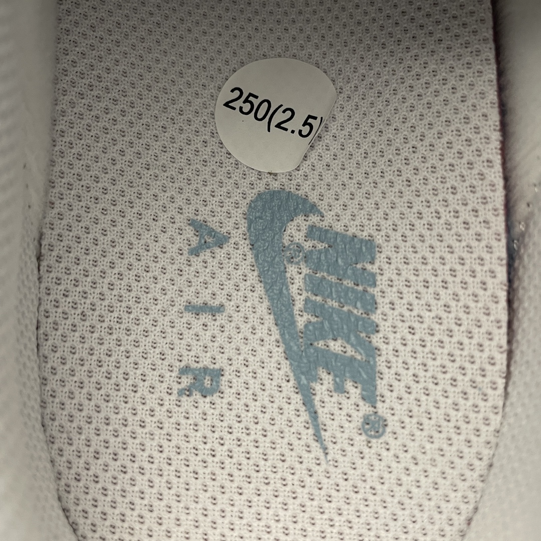 L’élément le plus remarquable de cette version est le mini Swoosh brodé sur le côté de la chaussure, juste au-dessus de la semelle intermédiaire, qui ajoute une touche unique sans surcharger le design. Ce mini Swoosh est teinté d’un bleu clair délicat, contrastant subtilement avec le blanc dominant de la chaussure, ce qui lui confère une allure fraîche et attrayante.