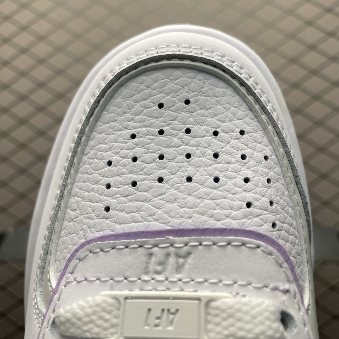 La chaussure est fabriquée avec une combinaison de matériaux de haute qualité, incluant du cuir lisse pour la majorité de l’extérieur, avec des superpositions en cuir verni dans les tons lilas pour accentuer son aspect visuel. La semelle intermédiaire, fidèle à la tradition des Air Force 1, est robuste et offre un excellent amorti, tandis que la semelle extérieure est conçue pour une traction et une durabilité optimales.