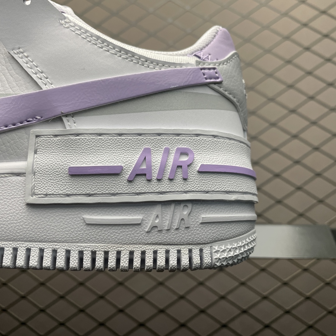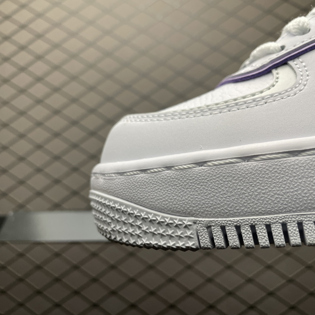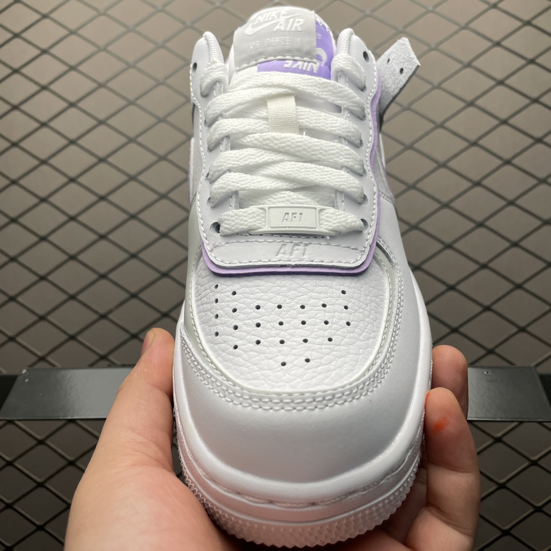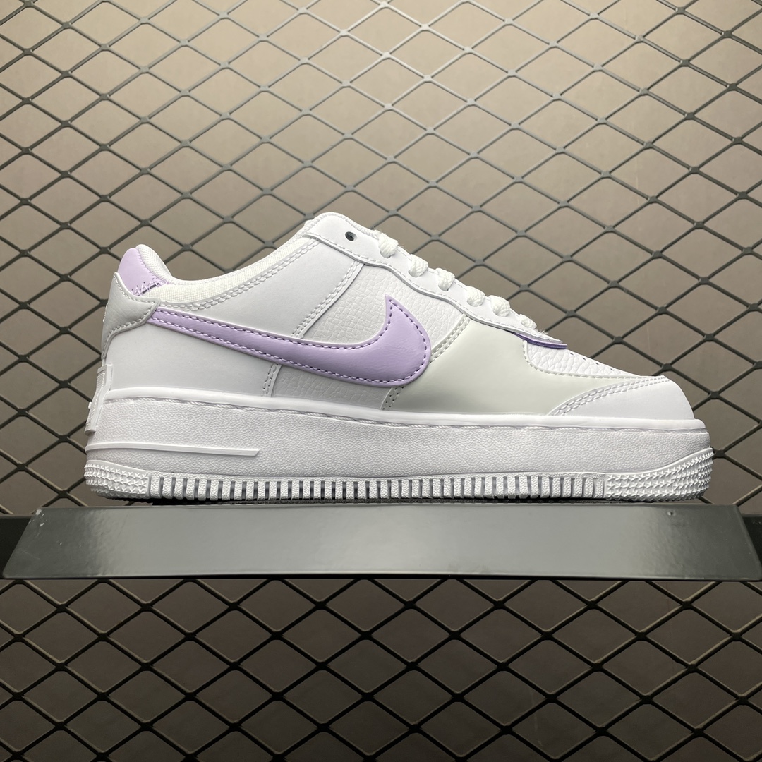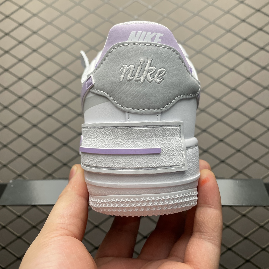 Les détails distinctifs incluent le double Swoosh sur les côtés, un pour chaque couleur, blanc et lilas, ainsi que le logo « AIR » sur la semelle intermédiaire et le nom « Shadow » qui fait référence à l’effet d’ombre créé par les superpositions de matériaux. Les lacets sont blancs, assortis à la base de la chaussure, et la languette arbore également le logo Nike Air en lilas, cohérent avec le thème de couleur.