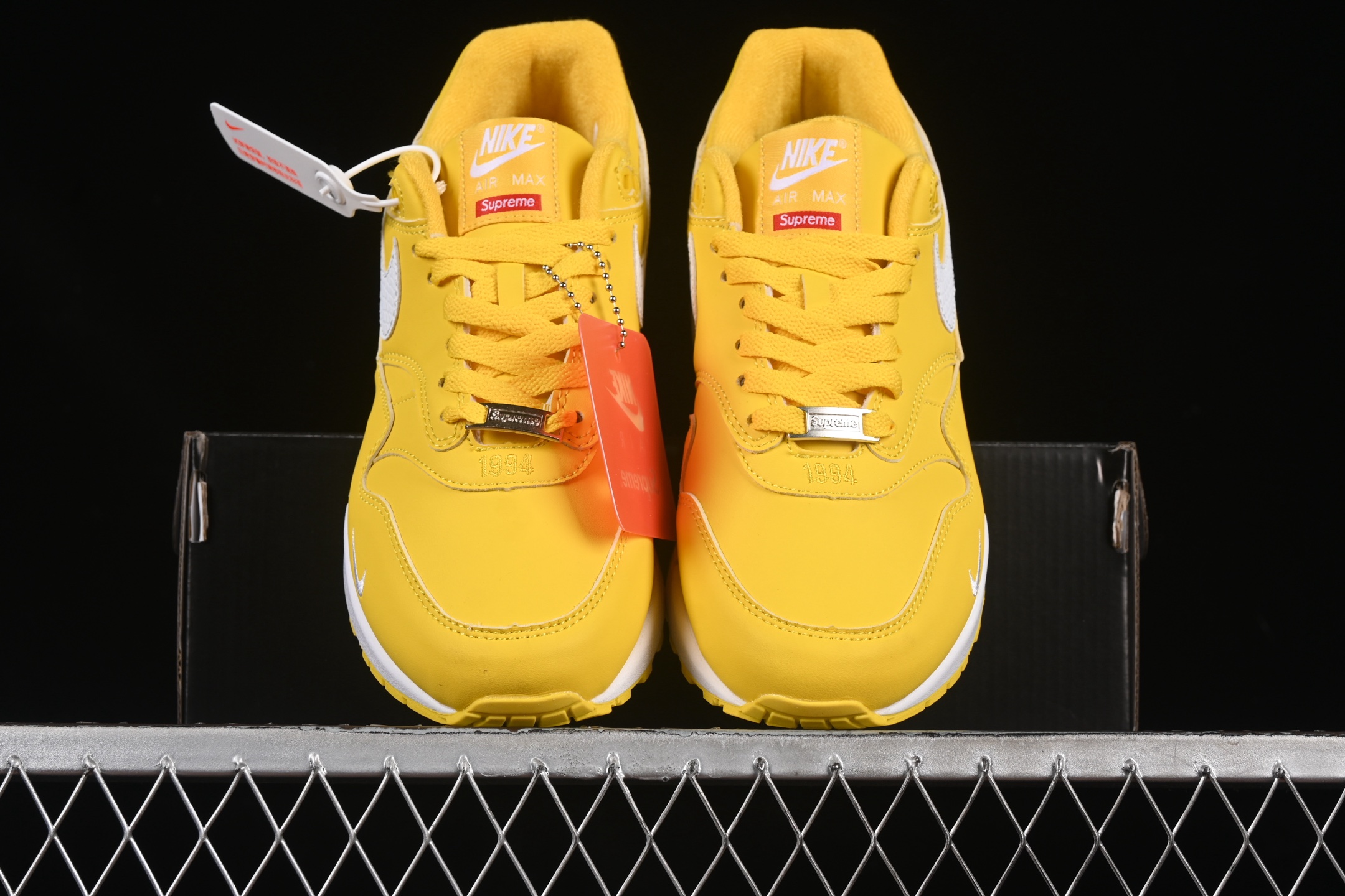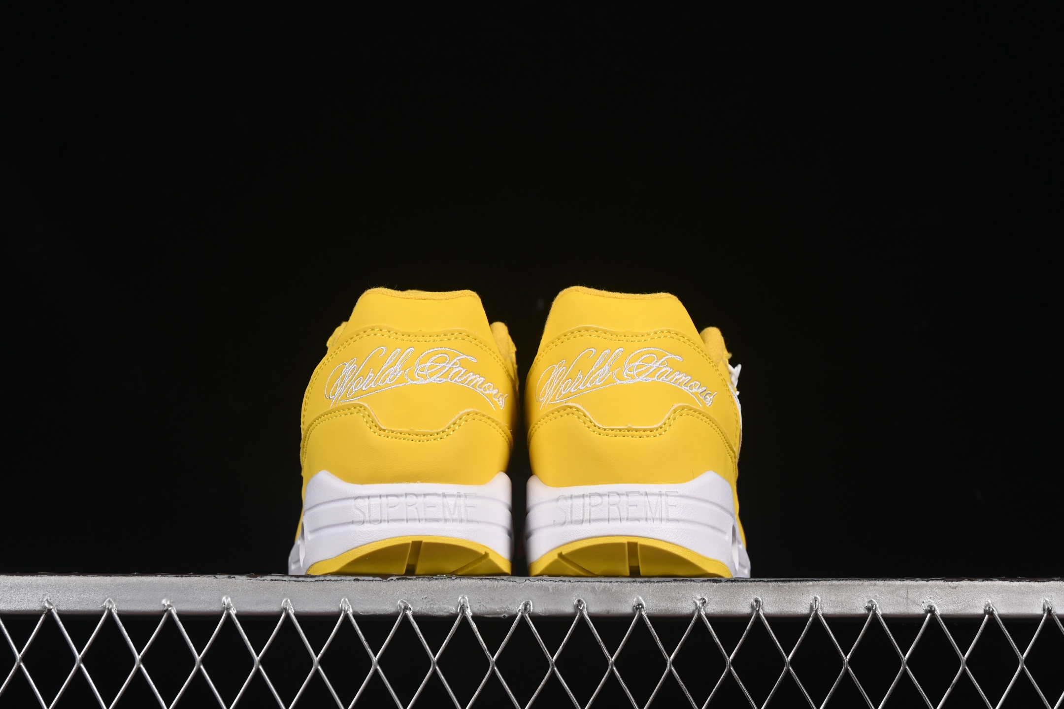 Des détails subtils mais distinctifs, tels que le co-branding Nike et Supreme, sont présents sur la languette et le talon, soulignant l’exclusivité de cette collaboration. Les lacets, également en jaune, complètent l’esthétique monochrome de la chaussure.