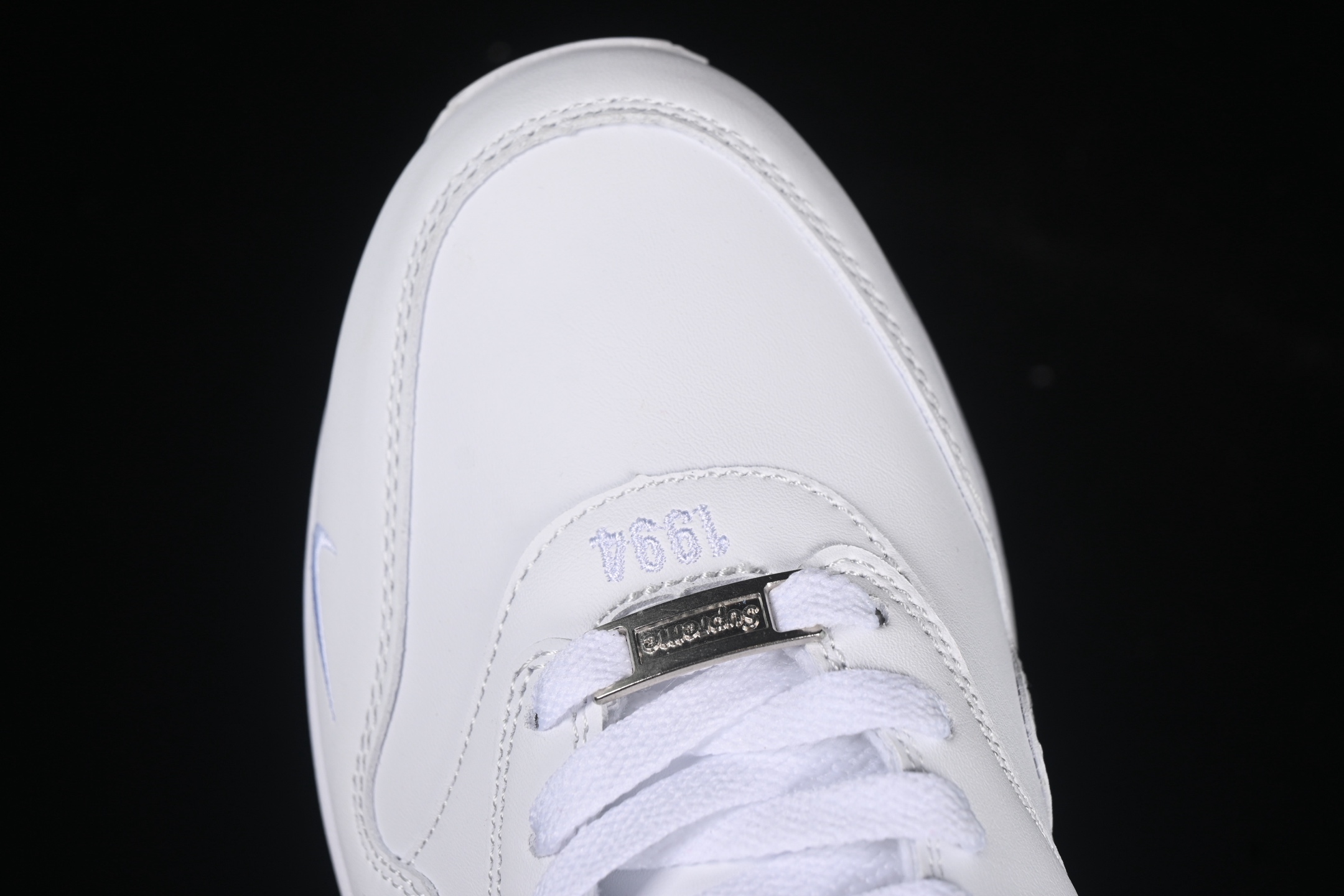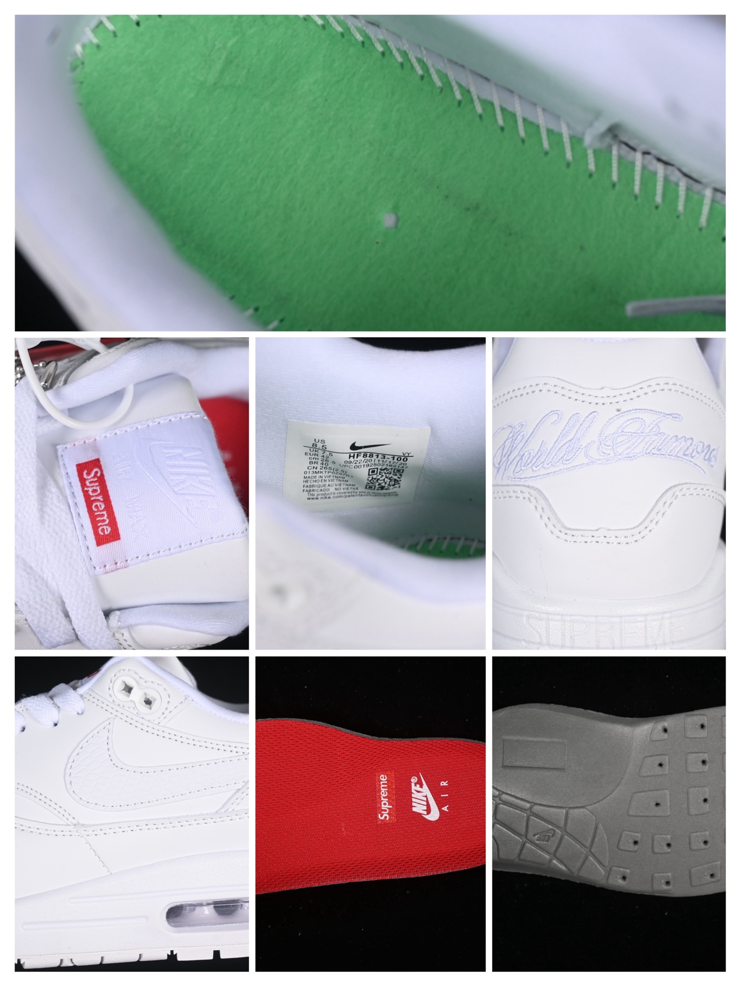 La tige de la chaussure est confectionnée en cuir de haute qualité, assurant durabilité et confort. Les perforations stratégiquement placées sur l’empeigne permettent une meilleure aération, garantissant ainsi une sensation de fraîcheur tout au long de la journée. Le logo emblématique de Nike, le Swoosh, est subtilement intégré sur les côtés, tandis que le branding Supreme ajoute une touche de prestige et d’exclusivité.