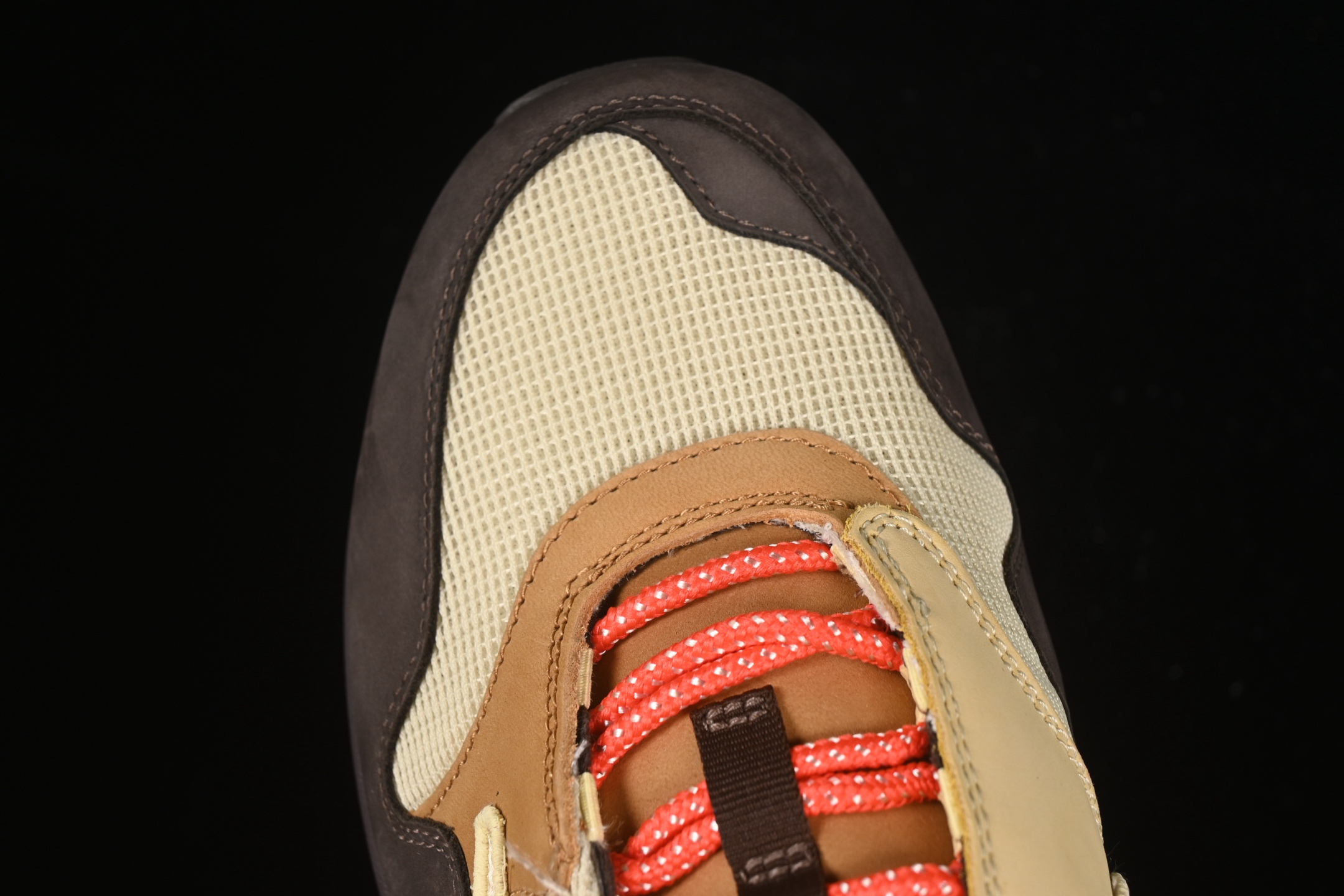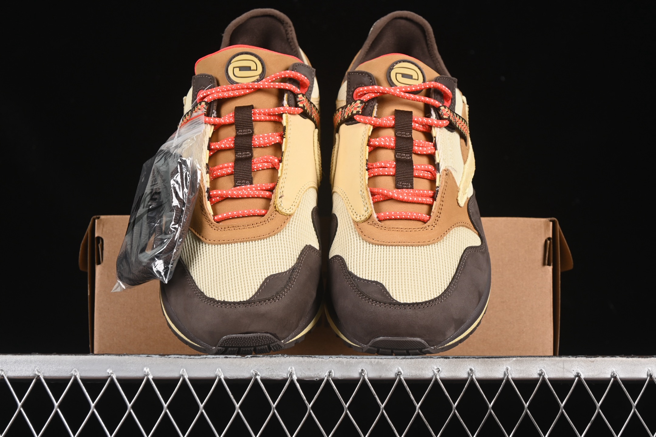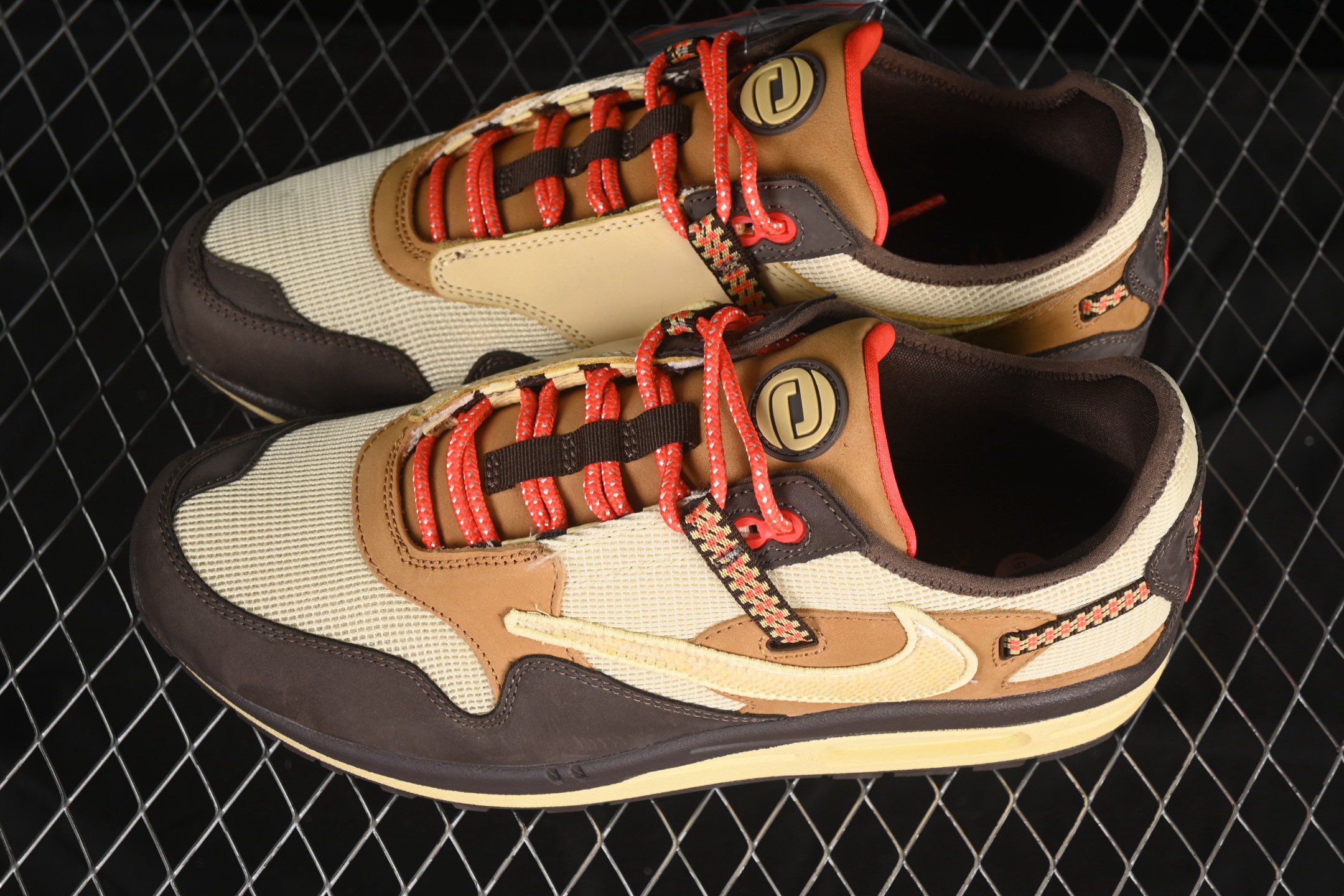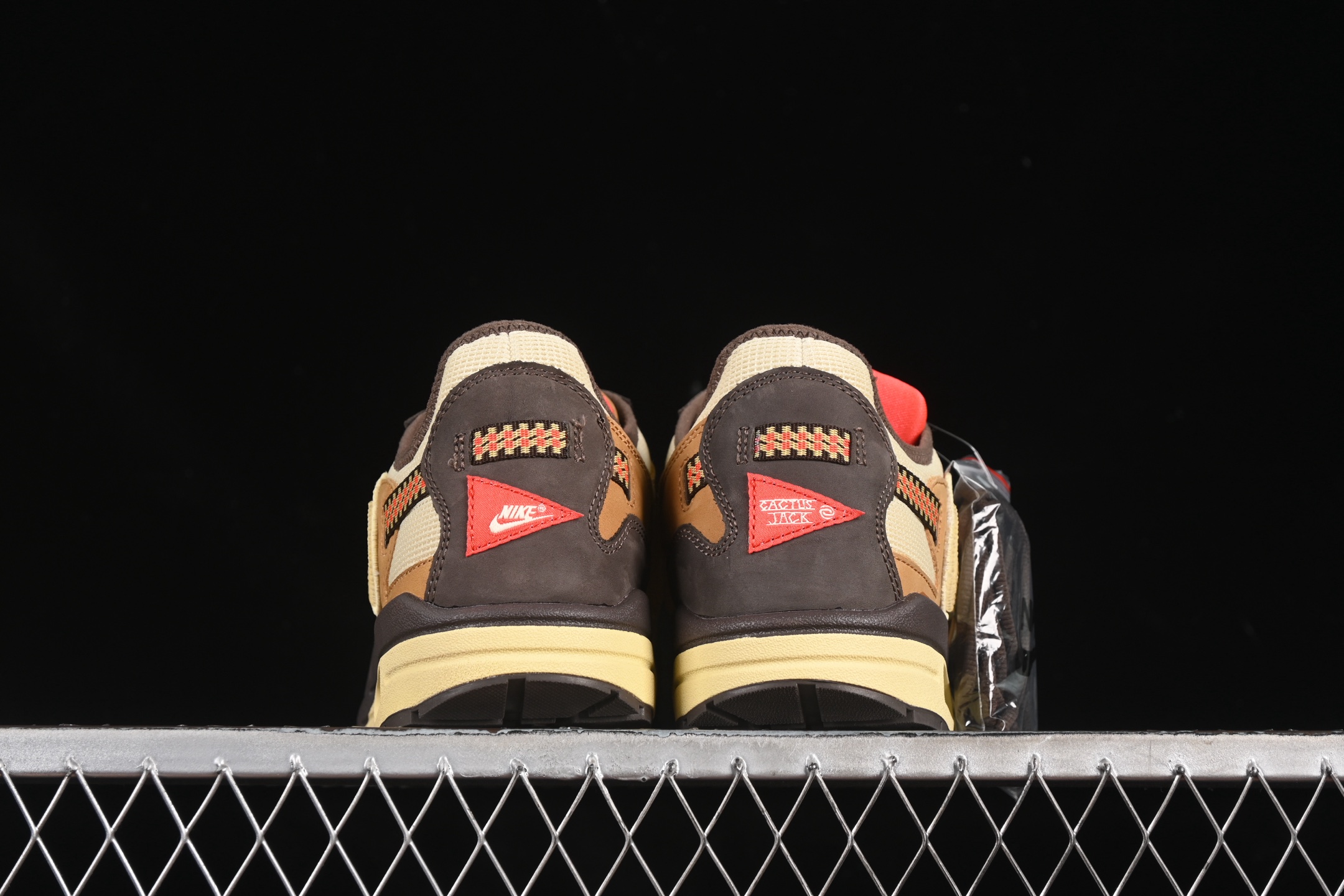 Un des éléments distinctifs de cette édition est le Swoosh inversé, signature de Travis Scott, qui apporte une touche audacieuse et reconnaissable instantanément. Les détails supplémentaires incluent des accents rouges et des touches de jaune, qui ajoutent du contraste et de la profondeur au design global.