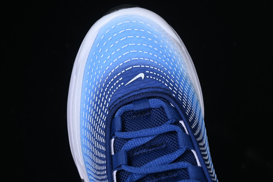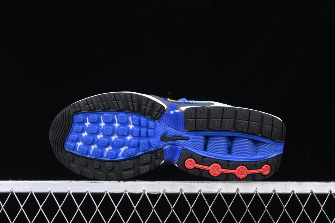 Le design de la chaussure se distingue par sa palette de couleurs audacieuses. Le bleu Racer Blue domine la tige, apportant une touche dynamique et énergique, tandis que des accents de jaune vibrant ajoutent un contraste saisissant, soulignant les lignes et les détails de la chaussure. La semelle intermédiaire blanche offre un équilibre visuel et met en valeur l’unité Air Max visible au talon, signature emblématique de la marque.