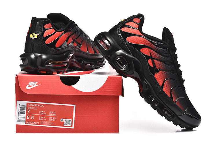 Les détails rouges sur la tige et la semelle intermédiaire contrastent élégamment avec le noir dominant, créant un effet visuel saisissant. Le logo Swoosh de Nike, également en rouge, est placé sur les côtés, ajoutant une touche de reconnaissance instantanée. La Nike Air Max Plus Bred Black Red DM0032-021 est non seulement une déclaration de mode, mais aussi un choix pratique pour ceux qui recherchent confort et style dans une seule paire de chaussures.