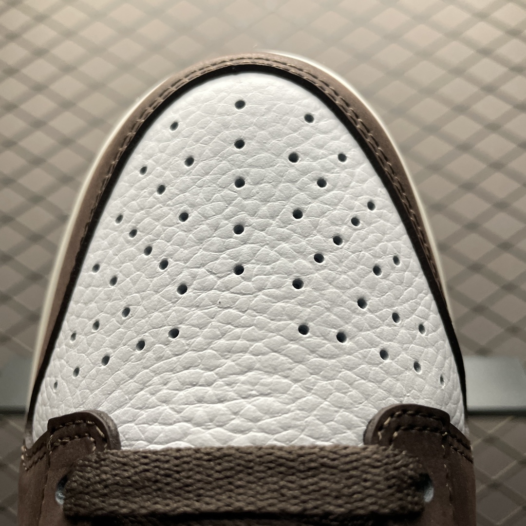 La tige de la chaussure est fabriquée principalement à partir de cuir synthétique, avec des éléments en cuir véritable pour une touche de qualité et de durabilité. La couleur dominante est le Baroque Brown, présent sur la majorité de la tige, complétée par des accents blancs sur les swoosh, la languette et le talon. Des touches de noir sont également visibles sur la doublure intérieure et la semelle extérieure.