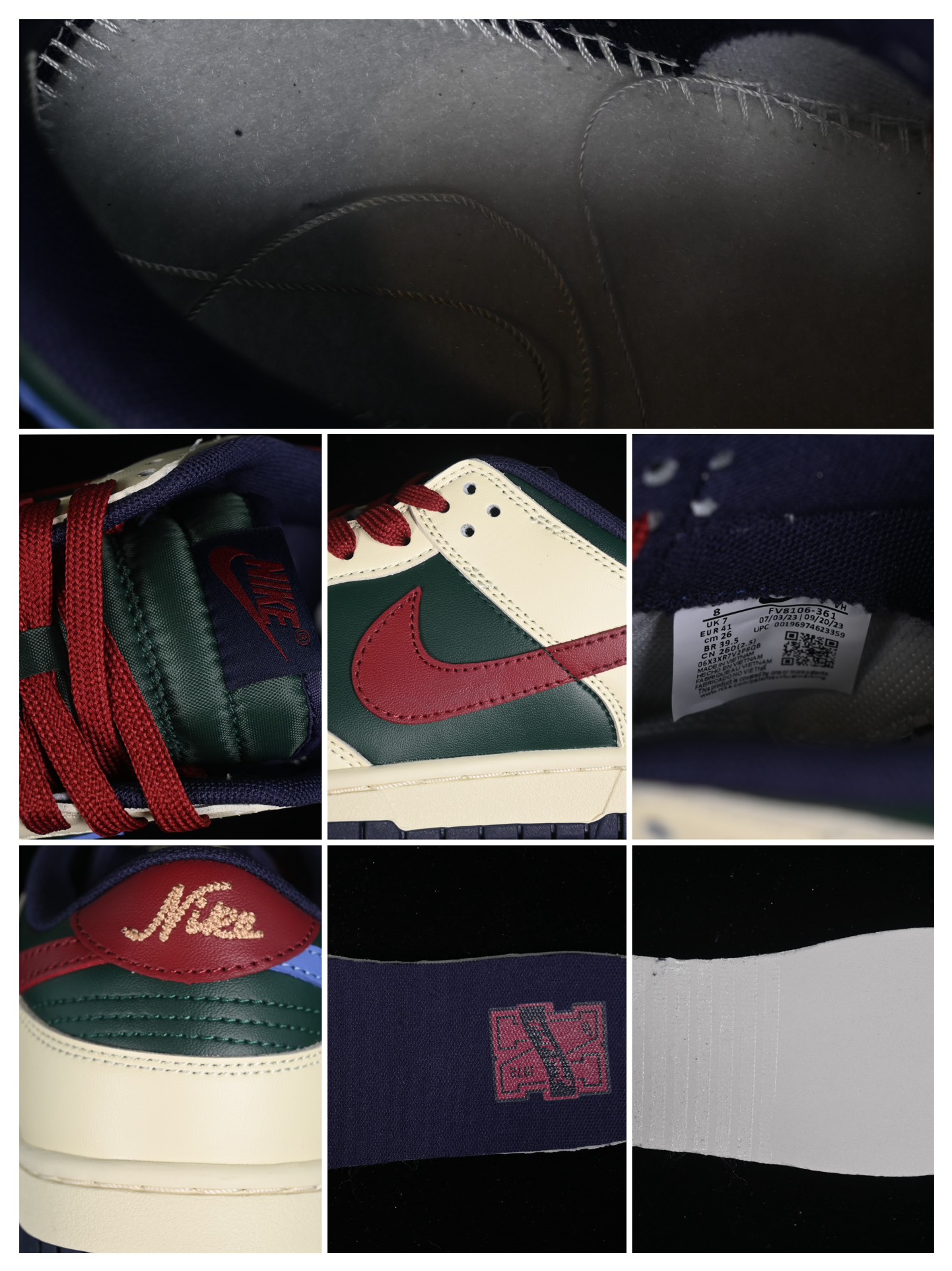 La tige est fabriquée en cuir de haute qualité, présentant une base de couleur verte sapin (Fir Green) avec des superpositions en cuir blanc. Cette combinaison de couleurs offre un contraste saisissant et une allure à la fois vintage et contemporaine. Les perforations sur la zone des orteils assurent une bonne ventilation, rendant la chaussure adaptée à un usage quotidien.