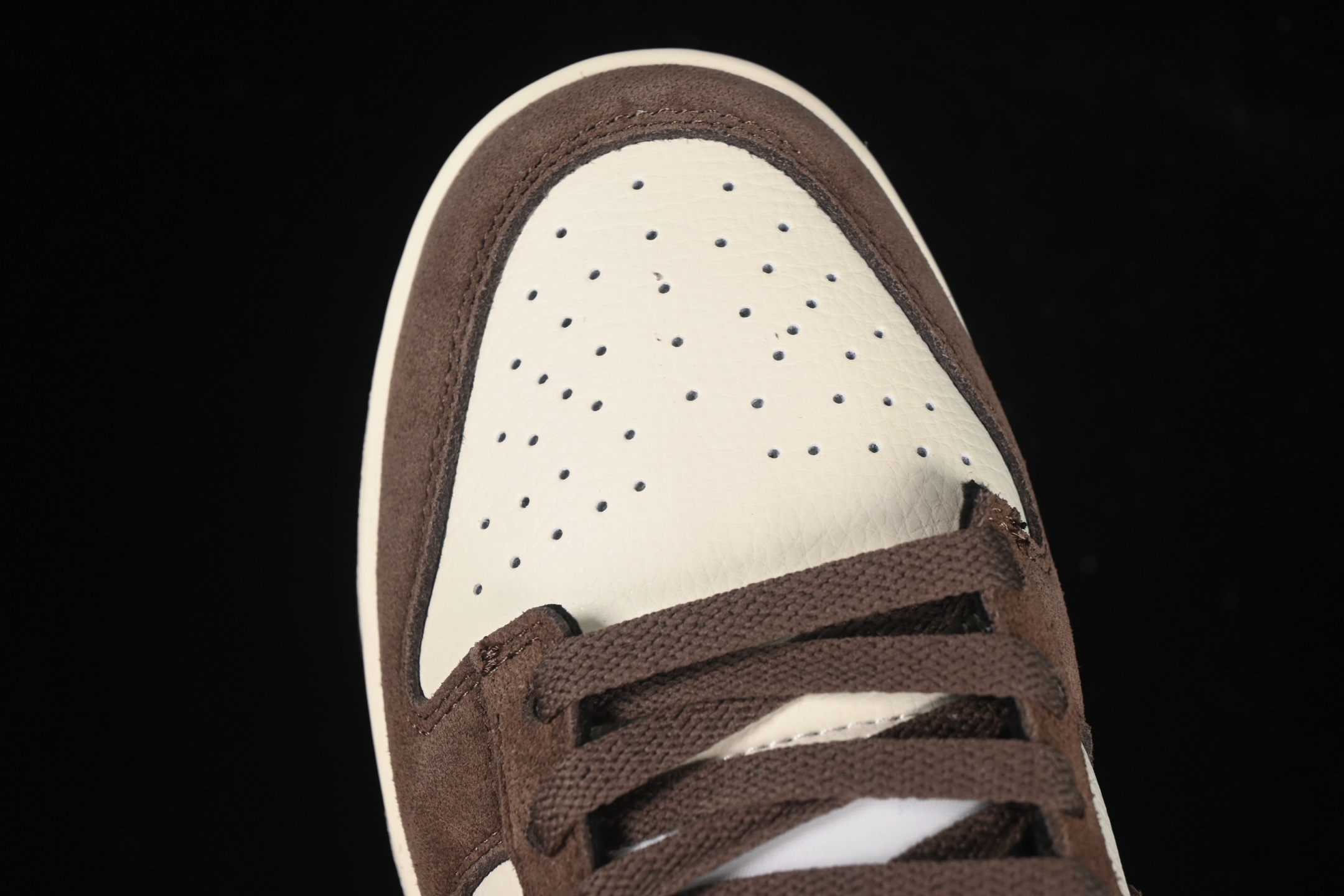 La tige de la chaussure est principalement en cuir, offrant à la fois durabilité et confort. La couleur Pale Ivory domine l’ensemble de la silhouette, apportant une touche de douceur et de sophistication. Les empiècements en cuir Baroque Brown ajoutent un contraste subtil mais efficace, soulignant les lignes classiques de la Dunk Low.