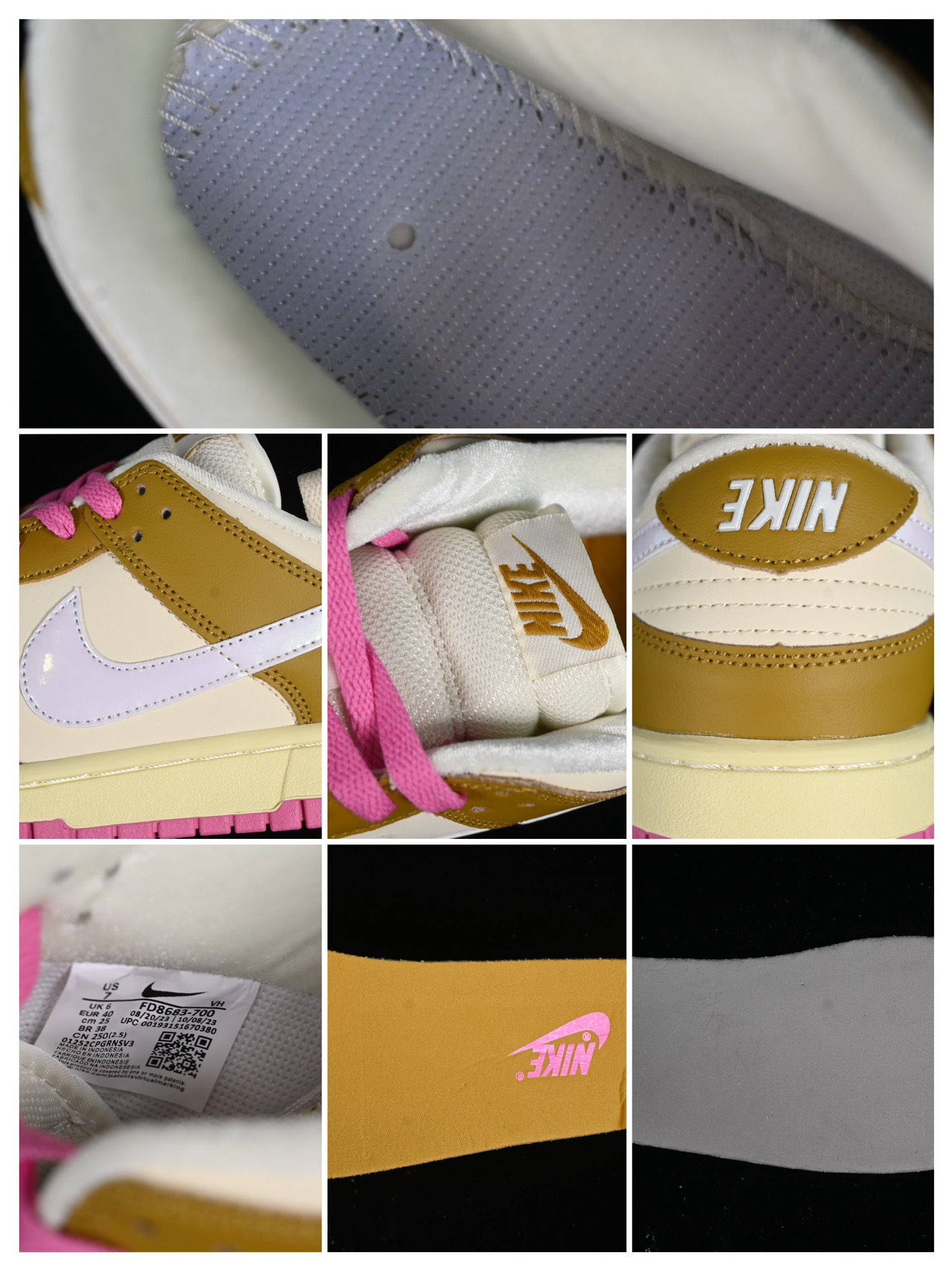 La chaussure présente une base en cuir de couleur bronzine, un ton métallique doux qui donne un aspect luxueux et raffiné. Les superpositions en cuir rose ajoutent un contraste saisissant, tandis que des touches de noir sur la languette, le swoosh, et le talon offrent une dimension supplémentaire au design.