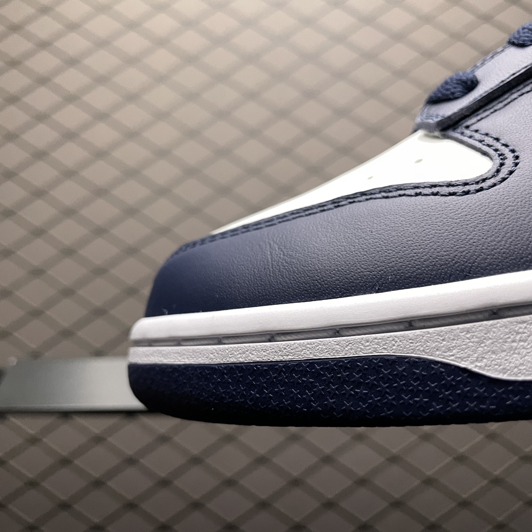 La semelle intermédiaire blanche assure un amorti optimal, garantissant un confort tout au long de la journée. La semelle extérieure en caoutchouc, de couleur bleu marine, offre une adhérence exceptionnelle sur diverses surfaces, rendant cette paire aussi fonctionnelle qu’esthétique. Les perforations sur la toebox assurent une bonne respirabilité, tandis que le logo emblématique de Nike, le Swoosh, se déploie sur les côtés en bleu marine, soulignant l’identité de la marque.