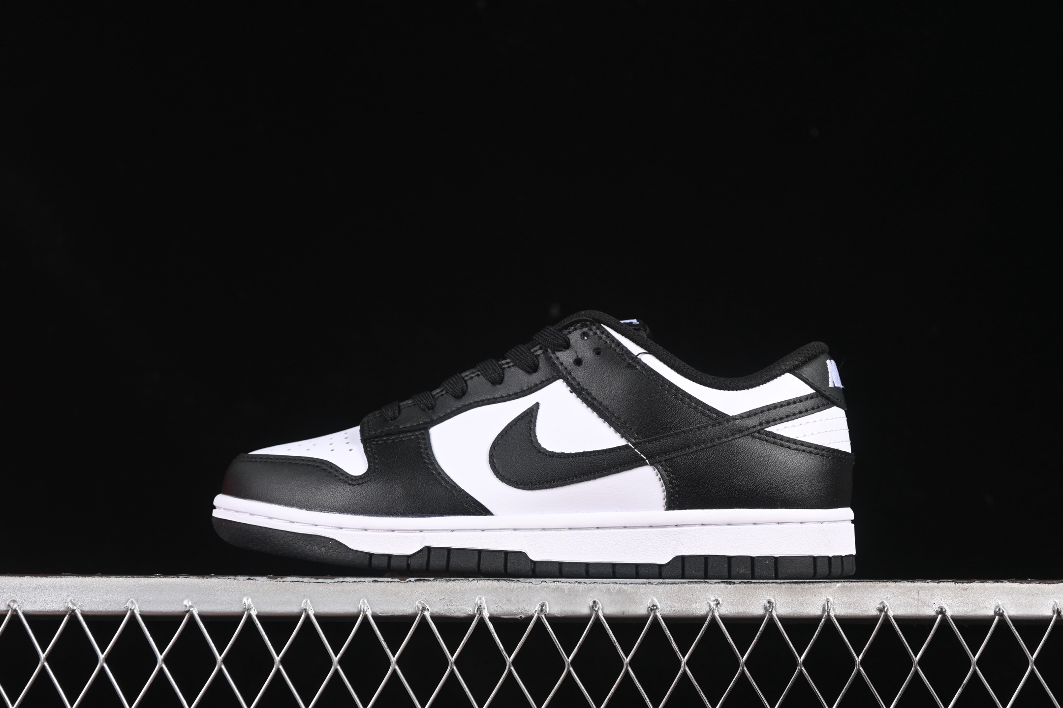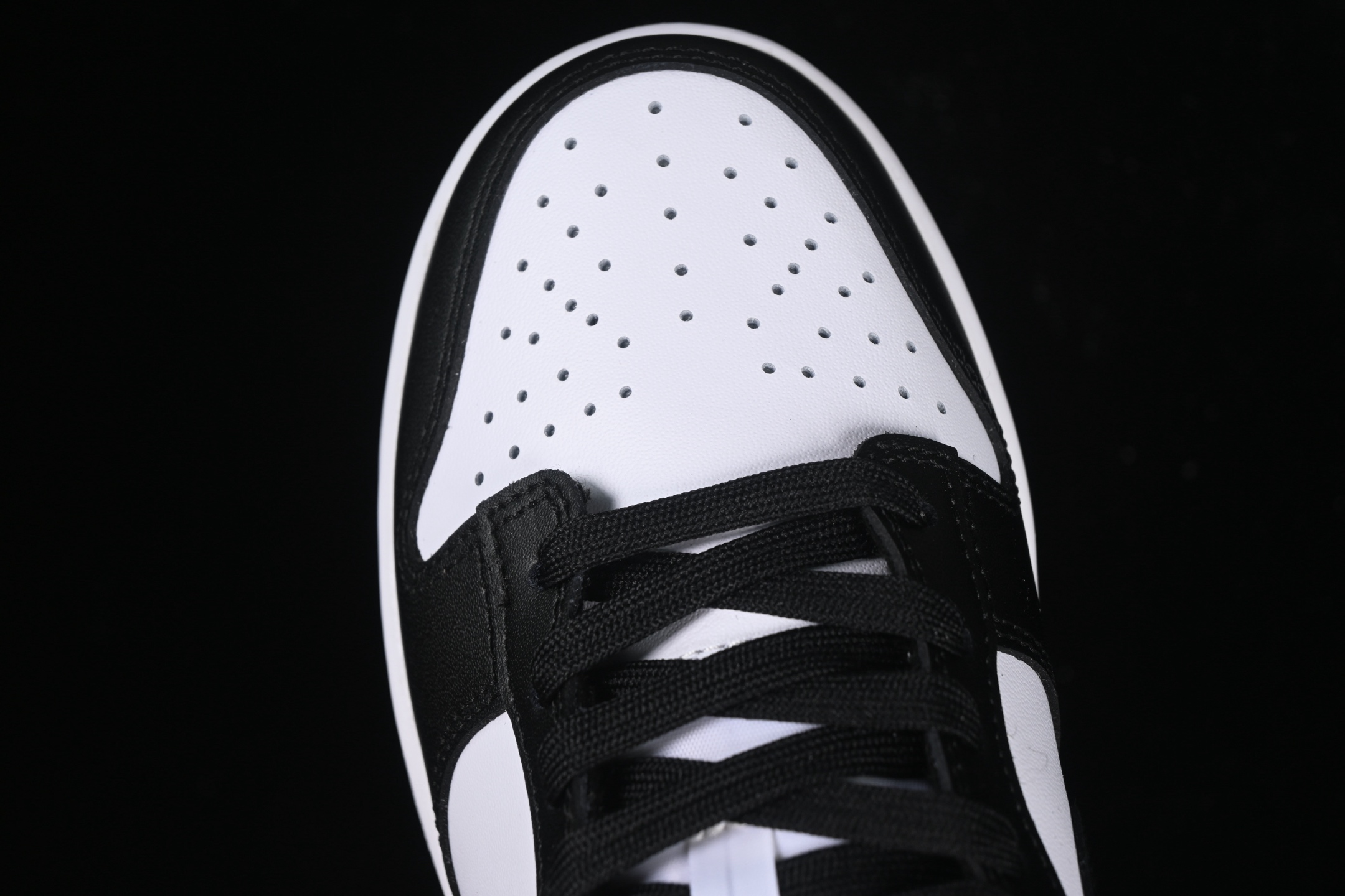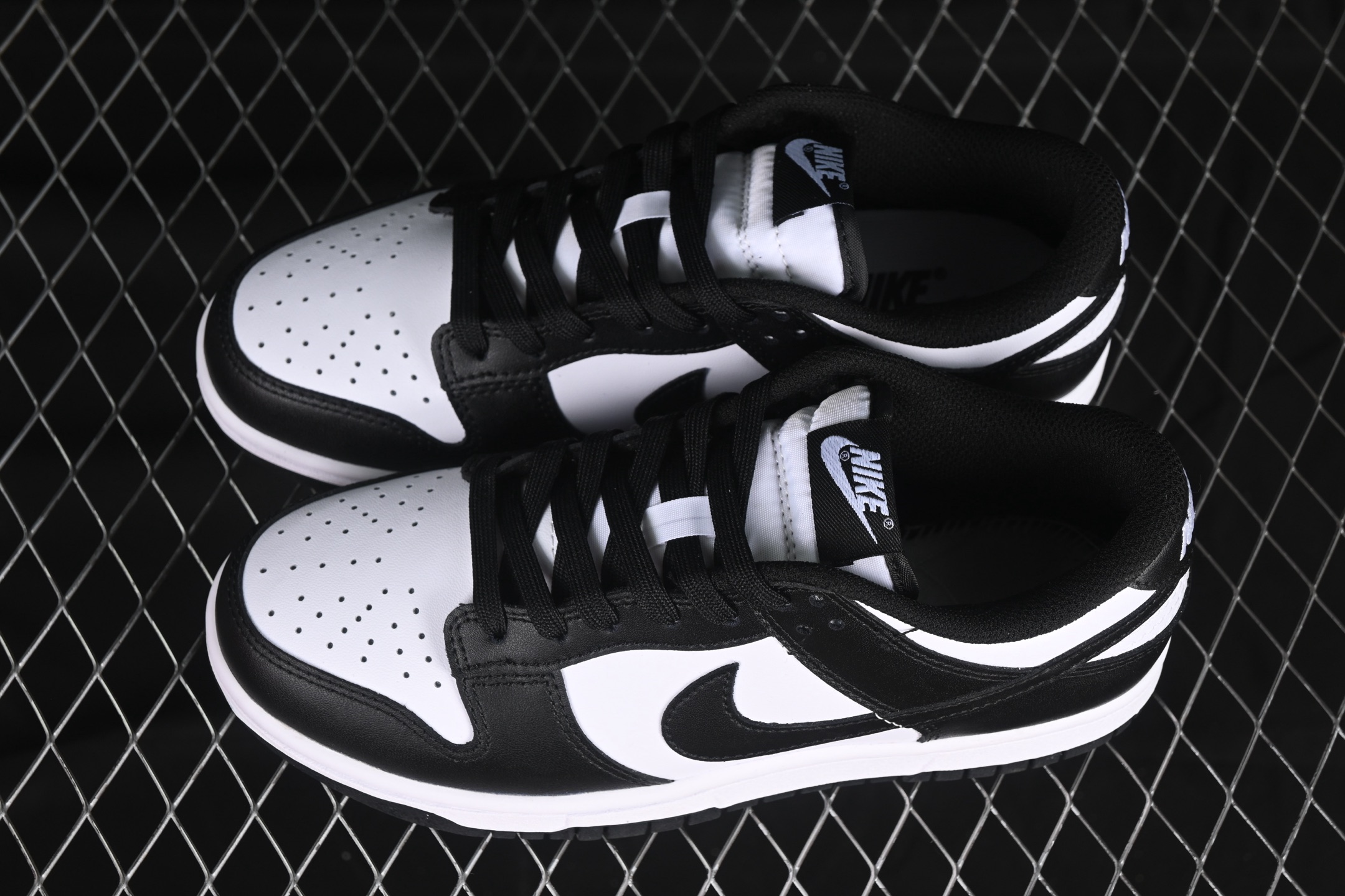 La tige de la chaussure est fabriquée en cuir de haute qualité, offrant à la fois durabilité et confort. Les empiècements noirs contrastent élégamment avec le fond blanc, créant un effet visuel saisissant qui rappelle le pelage distinctif du panda, d’où son surnom. Le logo emblématique de Nike, le Swoosh, est également en noir, se détachant nettement sur les côtés de la chaussure.