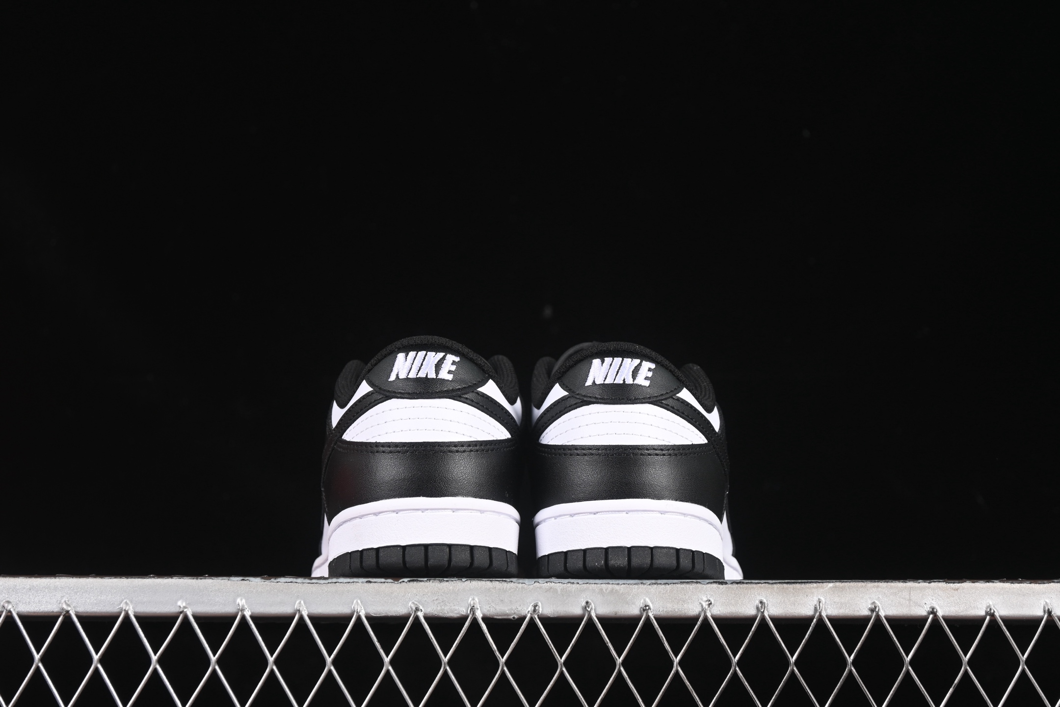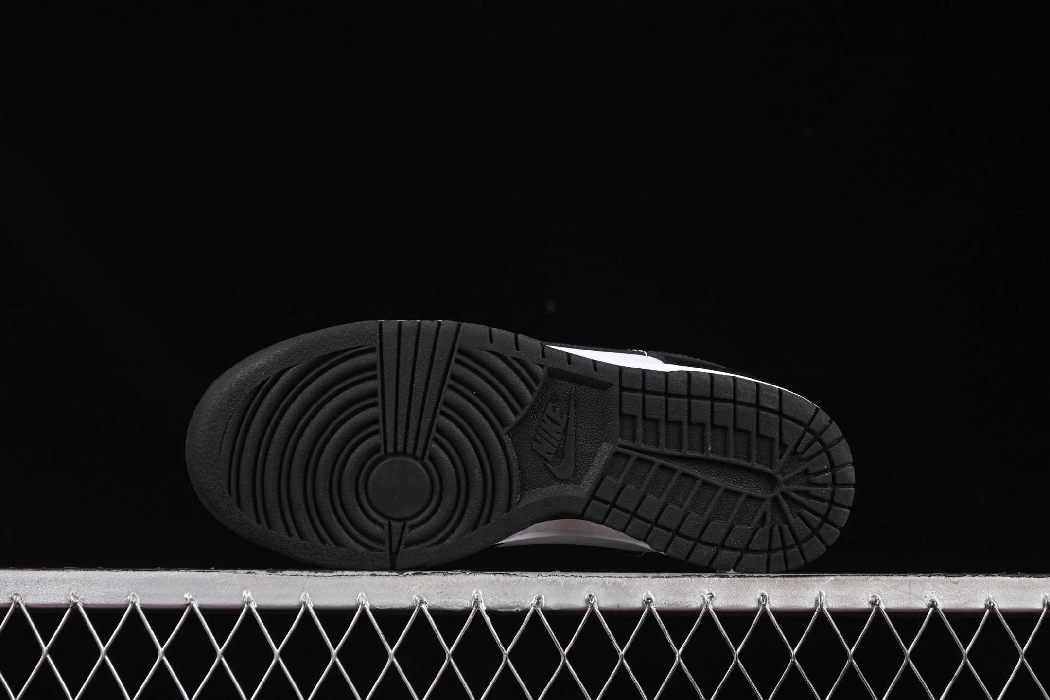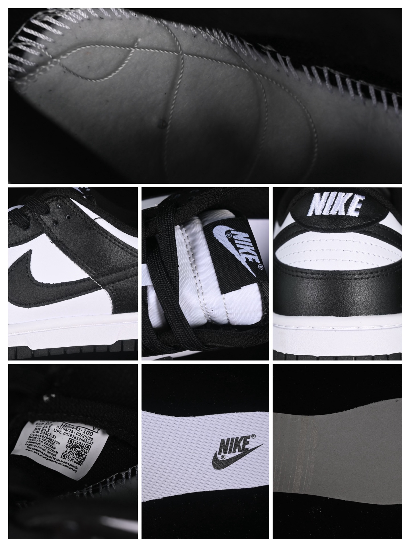 La tige de la chaussure est fabriquée en cuir de haute qualité, offrant à la fois durabilité et confort. Les empiècements noirs contrastent élégamment avec le fond blanc, créant un effet visuel saisissant qui rappelle le pelage distinctif du panda, d’où son surnom. Le logo emblématique de Nike, le Swoosh, est également en noir, se détachant nettement sur les côtés de la chaussure.