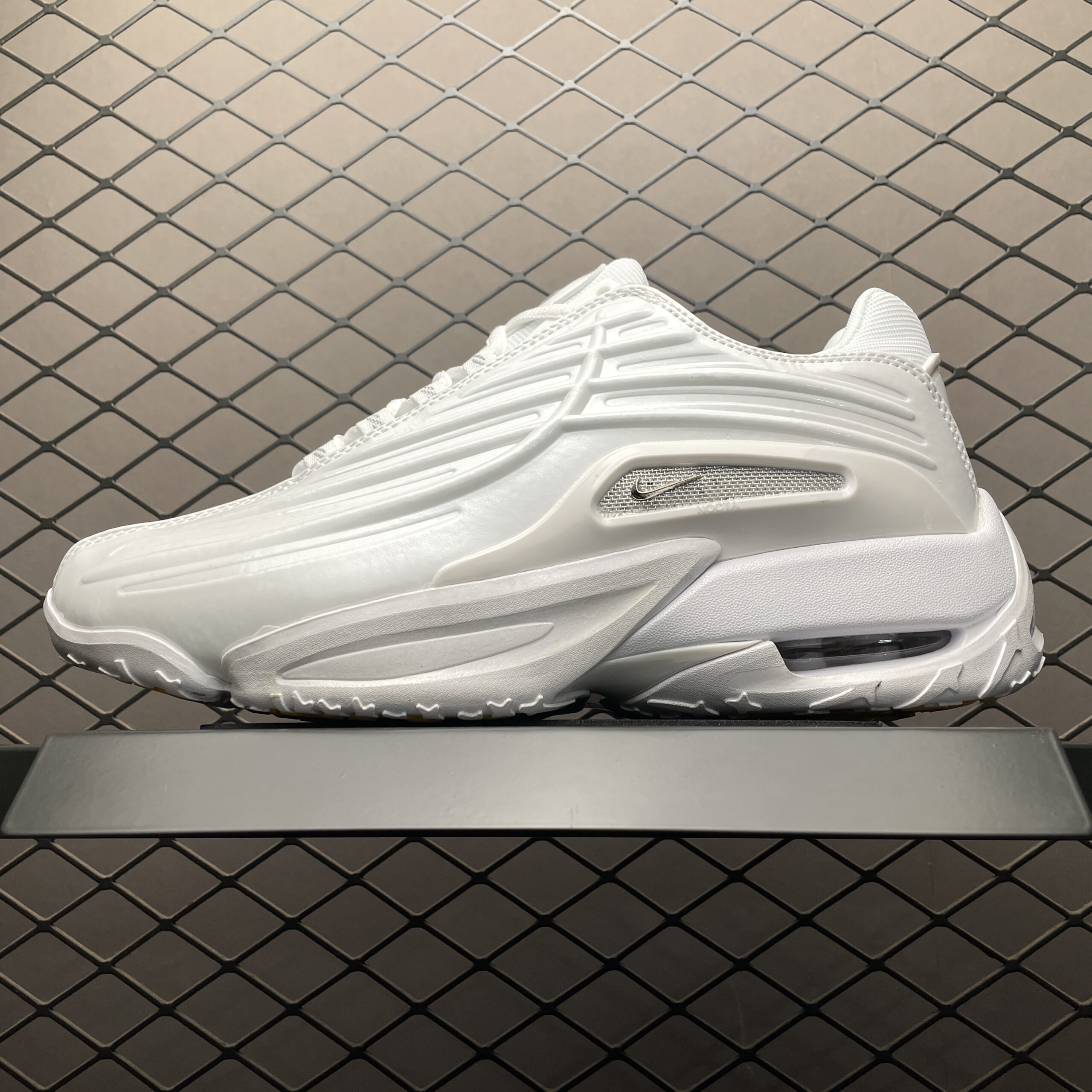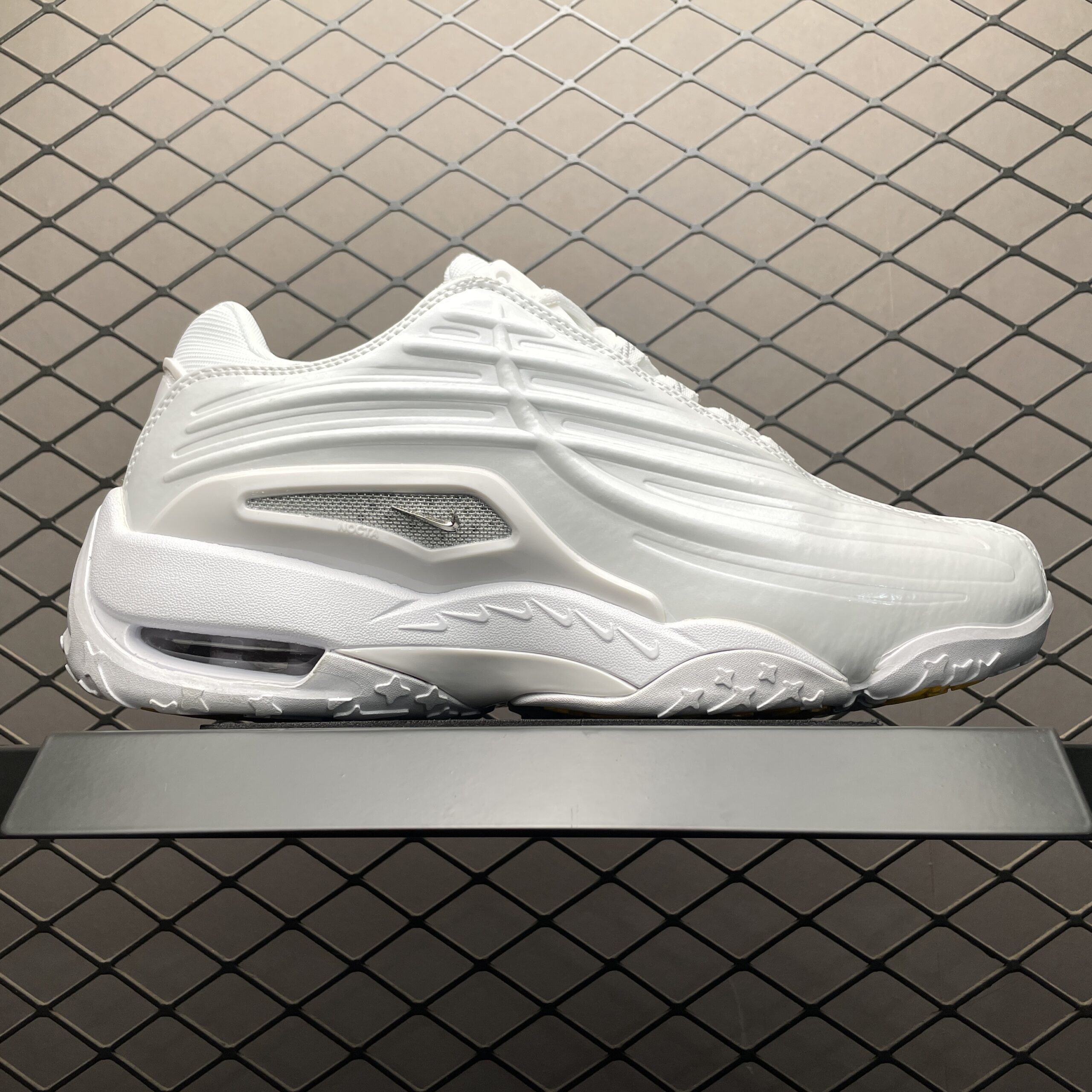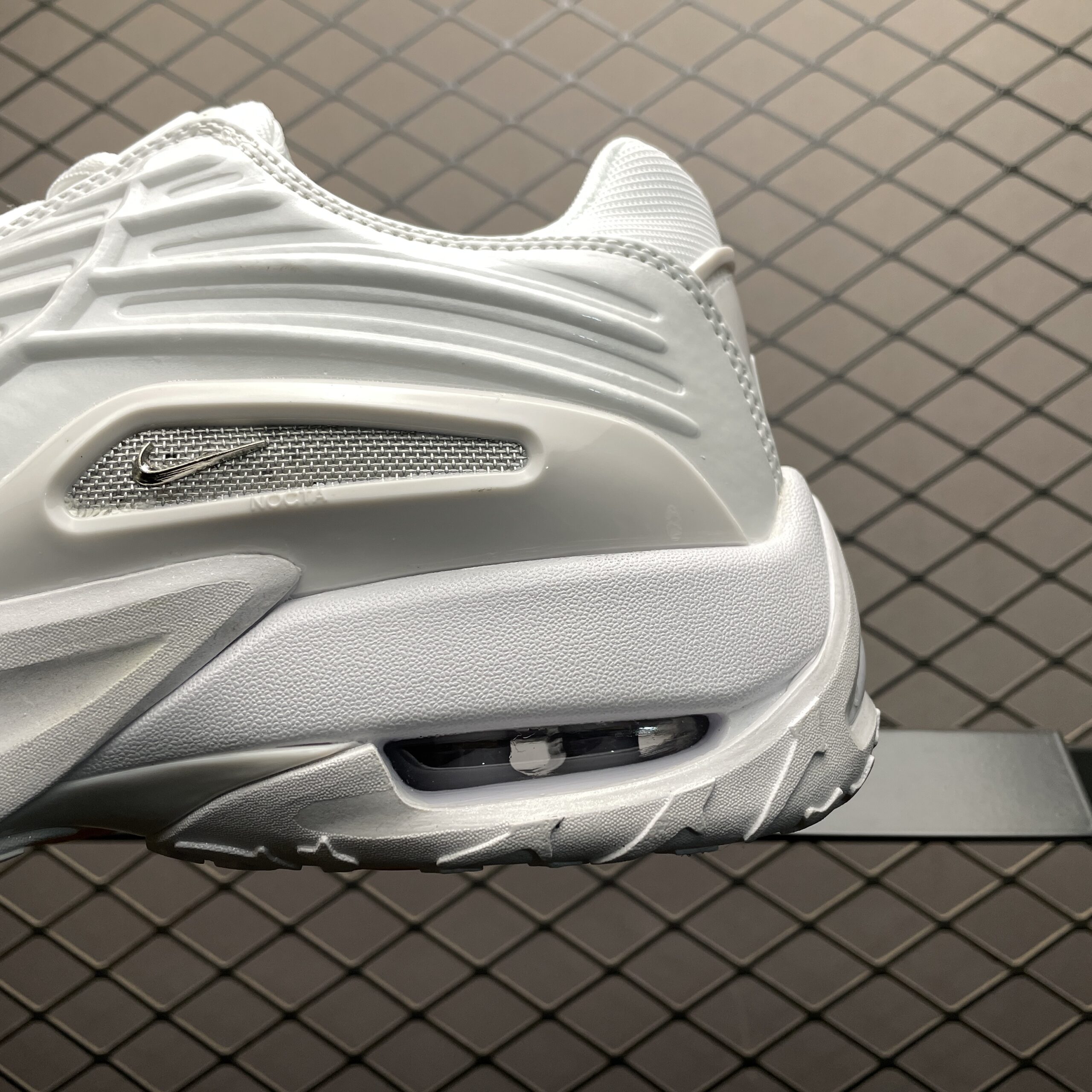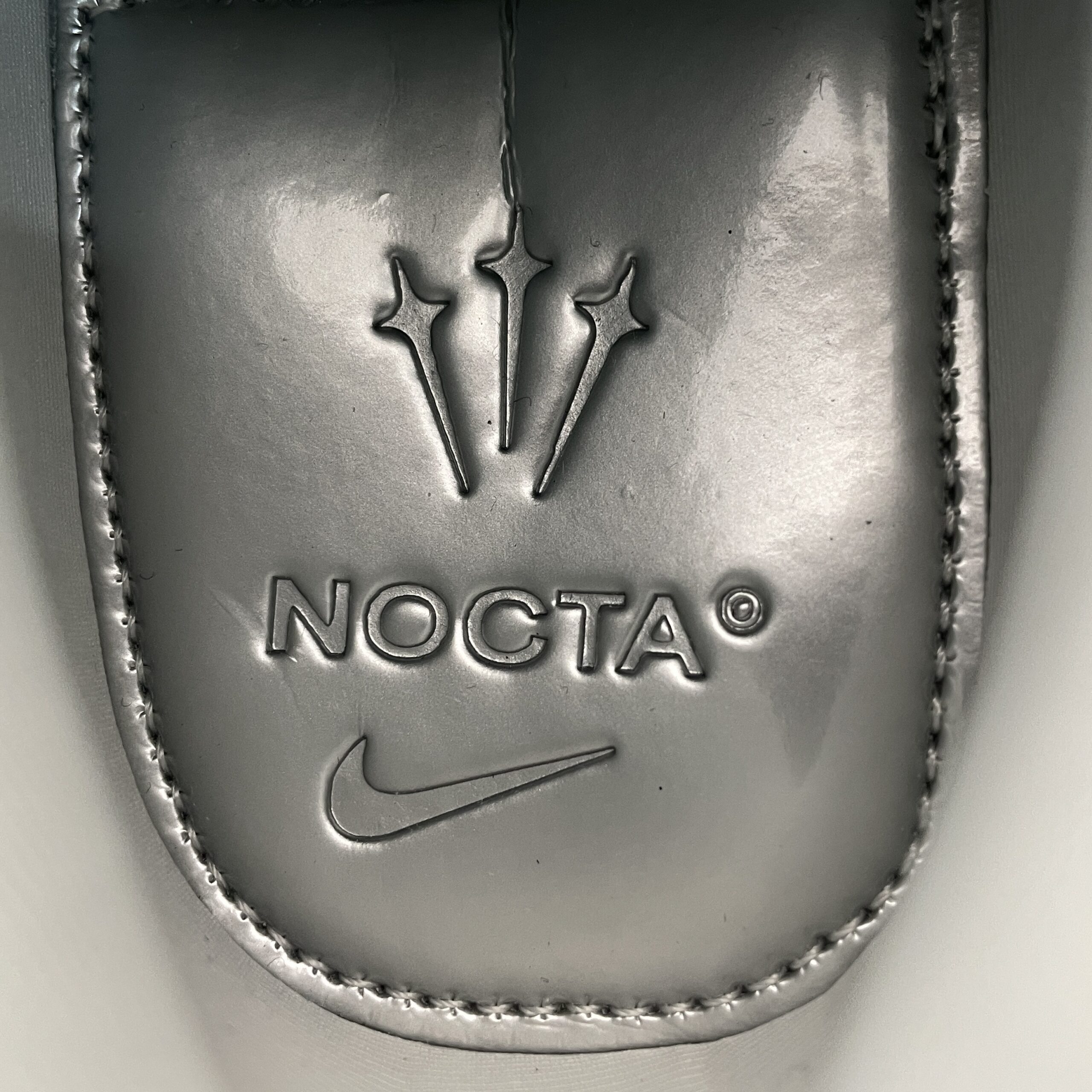 La tige de la chaussure est confectionnée en cuir de haute qualité, offrant à la fois durabilité et confort. Des perforations subtiles sont intégrées pour assurer une bonne respirabilité, tandis que des détails réfléchissants ajoutent une touche de modernité et de visibilité dans des conditions de faible luminosité. Le logo NOCTA, signature de la collaboration, est discrètement apposé, soulignant l’exclusivité du modèle.