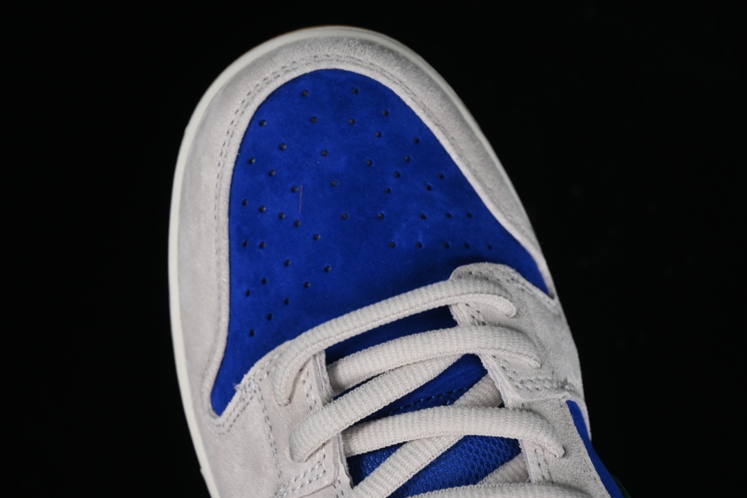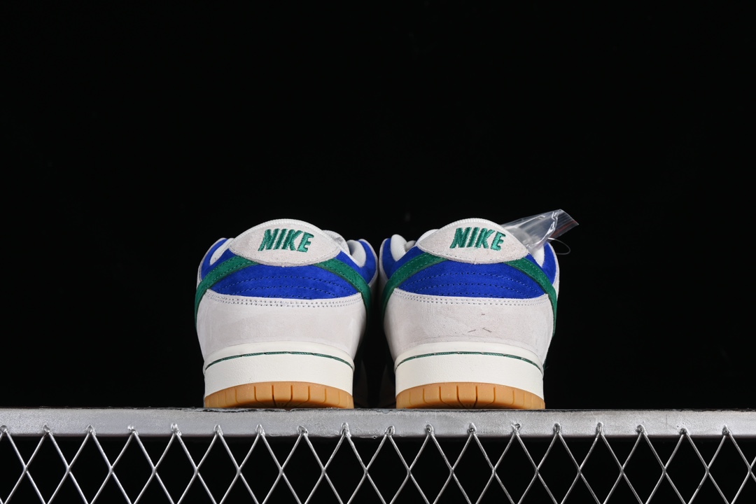 Le design inclut également le swoosh emblématique de Nike sur les côtés en couleur Malachite, contrastant efficacement avec le bleu de la tige. La languette est rembourrée pour un confort supplémentaire, et le logo Nike SB est brodé sur le dessus en blanc, ce qui ajoute un contraste visuel.
