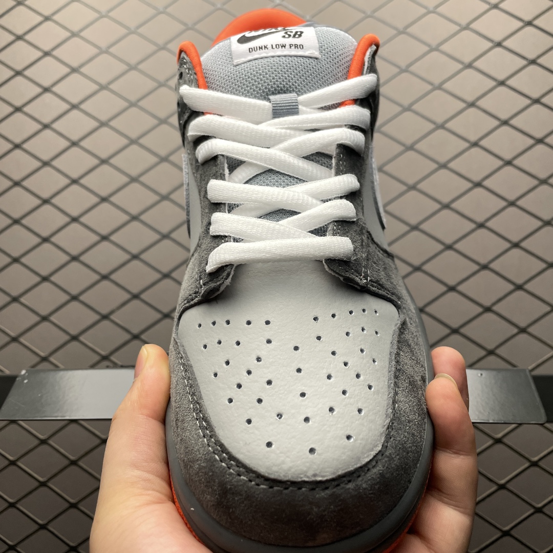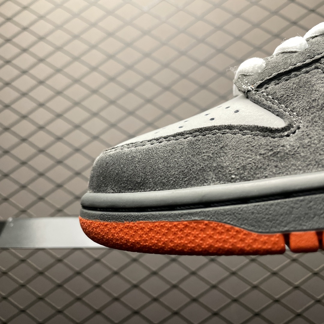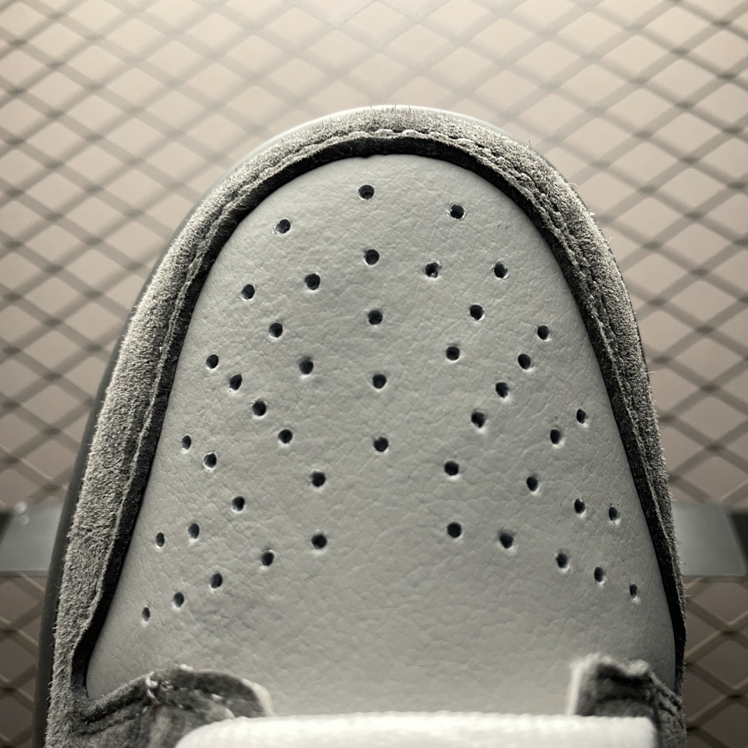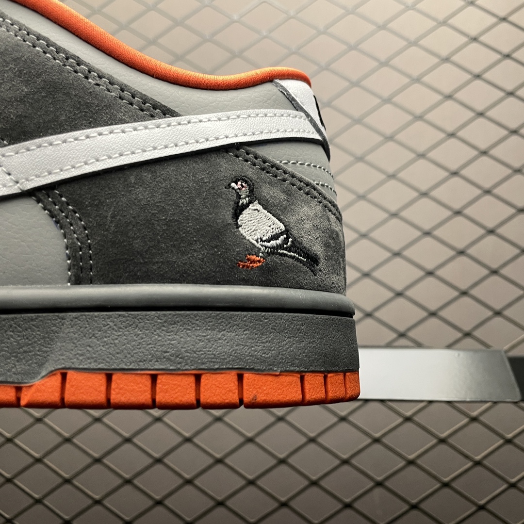 La chaussure présente une empeigne en daim de haute qualité dans des tons de gris et de noir, avec des accents de rose sur le logo Nike Swoosh et la languette. Le logo du pigeon est brodé sur le talon, ajoutant une touche distinctive à cette édition spéciale.