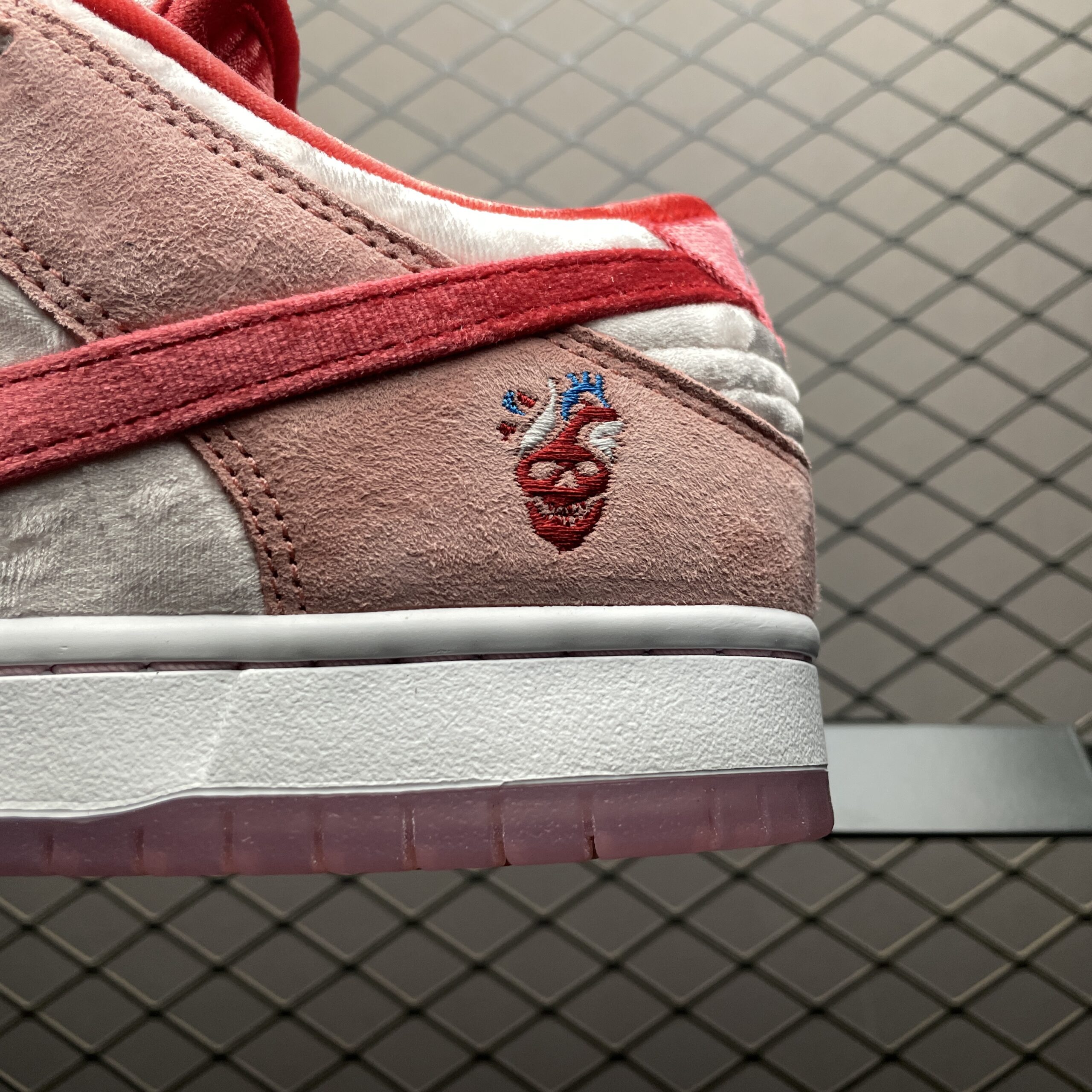 Ce modèle est également équipé d’une semelle extérieure en caoutchouc à motif gaufré, garantissant une excellente adhérence sur diverses surfaces. La construction de la chaussure intègre des éléments techniques tels que le système de fixation en lacets renforcé pour une meilleure stabilité et un maintien précis. La collaboration avec StrangeLove apporte une touche artistique distinctive, faisant de cette Nike SB Dunk Low un choix populaire aussi bien pour les skateurs que pour les collectionneurs de sneakers. Son design unique et ses caractéristiques techniques en font une pièce phare dans la gamme des chaussures de skate haut de gamme.