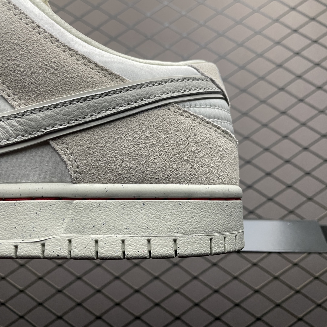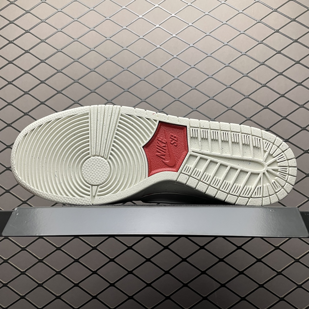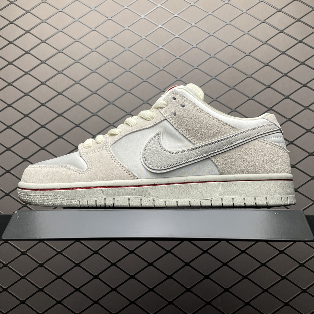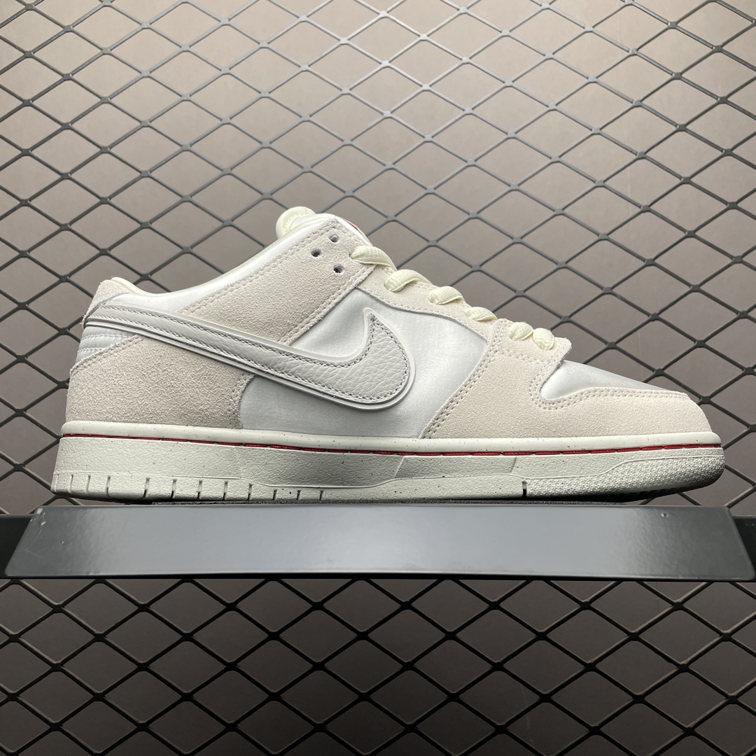 La chaussure présente une combinaison de couleurs audacieuse et accrocheuse, avec une base en cuir blanc immaculé et des accents rouges vifs. Le logo Nike SB est brodé en rouge sur le talon, ajoutant une touche de sophistication à l’ensemble. Les lacets blancs contrastent parfaitement avec le reste de la chaussure, créant un contraste visuel saisissant.